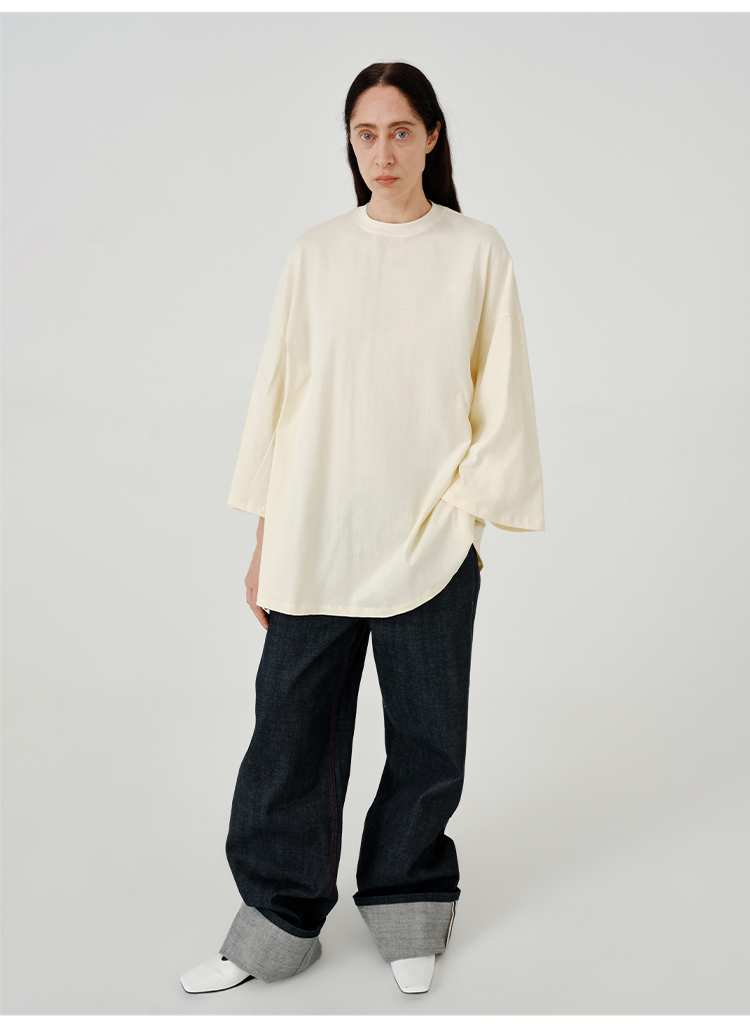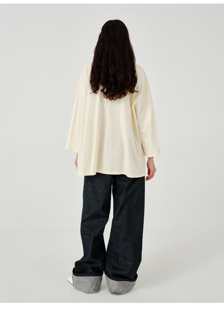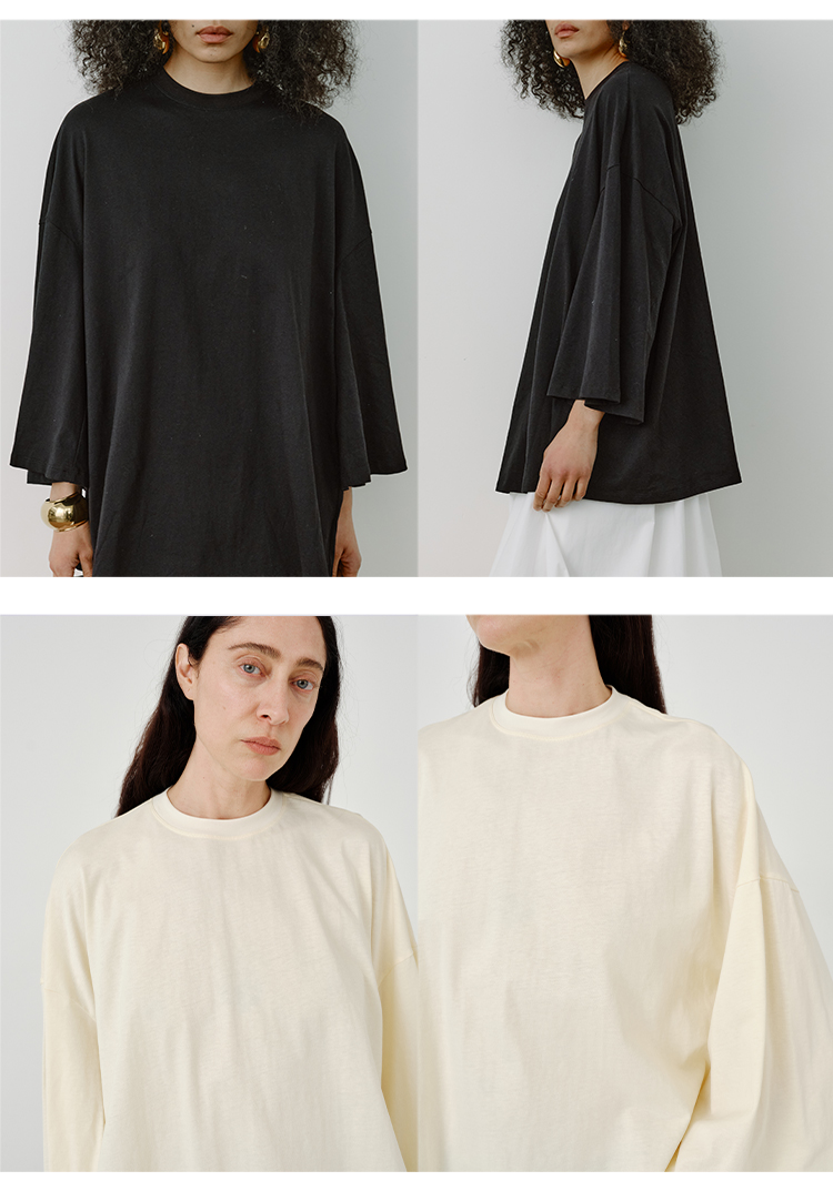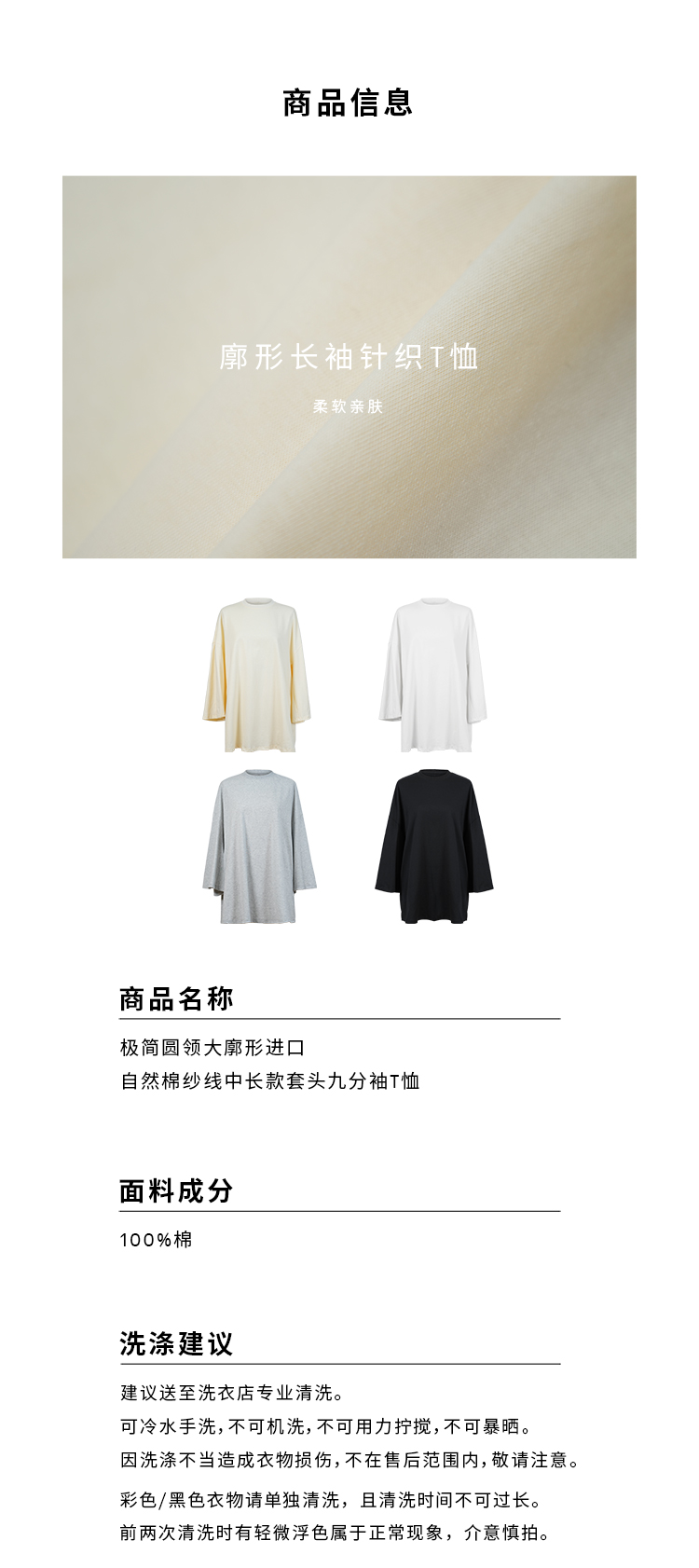 HIDEMI 极简圆领大廓形进口自然棉纱线中长款套头九分袖T恤 黑色/浅花灰/蛋奶米黄/自然白