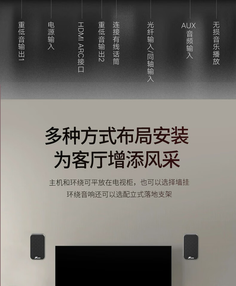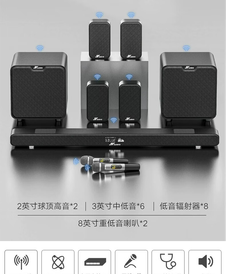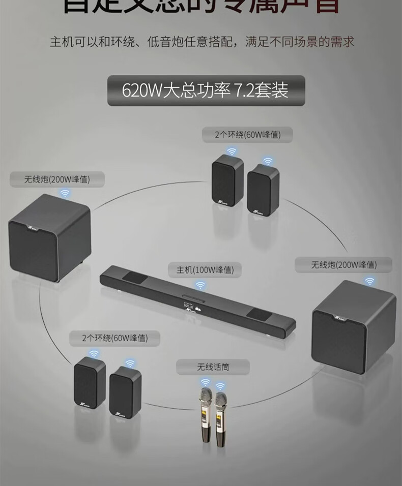 万音(JY AUDIO)A9pro回音壁音响电视外接音箱套装客厅3d环绕模拟5.1家庭影院柏林之声家用蓝牙可插U盘带麦克风 7.2影K版+点歌机