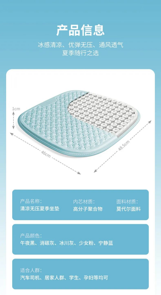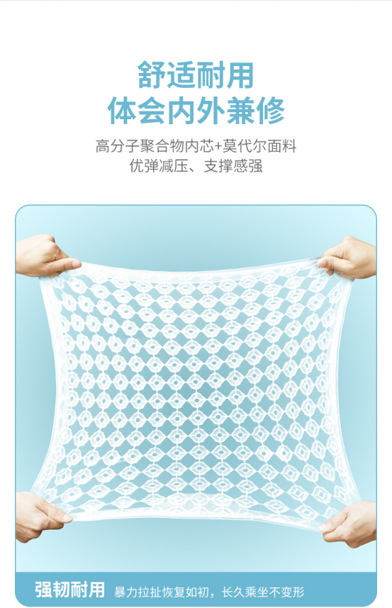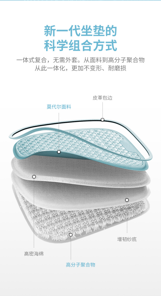 利用高分子聚合物材料制成的坐垫,相较于市面上以记忆棉、乳胶、硅胶、泡沫、凝胶等为材质的坐垫来说, 可以做到更强的弹性、延展性和耐磨性,使用寿命也更长。