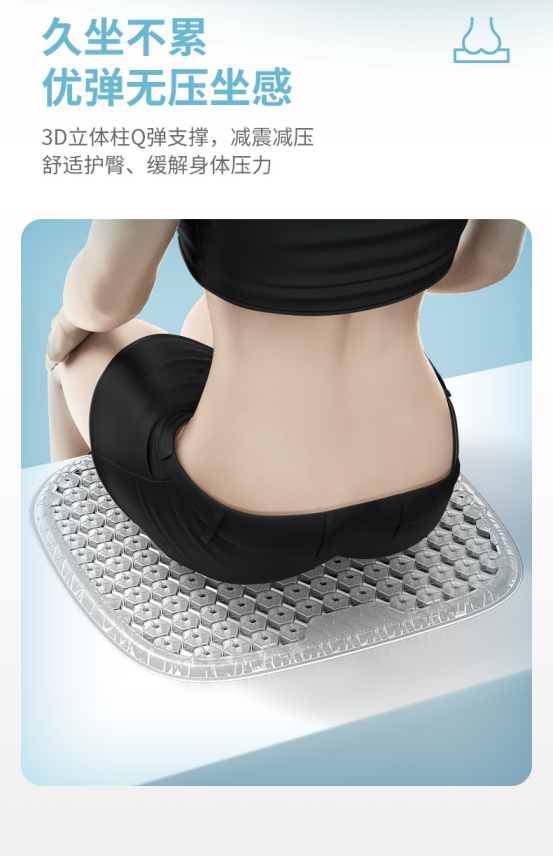相较于易变形又不散热的传统棉质坐垫,斯麦欧坐垫采用的是 3D 立体柱的透明设计。 挤压过程中,立体柱的中空设计,排列均匀的密集气孔,使得接触面积减少,有更多空间让空气通过,久坐也不会捂着闷着。 如果可以,我愿意坐在上面一整天。🤭