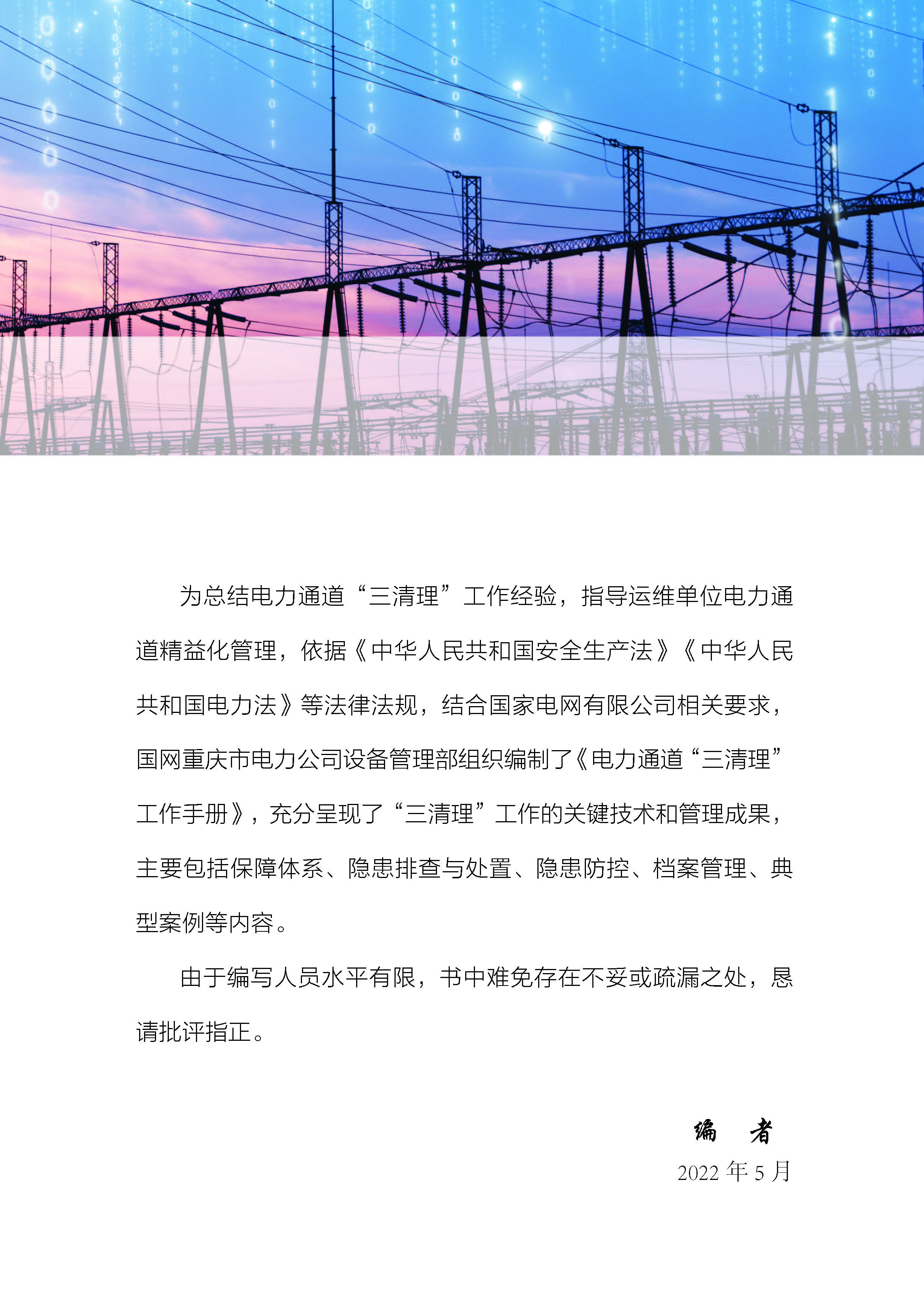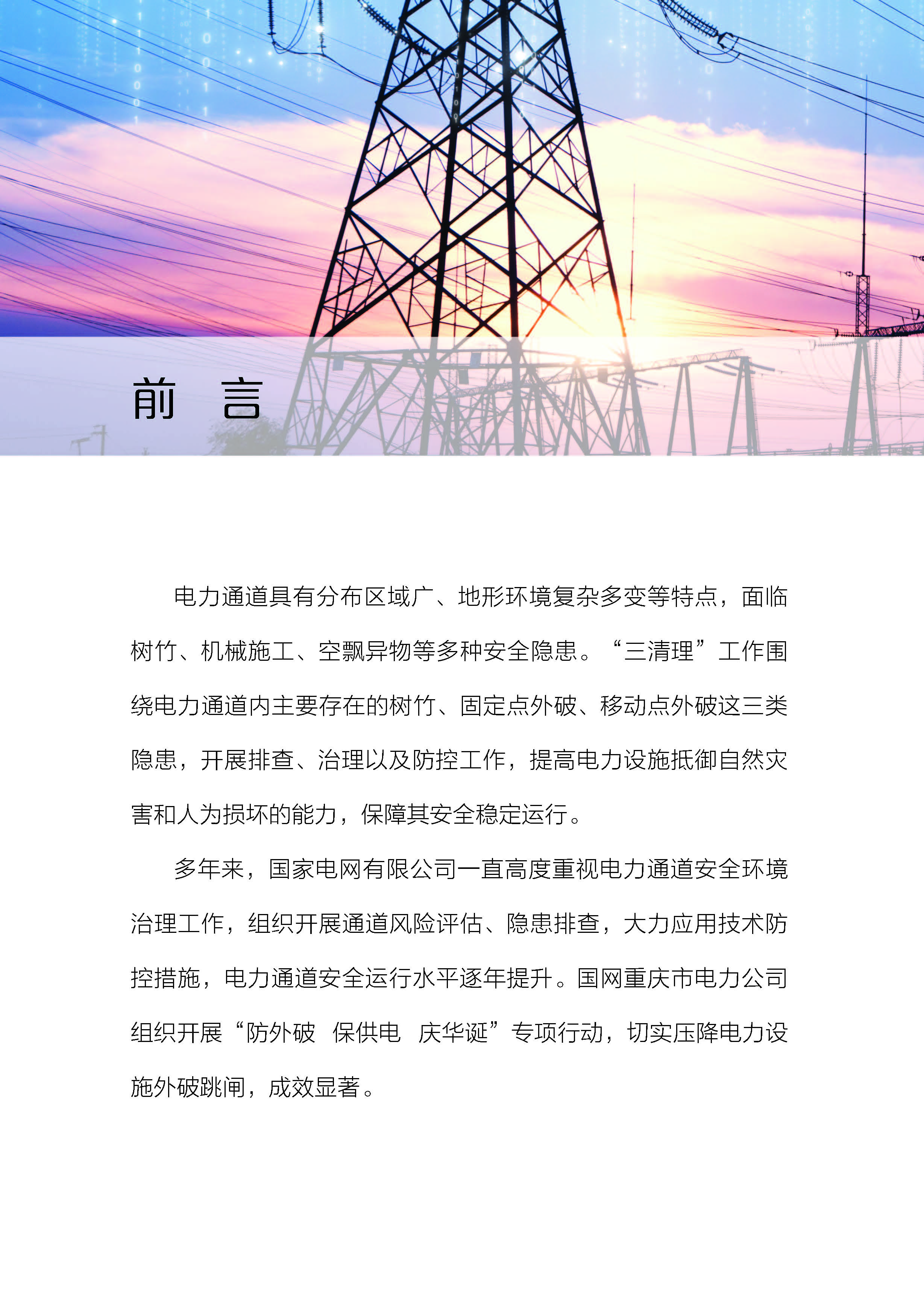 本书充分总结提炼2021年国网重庆电力“防外破、保供电、庆华诞”专项行动中电力通道“三清理”工作典型经验和管理成果,全面提升电力设施保护水平,有效压降电力线路外破跳闸,确保大电网安全运行和可靠供电。