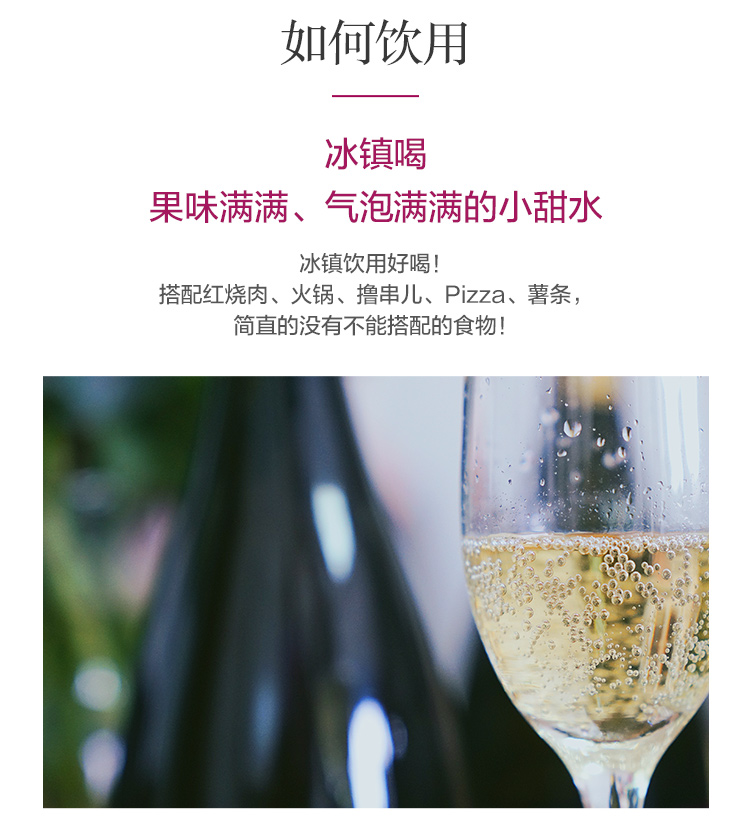 4.天然高起泡,一开瓶就能感受到扑鼻的水蜜桃香气,绵密起泡在口腔绽放,甜蜜口感刺激味蕾。