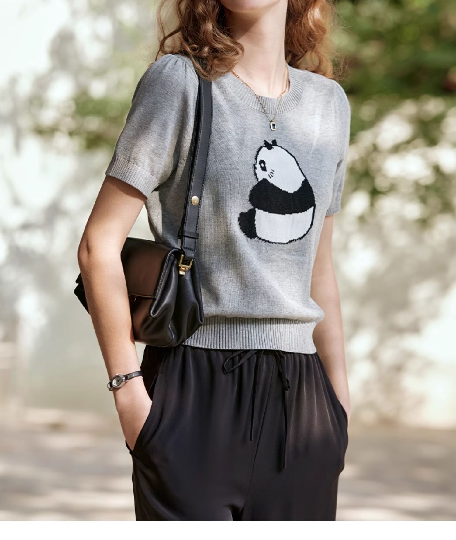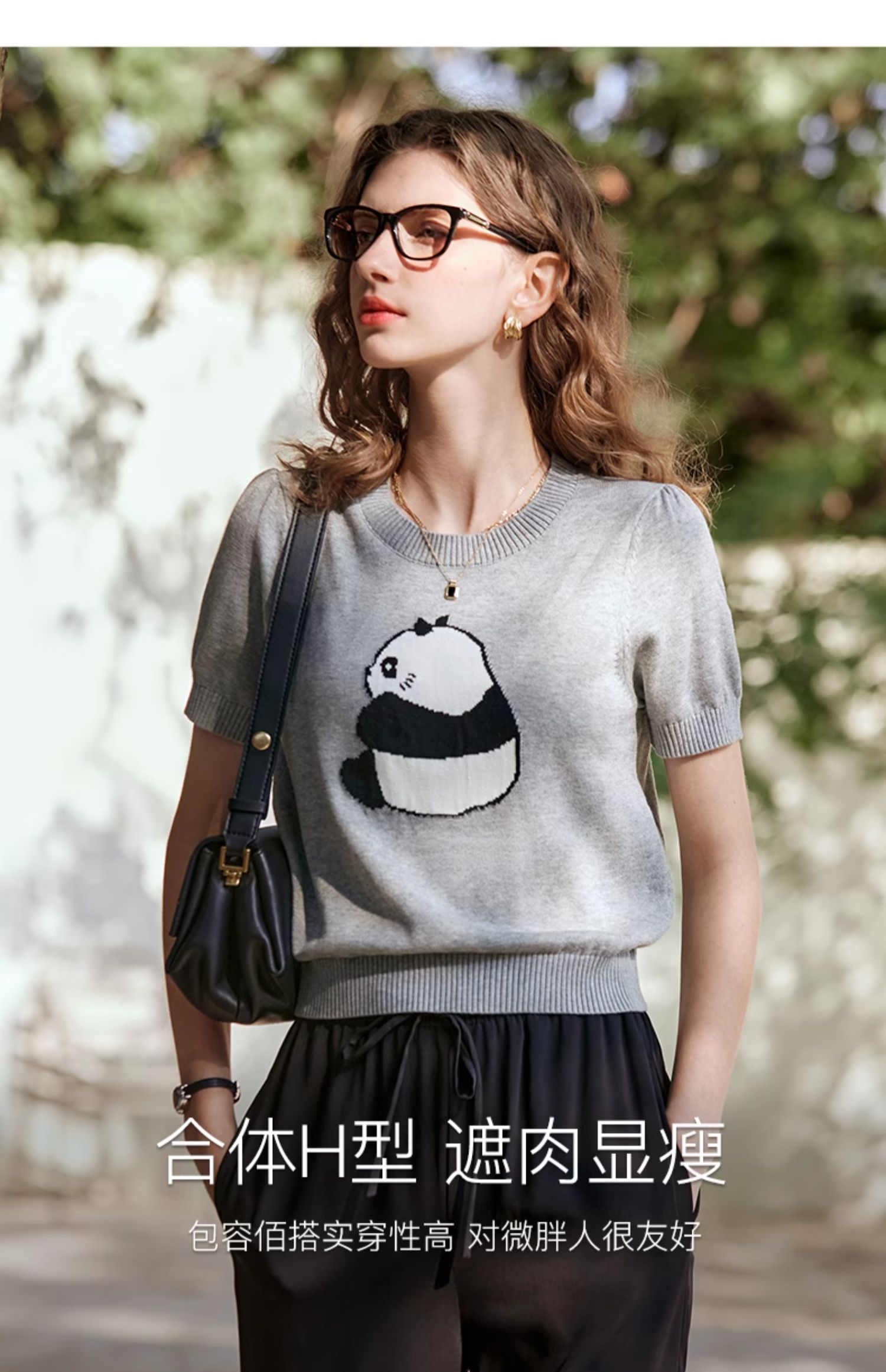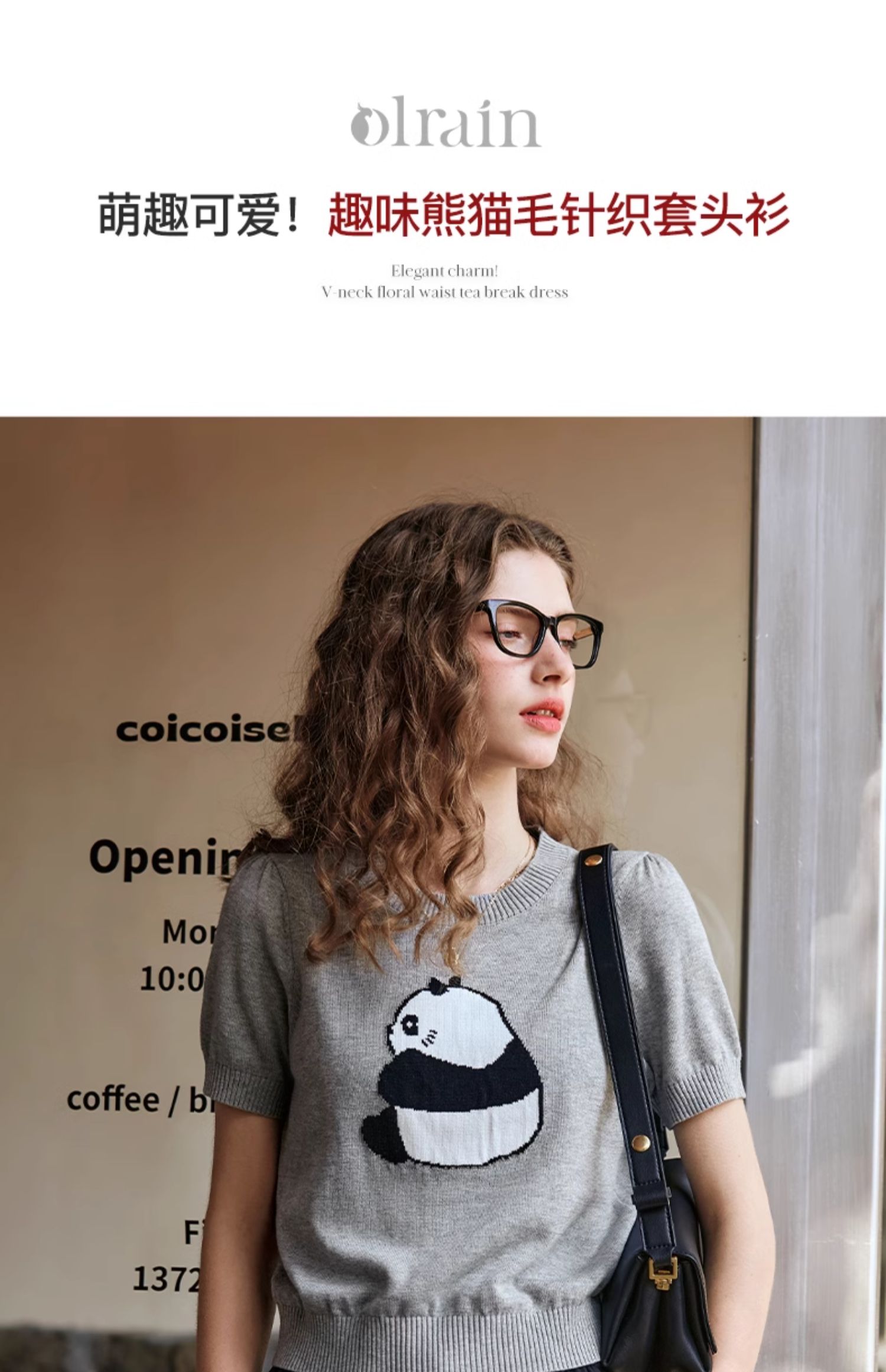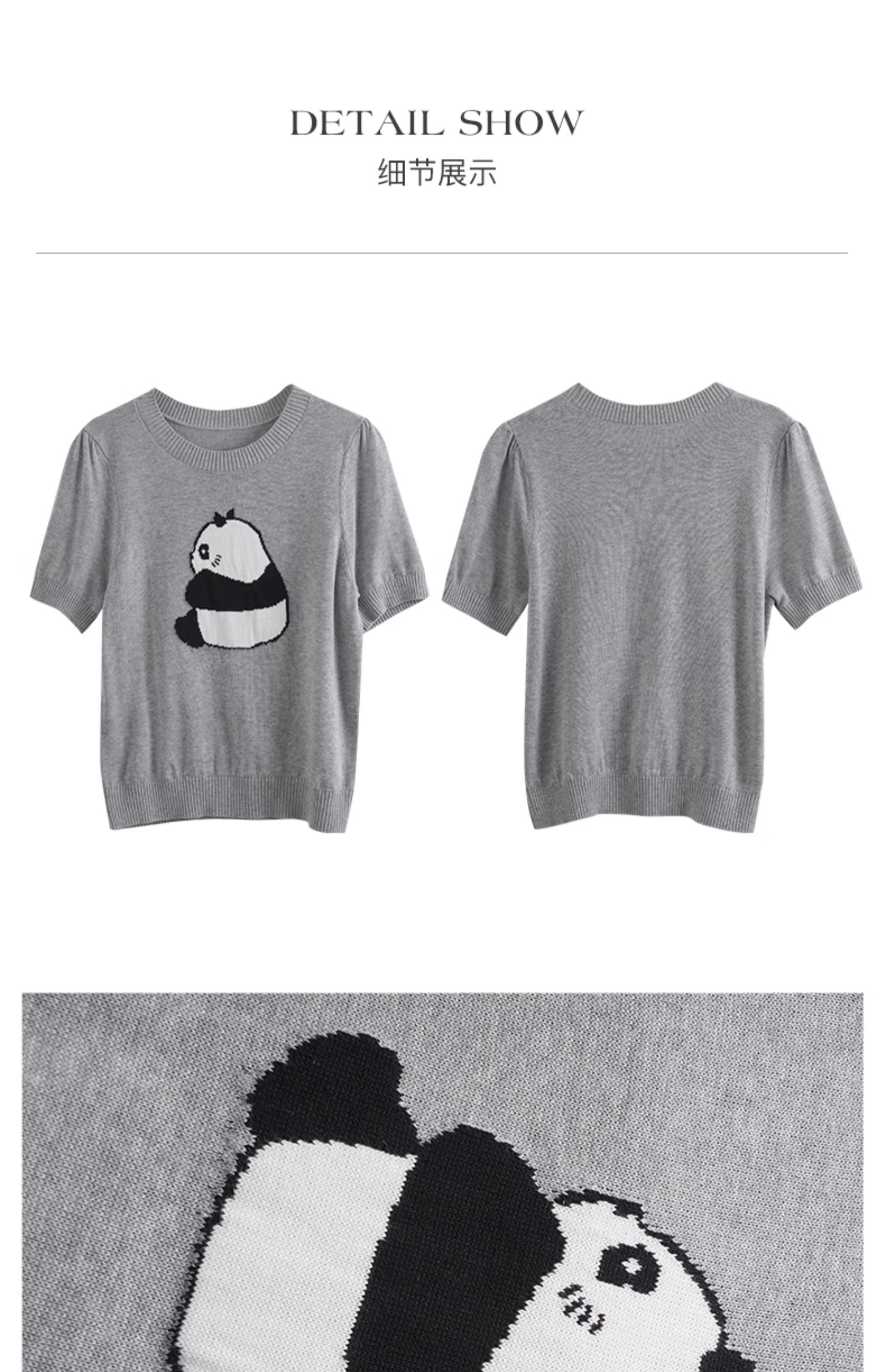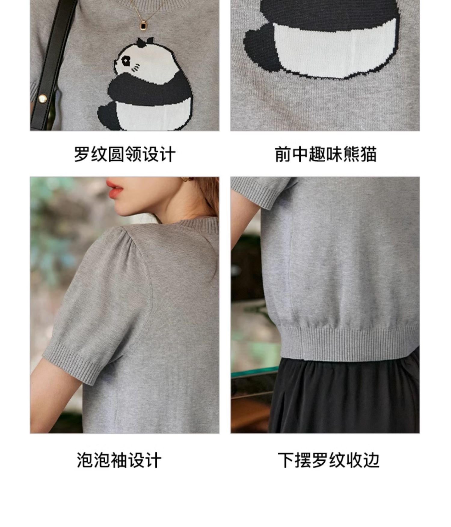 OLrain欧芮儿浅灰色针织衫女春夏2024年新款趣味熊猫短袖套头衫