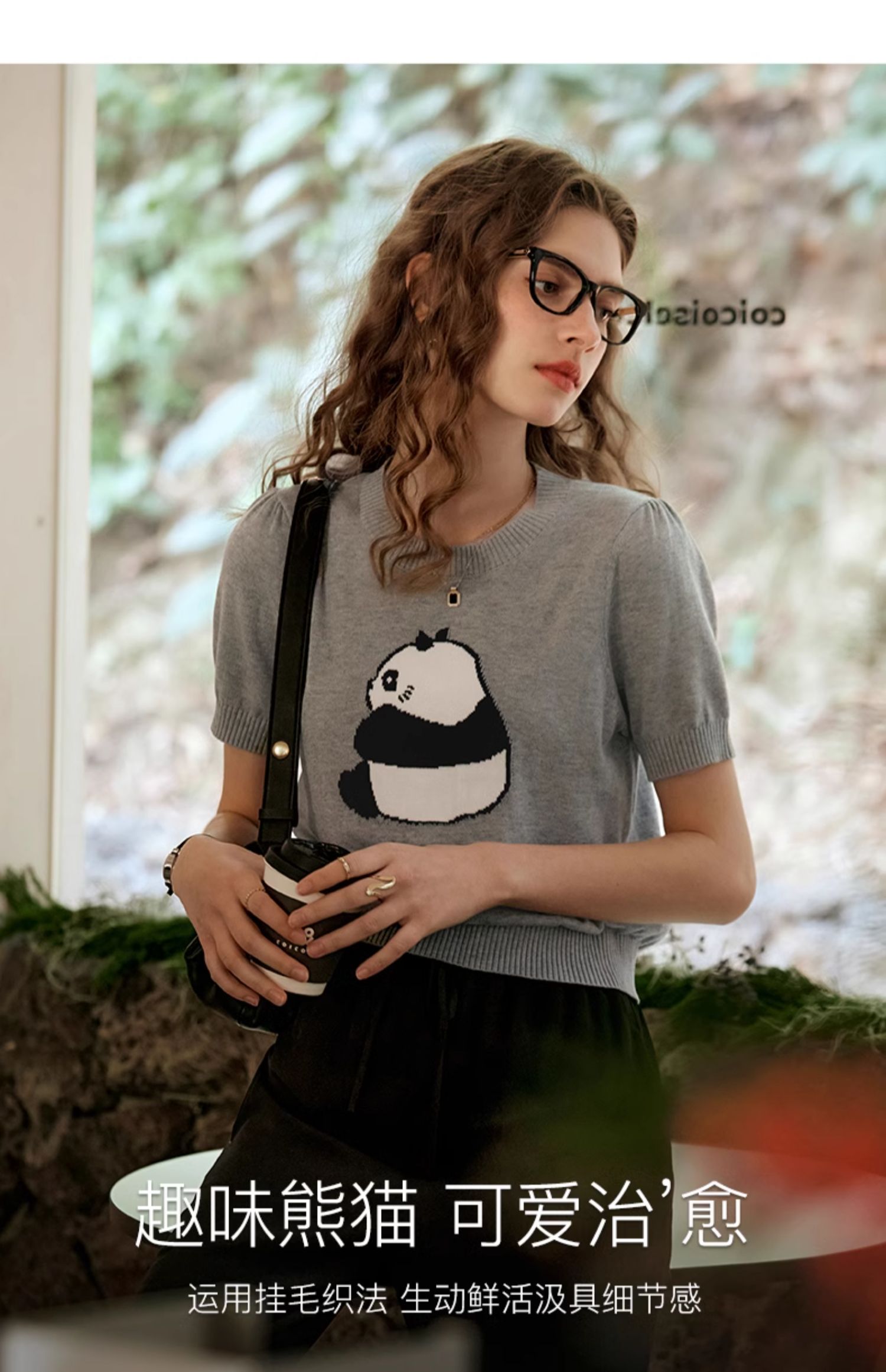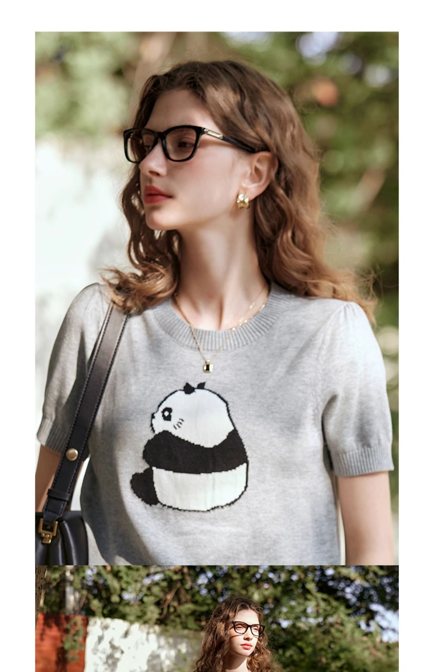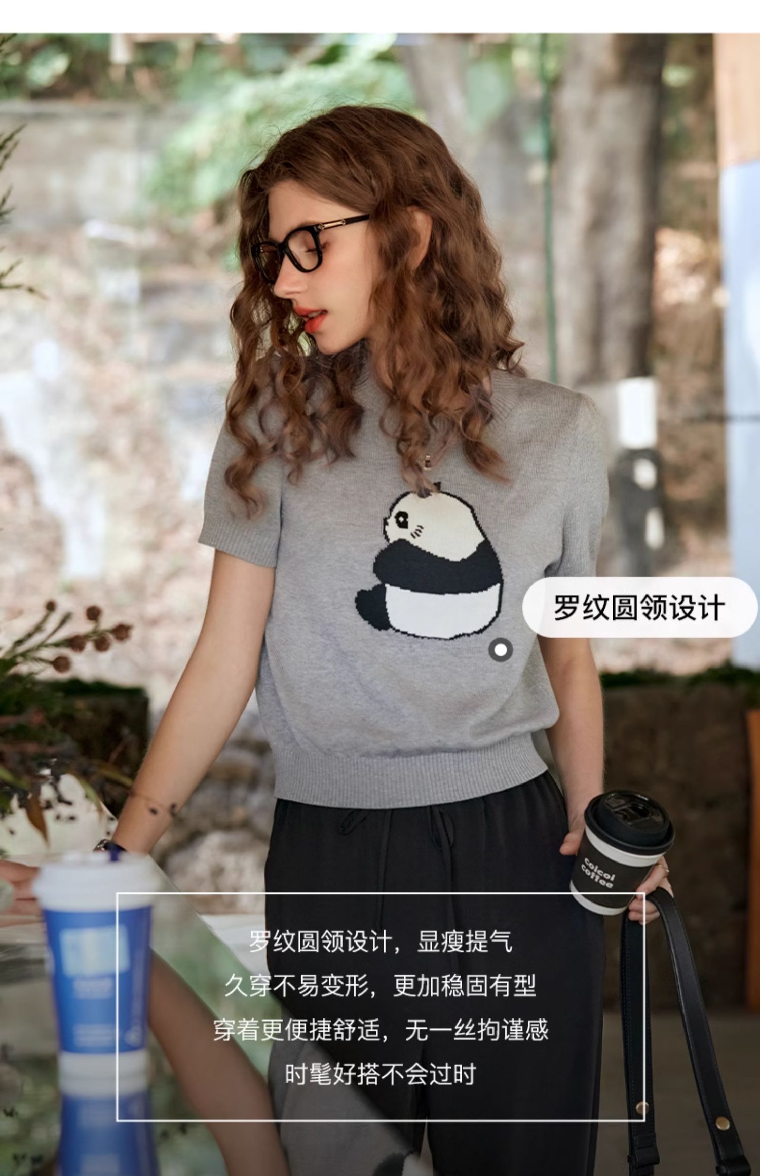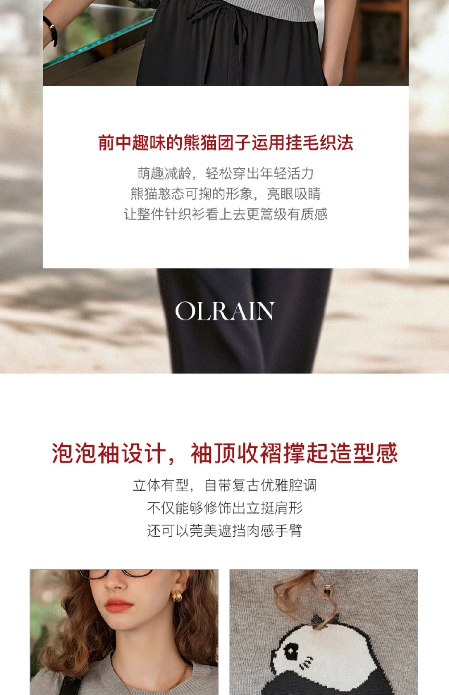 OLrain欧芮儿浅灰色针织衫女春夏2024年新款趣味熊猫短袖套头衫