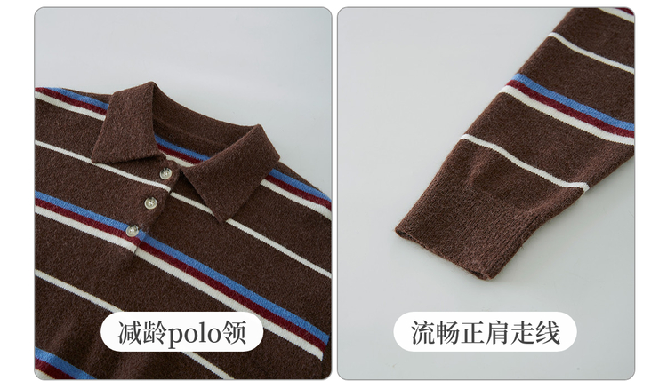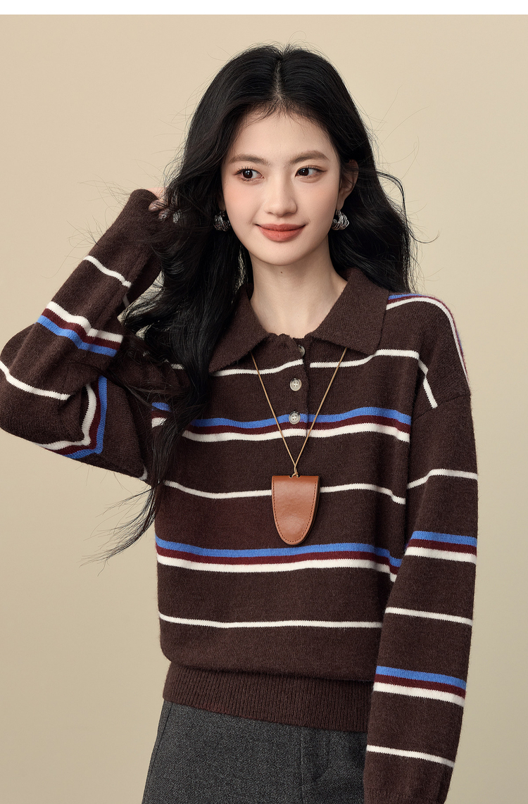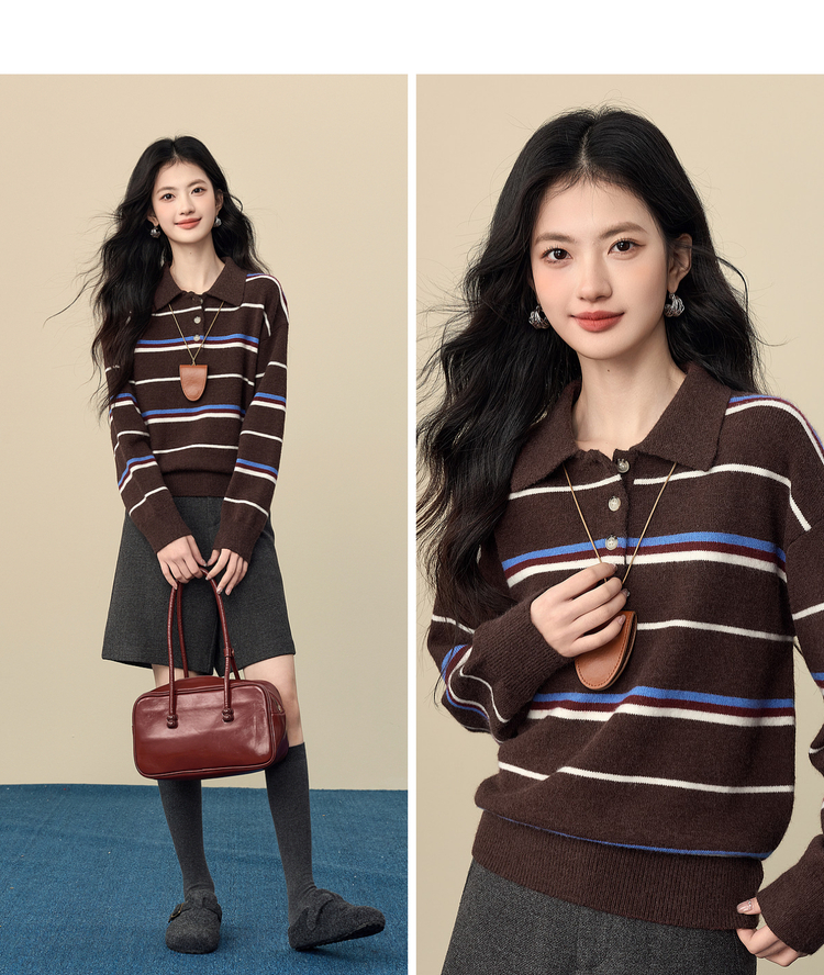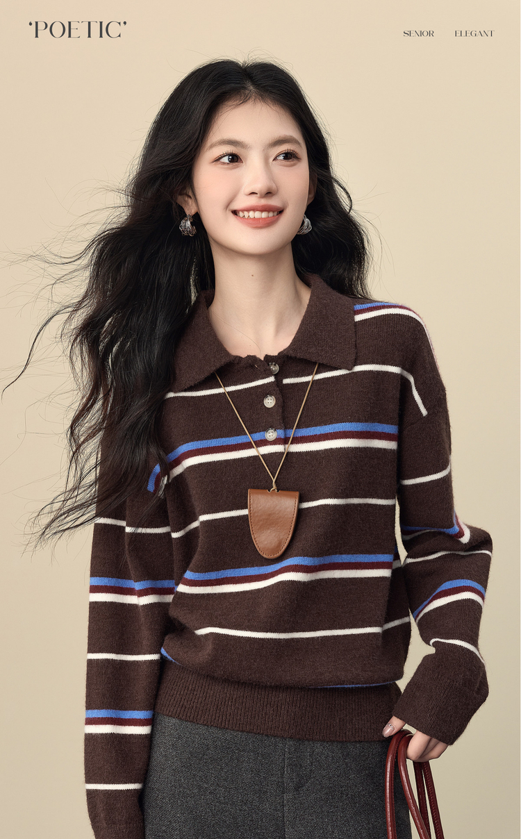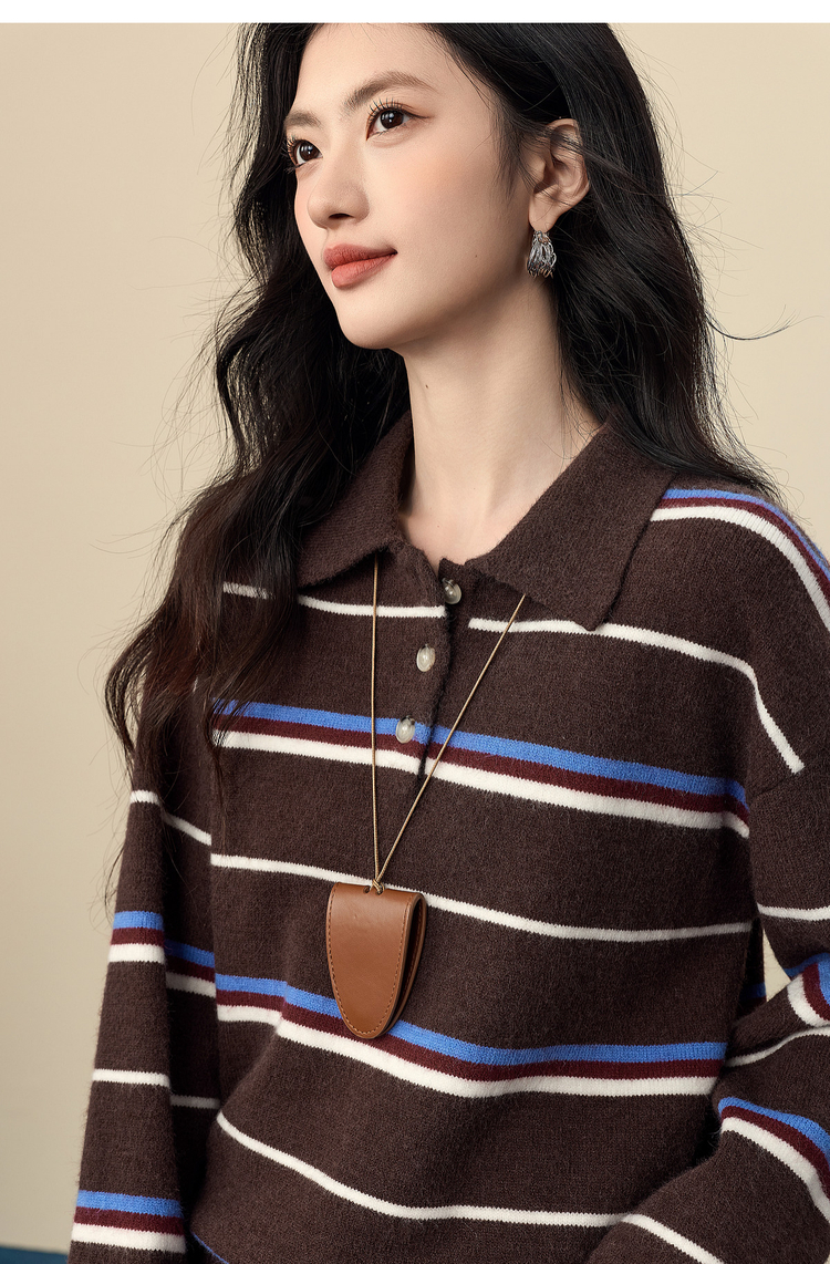【12/17新品】熙世界老钱风条纹POLO领毛衣女2025年秋冬新款宽松套头长袖针织衫