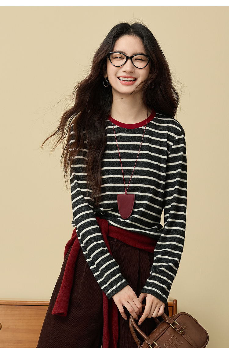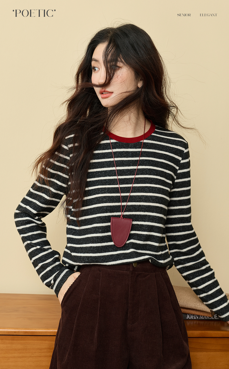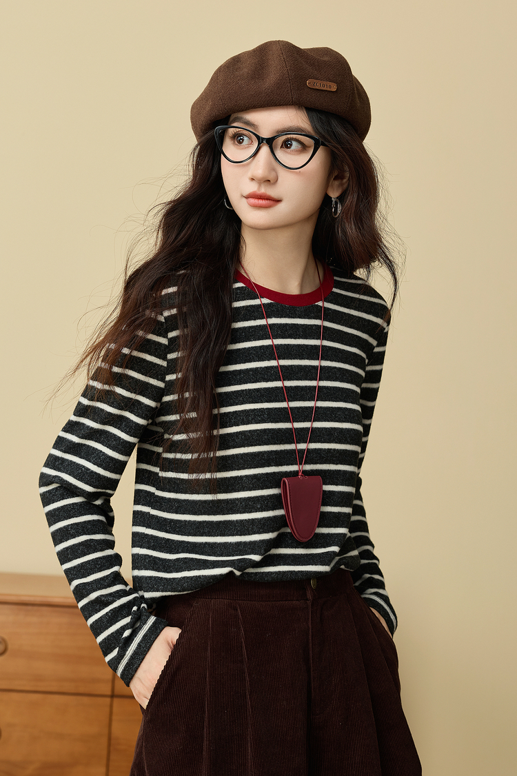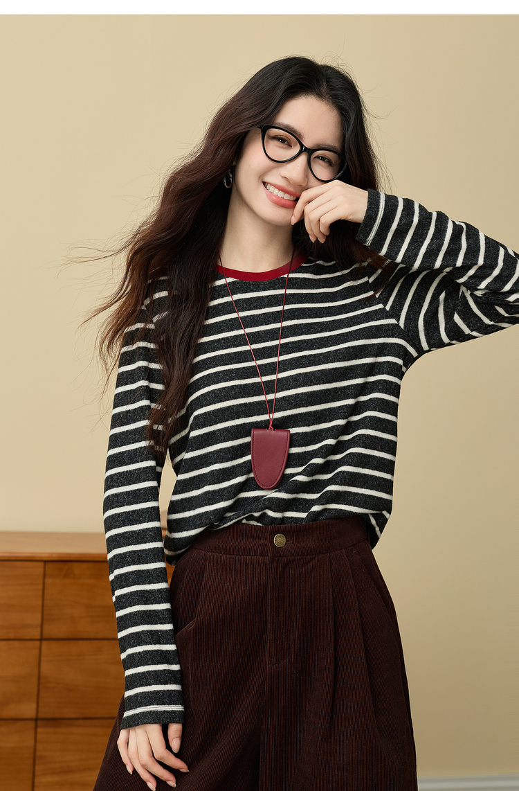 【12/03新品】熙世界航海系撞色条纹针织衫女2025秋冬新款长袖套头圆领绒感毛衣