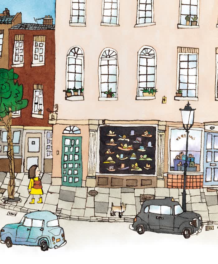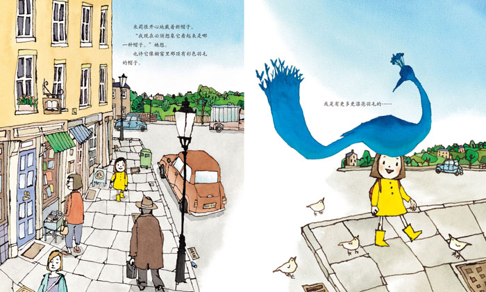 经过一家外文书店,看到橱窗里的米莉,戴着一顶缀满花朵的高帽子,开心地大步走着,俏皮的模样,仿佛在向我热情地招手,我忍不住进去翻了翻这本刚上架不久的绘本。价格如此高档的外文书,我拿起又放下,拿起又放下,好像在数花瓣,“要”或“不要”买呢?