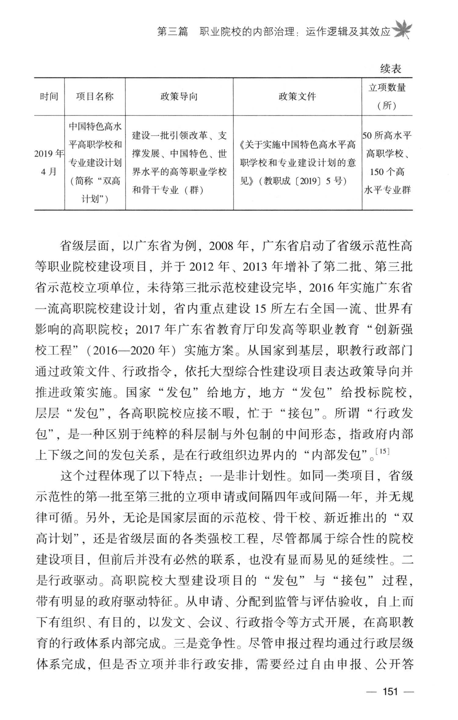 源于工作实践的真切感知和博士阶段公共管理学科的专业训练,我本能地将政府行为研究的理论框架、分析概念应用到职业教育的治理研究中。毕竟,职业教育本质上是准公共产品,是服务和支撑区域经济发展的教育产品,“如何提供‘好的职业教育产品’”是公共管理领域的研究议题。出于研究领域、研究可行性,我选择了在这一阶段主要用公共管理理念解读职业教育治理的研究路径。实际上,这种研究取向也并非特例。在对近年来职业教育研究文献进行梳理后发现,“协同治理”“多元治理”“项目治国”“文件治国”“运动式治理”等公共管理领域耳熟能详的理论、分析概念在职业教育研究领域频频出现。这也坚定了我对这一阶段的研究取向。尤其是用这样的思路申报2018年教育部人文社会科学研究青年基金项目并获得立项后,我更加肯定了这一选择。