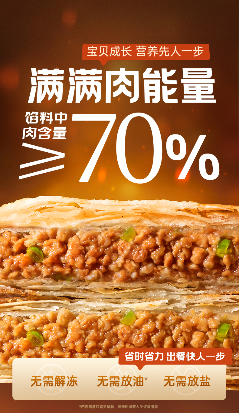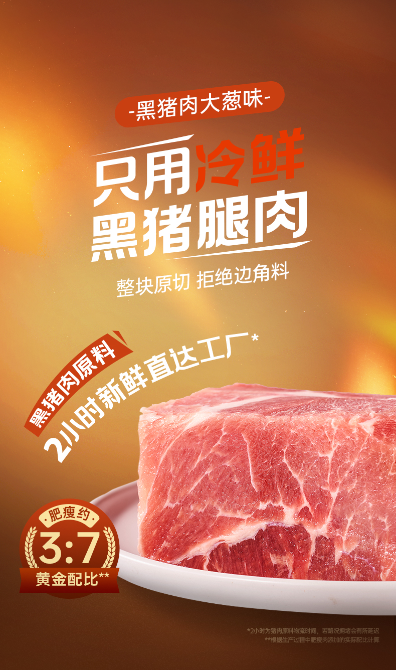 精选冷鲜黑猪前腿肉,肥瘦3:7的黄金配比,搭配上浓郁的大葱,葱香与肉香相互交融 ,每一口都是满满的醇厚滋味,馅料肉含量≥70%;