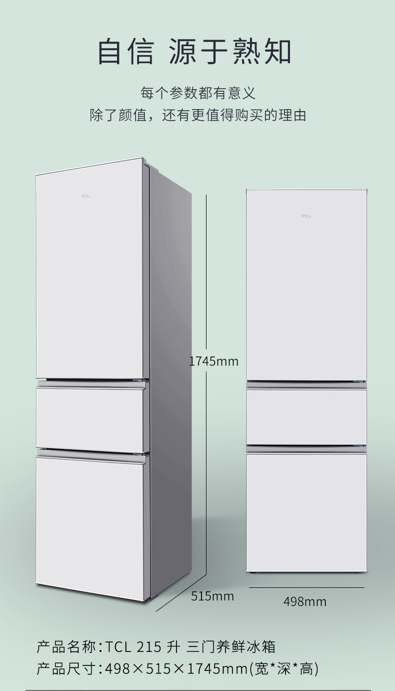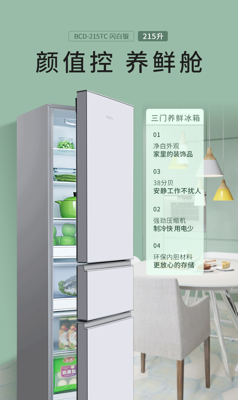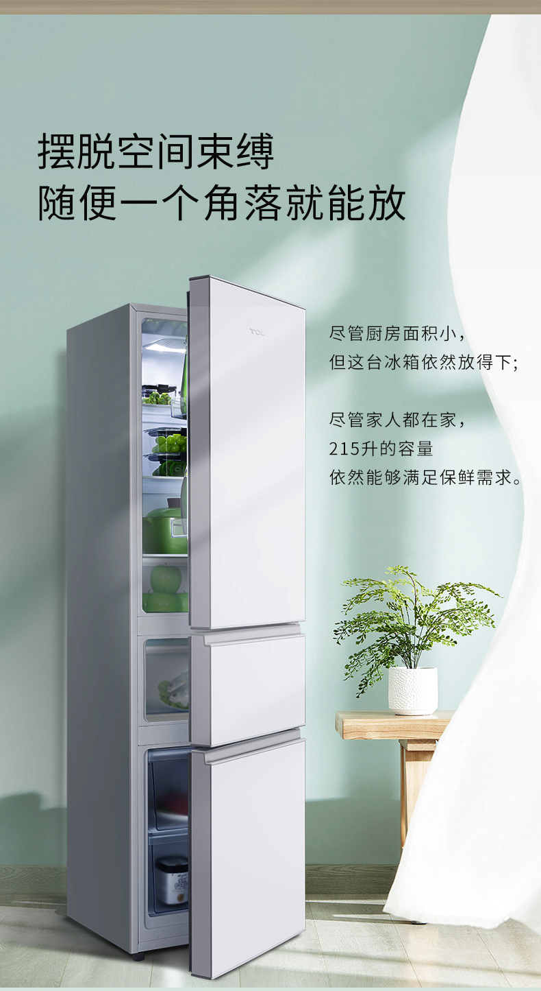 TCL 215升三门电冰箱 中门宽幅变温 快速制冷 节能环保小冰箱 BCD-215TC闪白银(偏远地区不发货)