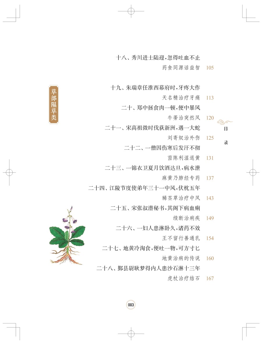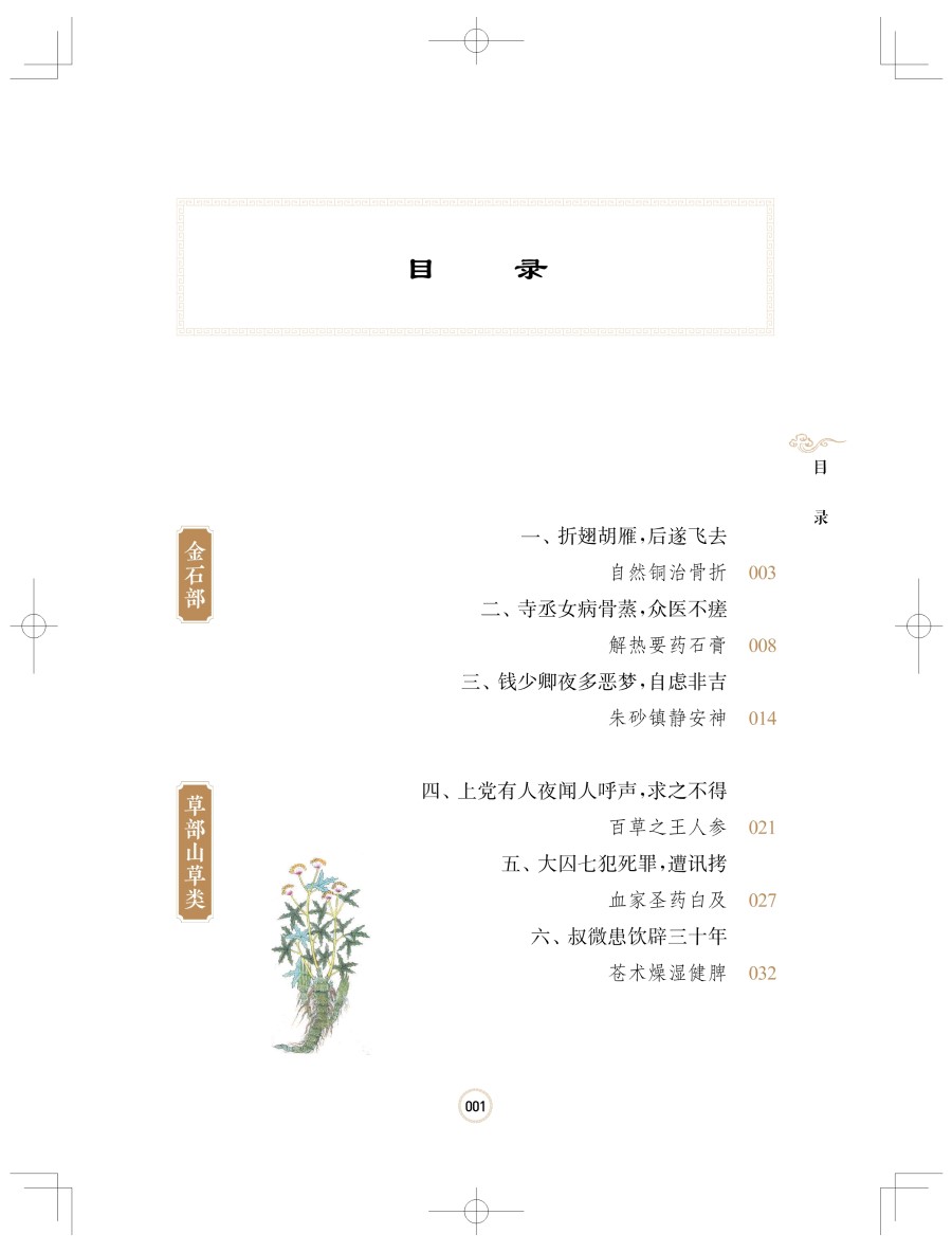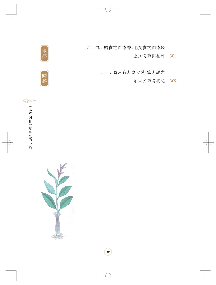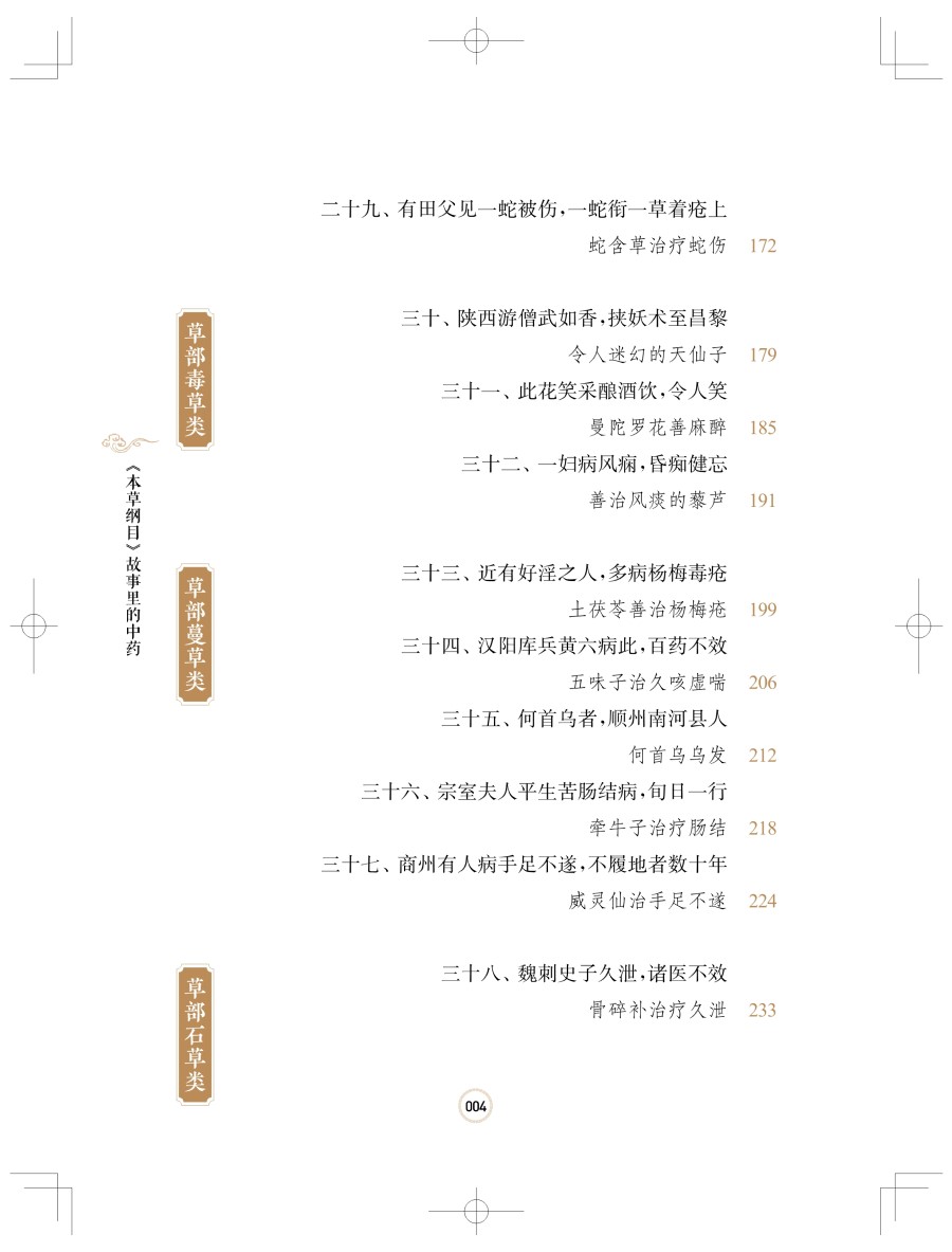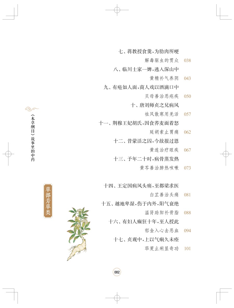 中医药学是中华民族优秀传统文化的重要组成部分和典型代表,几千年来为中华民族的生息繁衍和人类的健康事业作出了重要的贡献,党的十八大以来以习近平同志为核心的党中央高度重视中医药工作,习近平总书记多次对中医药工作作出重要指示:中医药学包含着中华民族几千年的健康养生理念及其实践经验,是中华文明的一个瑰宝,凝聚着中国人民和中华民族的博大智慧;要遵循中医药发展规律,传承精华,守正创新,加快推进中医药现代化、产业化……的确,中医药在我国古代人民长期防治疾病的实践中独具特色,蕴藏着极其丰富的文化内涵,并深深地扎根于中华民族的民众心中。这一点从历代的中医药专著(本草医籍)中就能体现,而《本草纲目》则是这些中医药著作中最具代表性的。为什么要研究《本草纲目》《本草纲目》是十六世纪我国伟大医药家李时珍以非凡的毅力、超人的智慧和刻苦精神,历时二十七年完成的巨著。这部巨著系统而全面地总结了明代以前我国劳动人民治病用药的经验,《本草纲目》内容之丰富,规模之宏大,形式之完美,都达到了那个时代的最高水平,至今依然指导着中医药的临床实践,被世人视为“经典”,被誉为“东方医药巨典""中国古代的百科全书”。《本草纲目》自问世后,先后被翻译成日、朝、英、法、德、俄、拉丁等多种语言文字,至今在国内外已有200多次翻刻。二十世纪八十年代以来,我国中医药界出现了一股研究李时珍及《本草纲目》的热潮,研究涉及医药、植物学、动物学、矿物学等各个学科。其中虽也不乏对李时珍学术思想和《本草纲目》文学性、人文性的研究,但研究不够全面系统,且又零散无序,这无疑是一个缺陷。近年来,随着健康观念和医学模式的转变,中医药在防治常见病、多发病、慢性病及重大疾病中的疗效和作用日益得到国际社会的认可和接受。普通民众迫切需要更深入、更广泛地了解中医药知识,因此我们将《本草纲目》等古籍中收载的药物故事系统挖掘、整理并进行科普创作,融学术性、知识性、资料性、实用性、趣味性于一体,内容通俗易懂、形象生动、故事性强、深入浅出、雅俗共赏,不但使读者从中获得实用的中药知识,又能体会阅读的乐趣和高雅的艺术享受,既使读者了解中药的功能与应用,又能掌握中药的安全合理应用方法。这项工作是非常有意义的!李时珍精神:人民的就是世界的李时珍,字东璧,号濒湖山人,世称李濒湖,明代蕲州城(今湖北省蘄春县蘄州镇)人。生于正德十三年(1518年),卒于万历二十一年(1593年)。李时珍“岁历三十稔,书考八百余家,稿凡三易”,編著成划时代科学巨著《本草纲目》。明代文学家王世贞称李时珍为“真北斗以南一人”,四百多年前,王世贞所赞绝非虚言,可以说是恰如其分,毫不为过!李时珍在编写《本草纲目》过程中"渔猎群书,搜罗百氏,凡子史经传,声韵农圃,医卜星相,乐府诸家,稍有得处辄著有数言”,参考的古籍多达八百余种,数量范围之广令人惊叹!他深深扎根于广大人民群众之中,特别是他善于讲故事,更善于摘录前人的故事、传说、轶事及案例,将它们用优美流畅的文字描述出来。药中有文,文中有药,药寓于文,文寓于药,其味无穷,具有很强的趣味性和知识性。所以说,《本草纲目》是一部药物学专著,同时也是一本文学性、趣味性很强的科普著作。这就是《本草纲目》这部传世大作在古今中外备受欢迎的主要原因之一。李时珍的一生在中国五千年历史文化长河之中,虽然只是短暂的一瞬,但是李时珍的精神和伟大科学著作《本草纲目》对人类的贡献,犹如郭沫若先生所说:“造福生民,使多少人延年活命!伟哉夫子,将随民族生命永生!”五百年来,李时珍的中医药学术思想就像历史长河中的一座伟大丰碑,光照着医药界的进步与发展,李时珍的《本草纲目》已成为人类社会的一个“取之不尽的知识源泉”。如何读懂《本草纲目》这本书《本草纲目》分为十六部、六十类,共有五十二卷,载有药物1892种,收集药方一万多个,书中还绘制了一千余幅精美的插图。每种药物分列释名、集解、正误、修治、气味、主治、发明、附方等项目,分别列举别名,并释命名意义;介绍产地、品种、形态、栽培、采收等;对历代本草有疑误者予以辨正;阐述炮制方法和保存法;阐述药物性味及有毒无毒;列举其主要功效及主治的病症;阐述药性理论、用药要点及自己的学术见解;广录以该药为主的主治各科病症的有效方剂等,是对十六世纪以前中医药学的系统总结。书中不仅考正了过去本草学中的若干错误,综合了大量科学资料,提出了较科学的药物分类方法,融入先进的生物进化思想,并反映了丰富的临床实践。《本草纲目》对药物分类完全摒弃了古代的上、中、下三品分类法,采用了当时最为先进的从无机到有机、从低等到高等、基本符合进化论观点的分类方法,将药物分成水、火、土、金石、草、谷、菜、果、木、服器、鱼、鳞、介、禽、兽、人十六部六十类,各类又依据习性、形态、性质、生态等分类,如在草部下就分为山草、芳草、隰草、毒草、蔓草、水草、石草、苔、杂草等类。在编排上突出纲目分列,纲举目张,除列“一十六部为纲,六十类为目”外,还包括每药之中“标名为纲,列事为目”,即每一药物下列释名、集解、发明、主治等为目,又有以一物为纲,而不同
