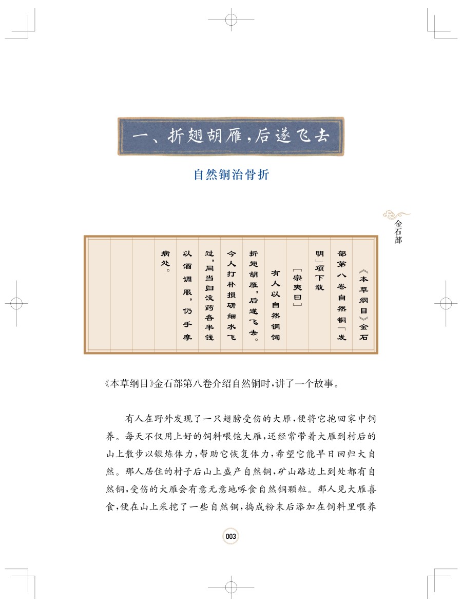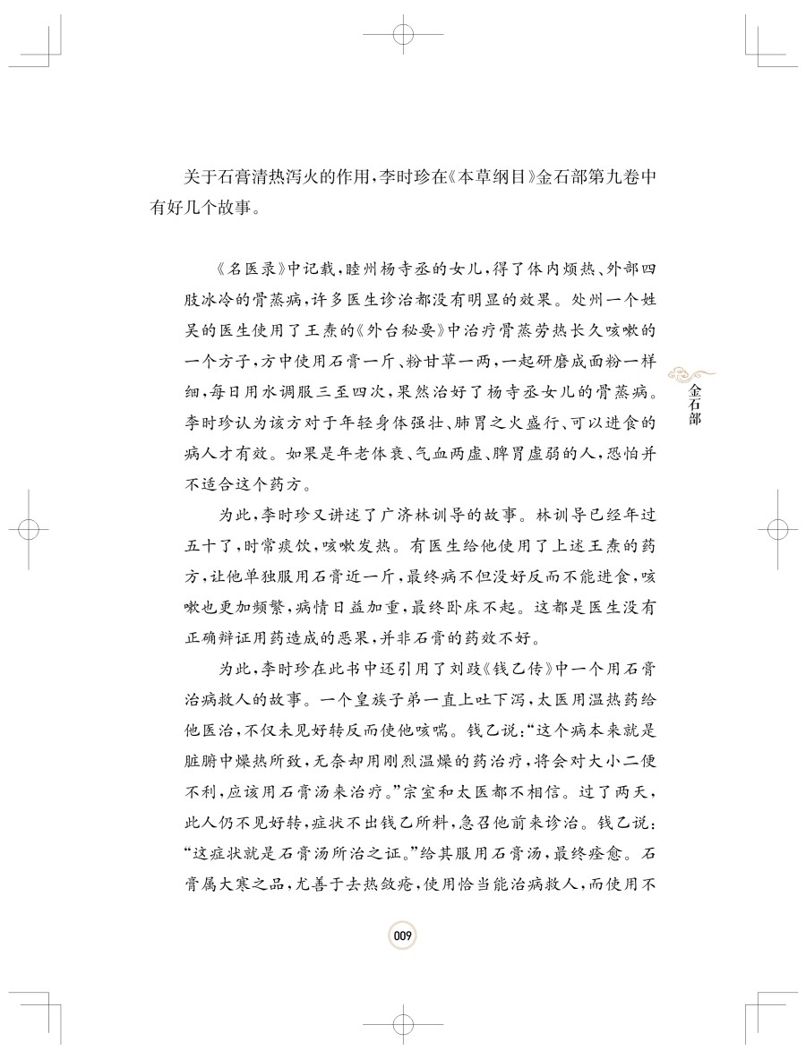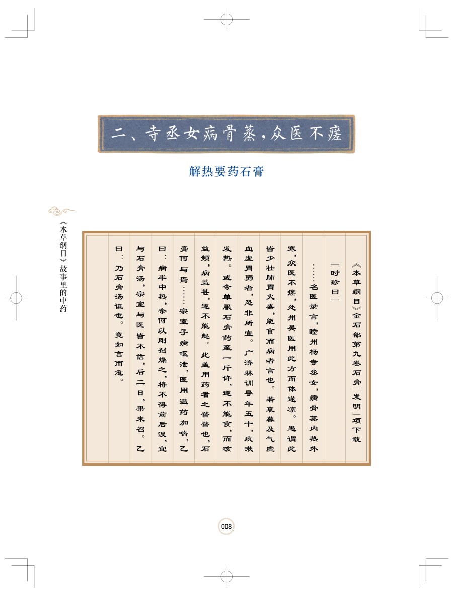 本书以《本草纲目》中记载的古代药物治病的传说和故事为线索,选取有代表性的常用中药50种展开。这些故事有李时珍的亲身经历,也有这位伟大的药学家对前人记录的转述,全书从生动有趣的故事讲到药物来源、鉴别、炮制、性味、功效、主治以及临床验方、使用注意等。本书不仅深入浅出、美观精致、雅俗共赏,难能可贵的是,编写团队以原创性、科学性为本,以原文新译、真图对比、验方筛选等手法,对古代认知和现代研究做了很好的融合阐述,做到了取精华、弃糟粕、汇古今、扬发展。所以这既是一本有文化底蕴的通俗读物,也是一本值得放在案头经常翻阅参考的工具书。