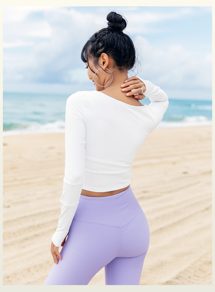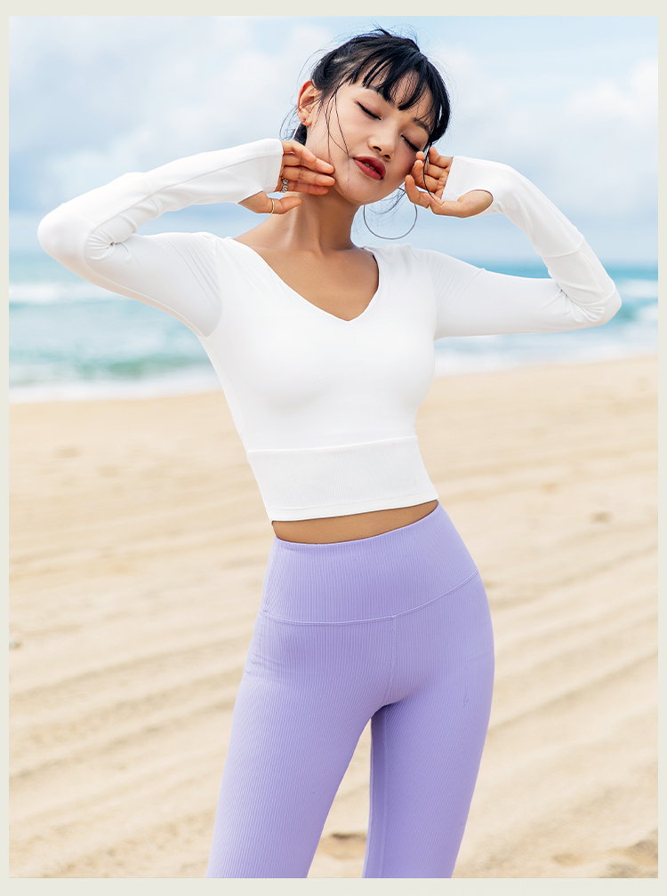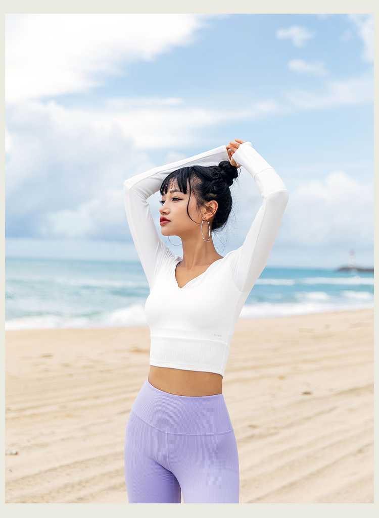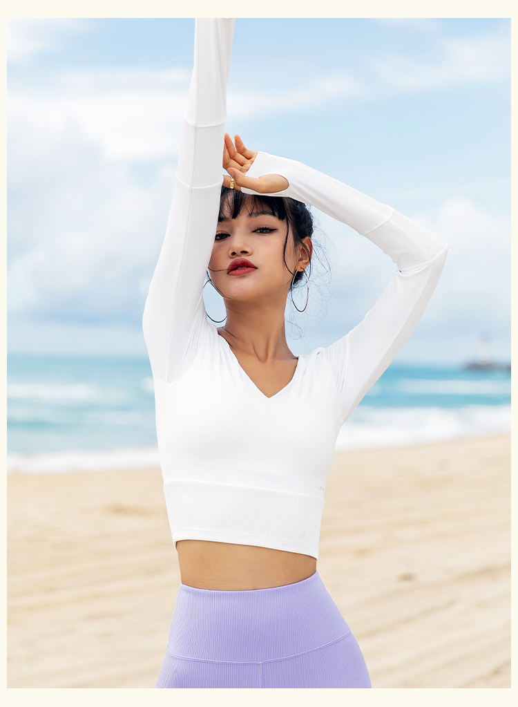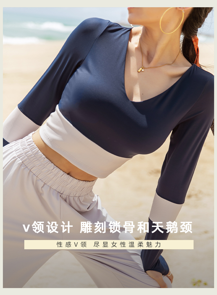 【裸感拼肌理】V领带胸垫瑜伽服上衣女短弹力紧身衣显瘦长袖