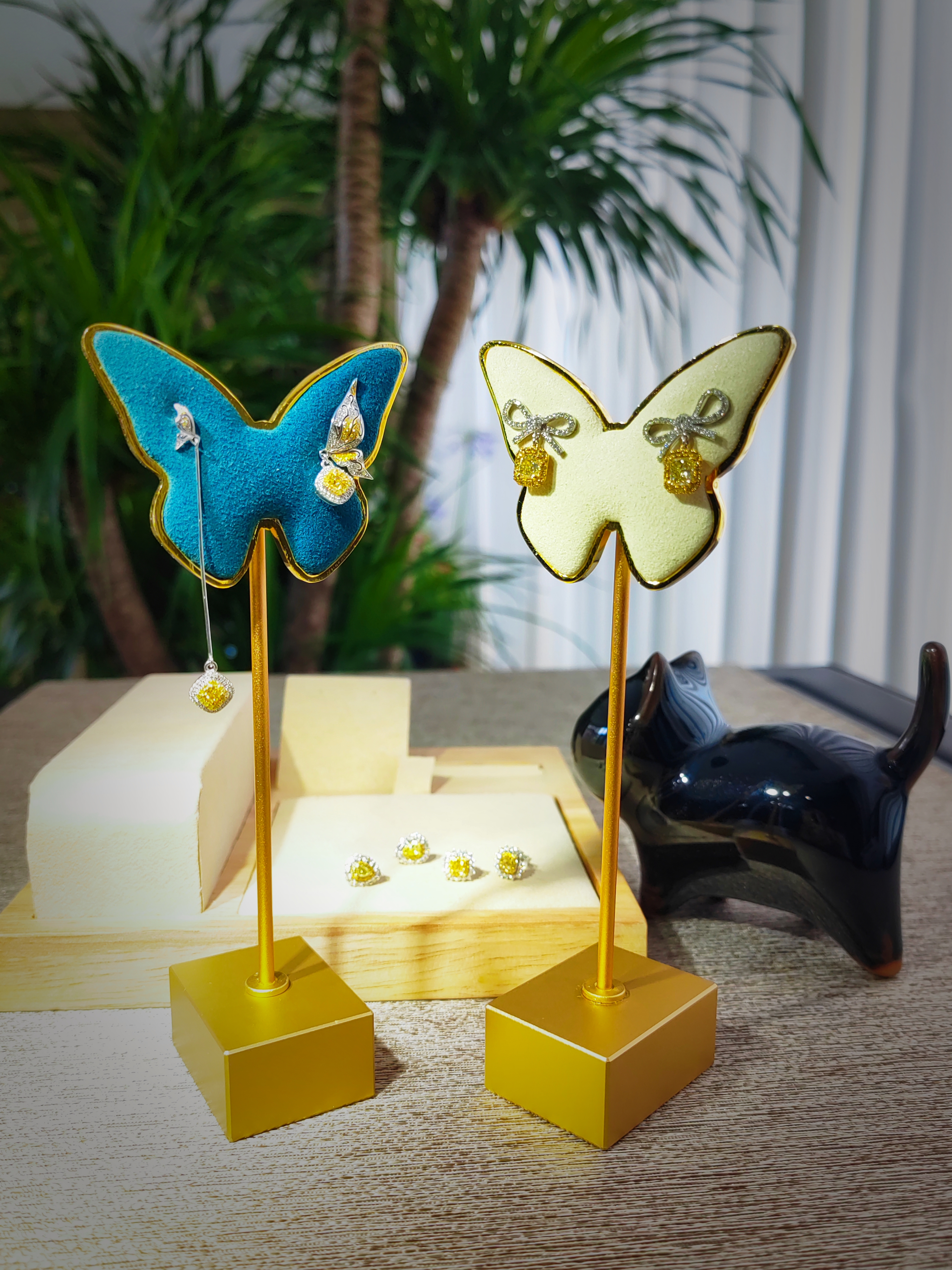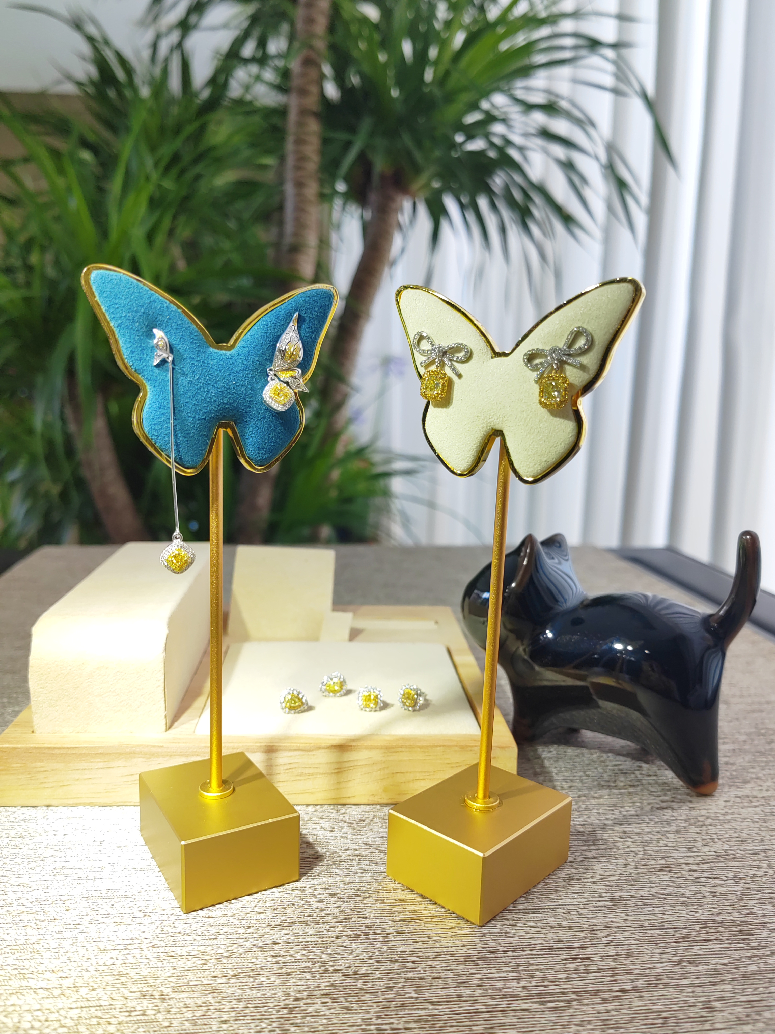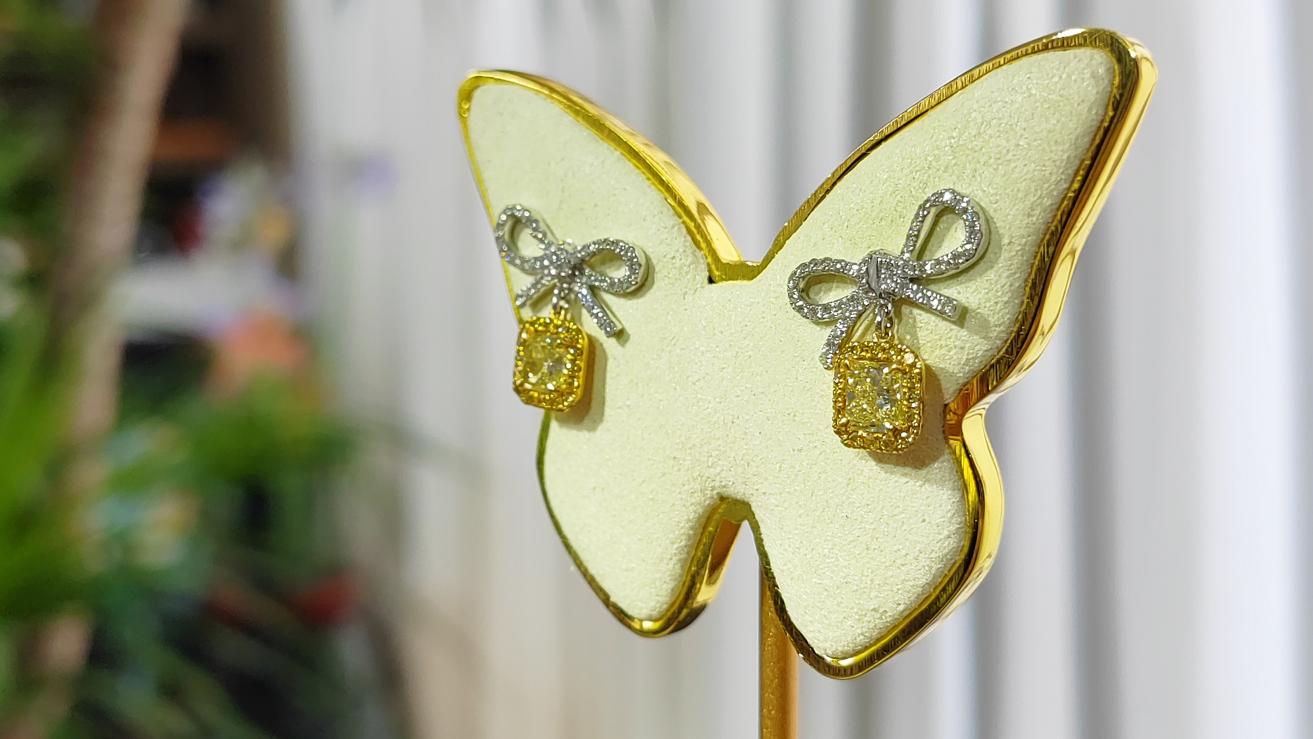 这一对黄钻耳钉,每颗钻石50分,有GIA证书。颜色达到fancy light yellow,显色镶嵌后饱和度高,配以生动的设计,豪华镶嵌更显火彩璀璨,佩戴后耳间流光溢彩。