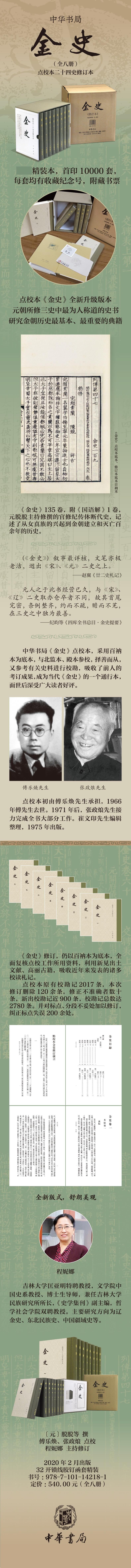 《金史》为元朝脱脱等修纂之纪传体金代史,共135卷。包括本纪19卷、志39卷、表4卷、列传71卷,记述了从女真族的兴起到金朝建立和灭亡百余年的历史。《金史》點校本採用百衲本為底本,與北監本、殿本參校,擇善而從,又参考有关史料进行校勘,吸取了前人的考订成果,成为当代《金史》的一个通行本,面世后深受广大读者好评。此次修訂仍以百衲本為底本,通校元刻本、清武英殿本,參校明南監本、北監本、清江苏书局本,以及明《永樂大典》殘本的相關部分。並吸收施國祁《金史詳校》、道光殿本的考證、張元濟《金史校勘記》等前人校勘成果。在版本校的基礎上,充分運用本校、他校,审慎使用理校,利用正史、類書、文集、出土文獻,以及高麗古籍進行校勘。修訂工作逐條覆核原點校本已有的校勘成果,充分吸納原點校本的成績。原點校本校勘記中對版本依據提及很少,且存在較多的改字現象。此次修訂明確列出校勘的版本依據,糾正不當的改字、補字、刪字。對原......