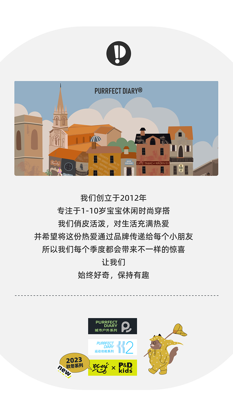 - Purrfect-Diary专注于贴近自然随性的穿着概念,轻奢平价的童装文化传播,在产品设计上更加注重婴童穿着的舒适性、安全性、更出众的国际化品牌,将欧美的育婴文化在中国进行深入的传播与推广。