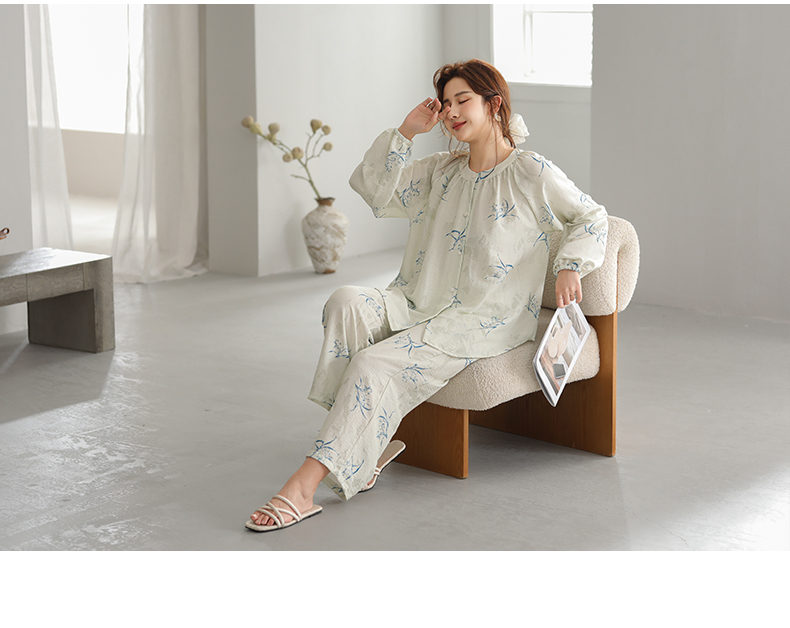 可人儿春秋季带胸垫奥力棉女士长袖长裤睡衣可外出纯棉家居服套装