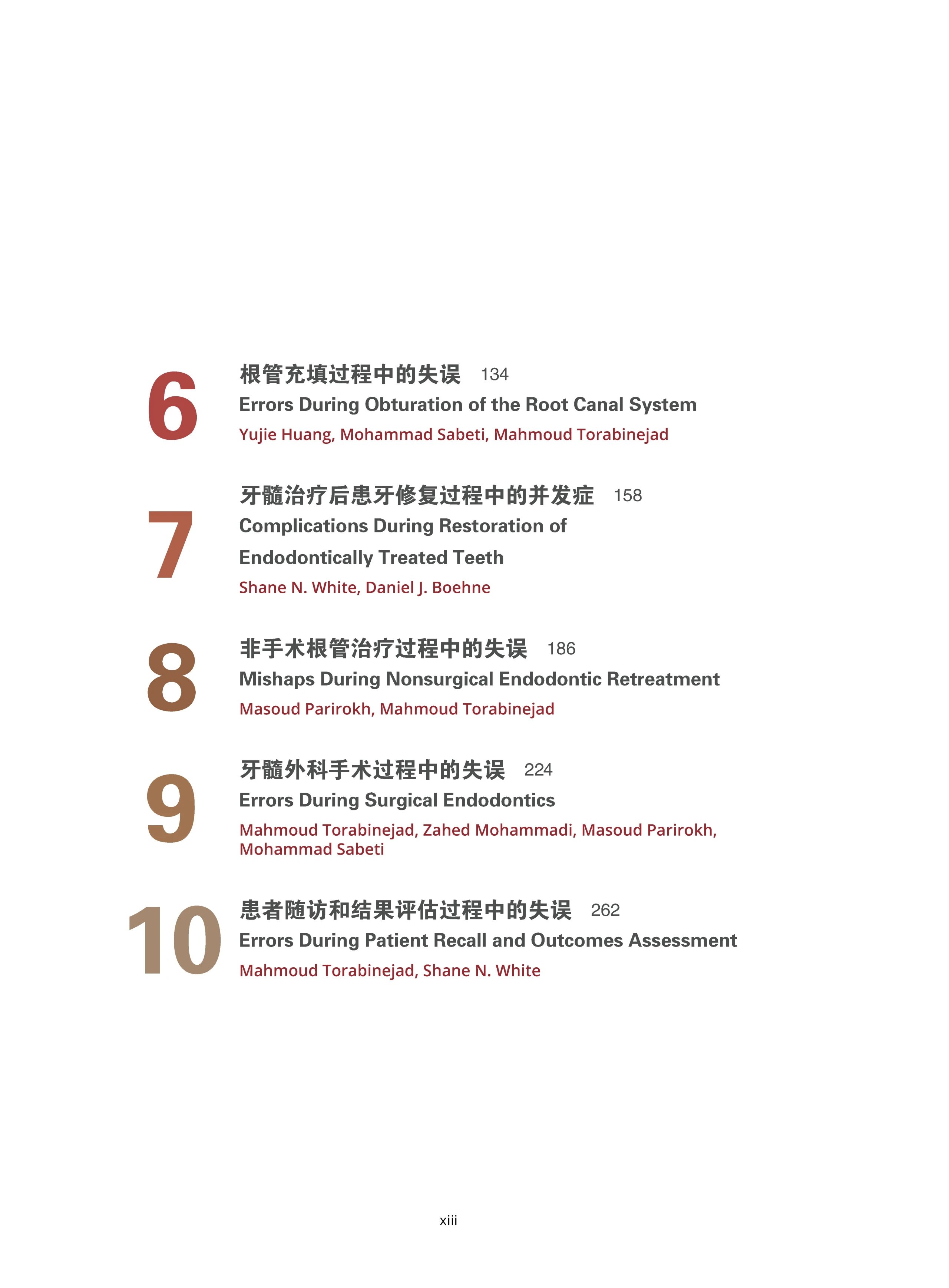 在牙髓治疗的临床实践中,医生们常常会遇到各种不期而遇的挑战和意外情况,这些操作事故或失误可能发生在治疗的任何阶段,从诊断、髓腔预备、根管清理和成形、根管充填、修复,到非手术及手术再治疗,以及根管治疗效果评估等,每一个环节都可能隐藏着风险。 诊断阶段:如何避免误诊或漏诊,确保治疗方案的准确性? 髓腔预备阶段:如何防止髓腔穿孔,避免过度预备过度?有没有特别的开髓口设计? 根管清理和成形阶段:如何避免器械分离,确保根管的通畅和清洁? 根管充填阶段:如何避免充填不足或过度,确保治疗效果? 修复阶段:如何选择合适的修复材料和方法,确保牙齿的长期稳定? 《牙髓治疗并发症管理》这本书,正是为了解决这些痛点而诞生的。它由Mahmoud Torabinejad教授和Mohammad Sabeti教授倾力主编,它不是一本简单的操作手册,而是一部真正能够帮助医生提升临床技能、预防和处理并发症的权威指南。这本书有全面系统的知识体系、实用清晰的操作指导,更能培养医生的“安全思维”,愿医生们用本书作为指引,在根管治疗的道路上更加稳健地前行,为更多患者守护健康笑容!