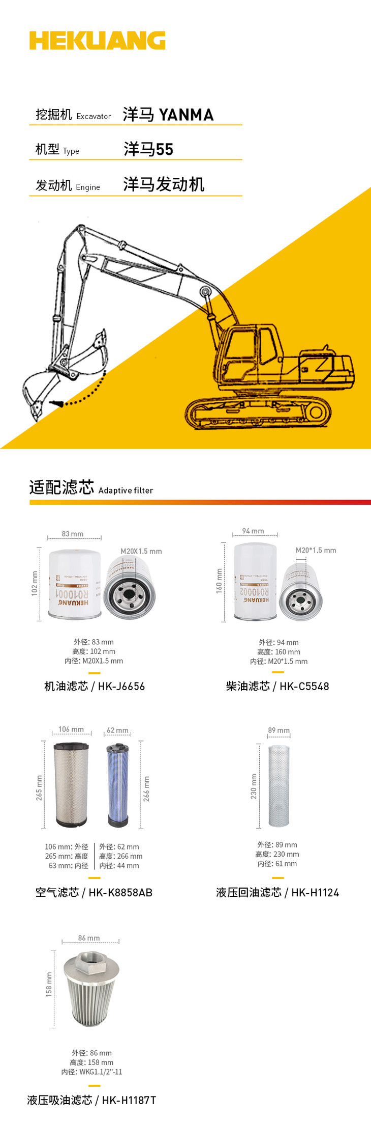 洋马55(洋马发动机)挖掘机滤芯 机油柴油空气滤芯 液压油吸油回油滤芯