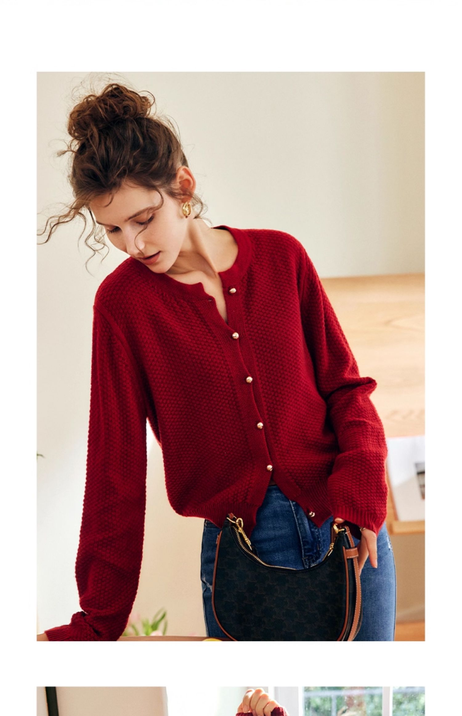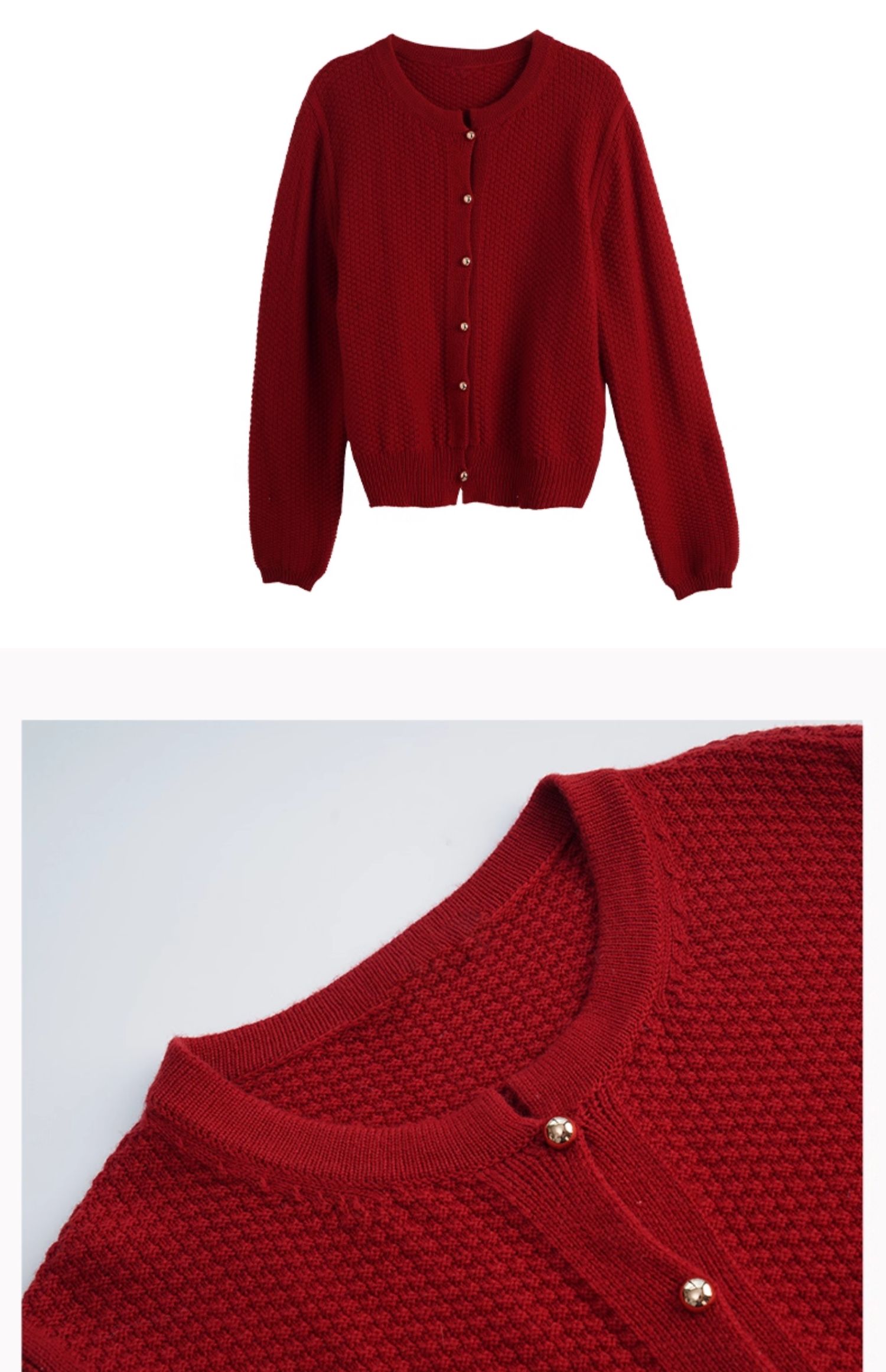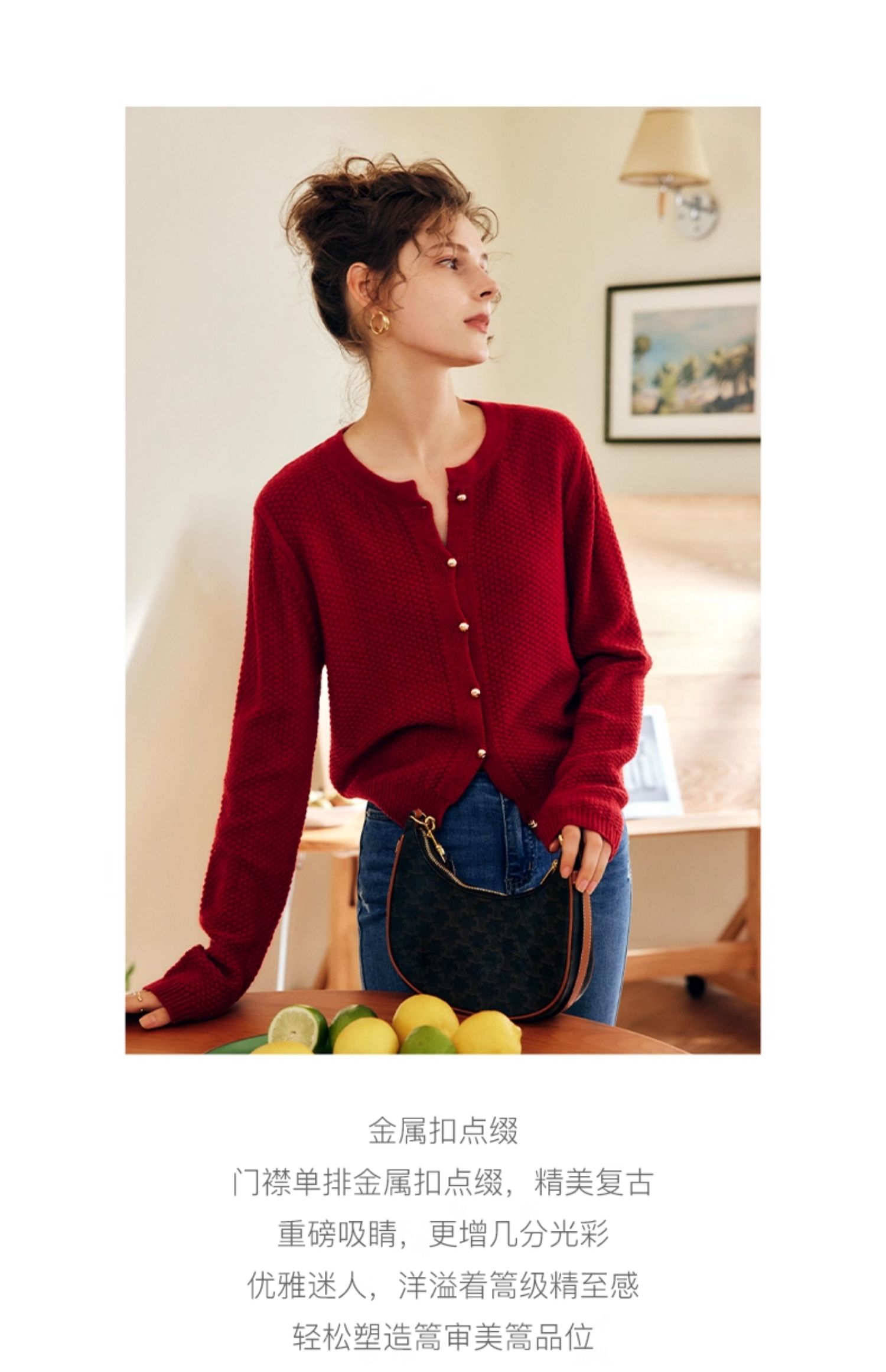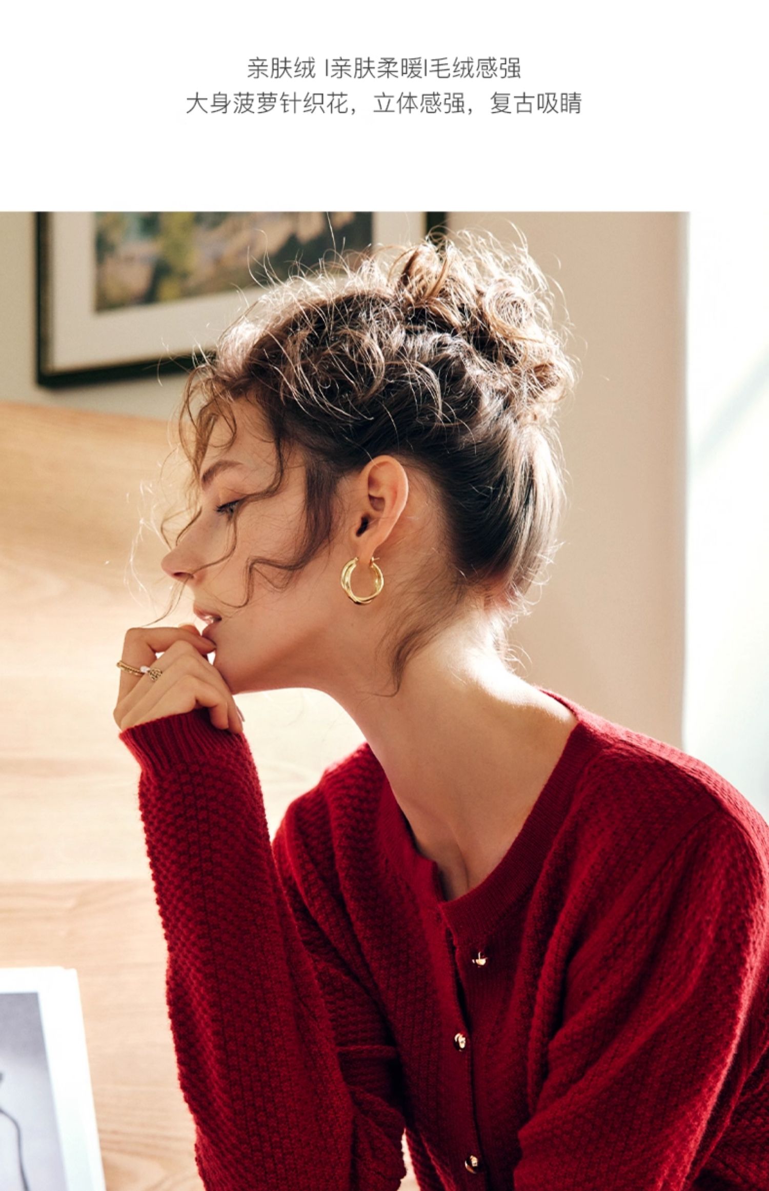 欧芮儿法式酒红色针织毛衣开衫女秋季2025新款复古外套新年慵懒风