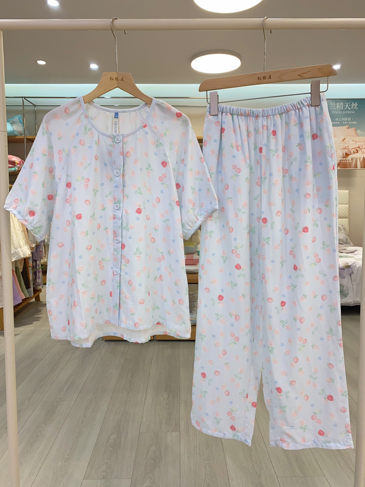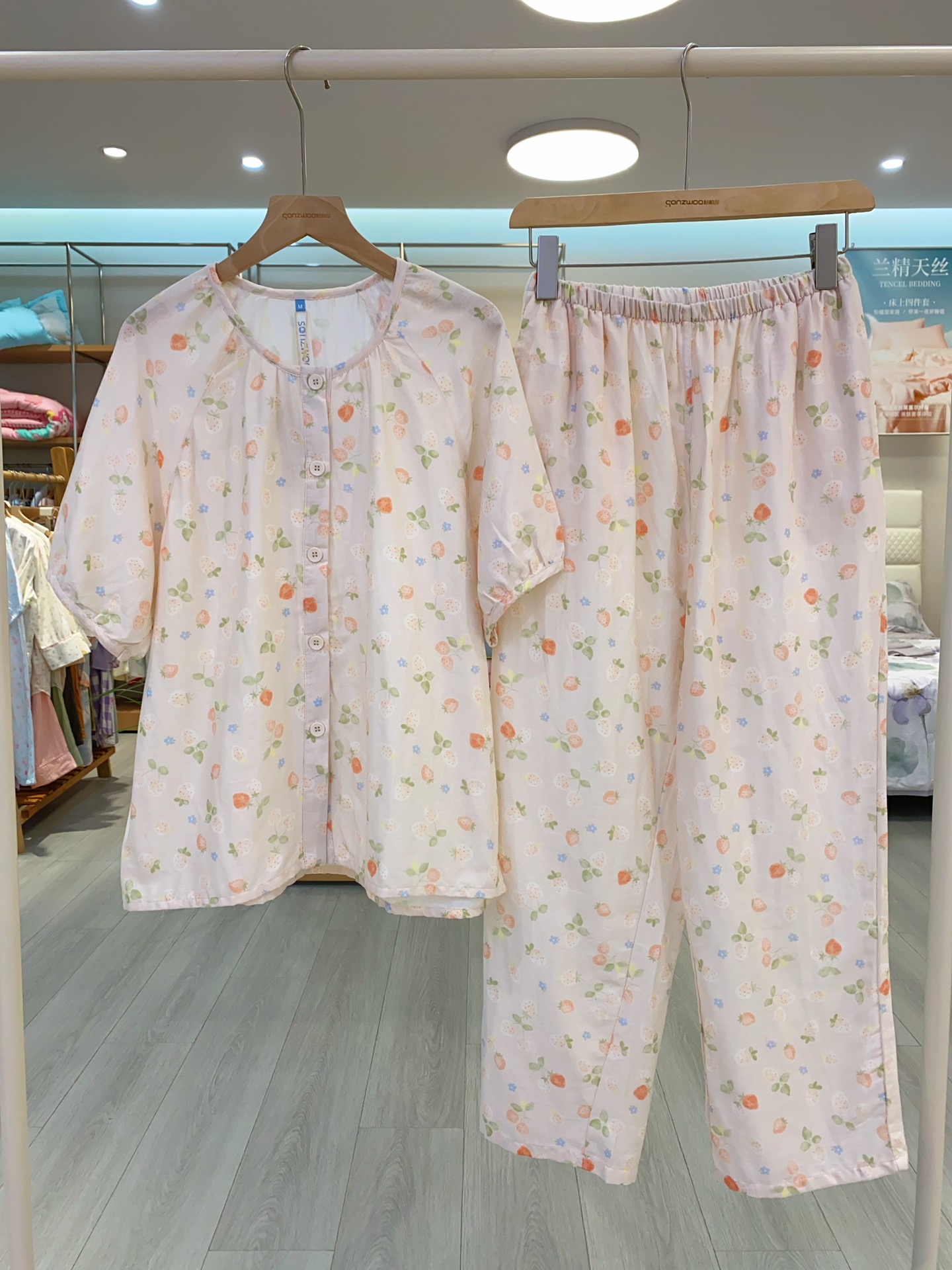 松植屋女款纱布圆领短袖长裤睡衣套装100%纯棉女士双层纱家居服圆领领设计优雅显瘦