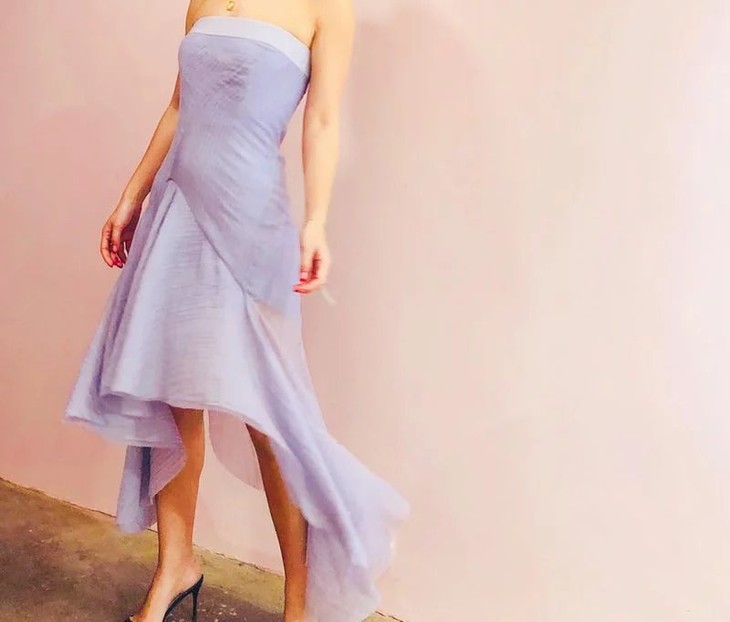 高雅烟熏紫,配合唯美浪漫的轻盈质地,尽展女性清新淑女的公主一面。手帕式裙摆随行走飘逸灵动、摇曳生姿,为造型注入朦胧诗意,将女人味展现得淋漓尽致。裙身已内附胸垫,勾勒曲线的同时令穿着更加舒适⾃如。
