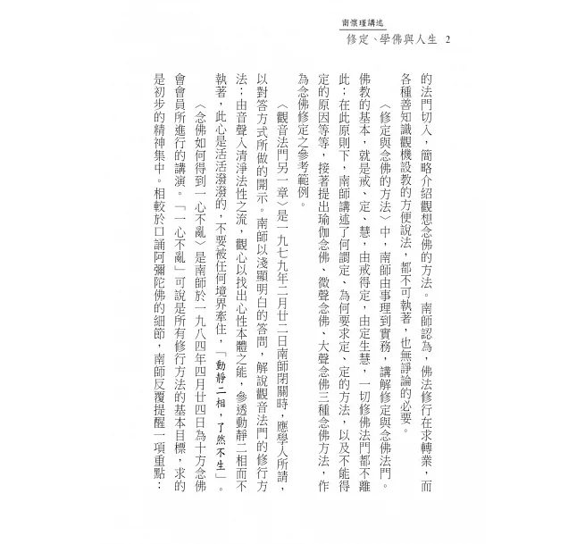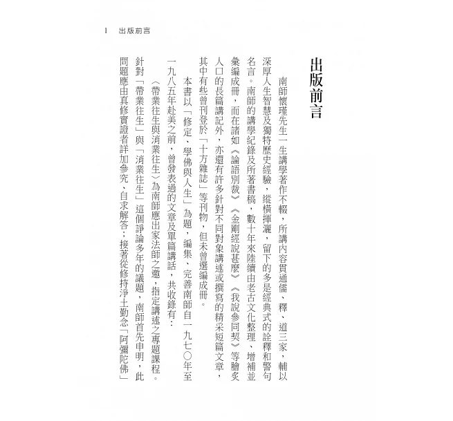 南師說法方便應機,出入各宗,談禪而不限於禪,說理而兼顧實修。無論是講演紀錄或是往來詢答,在親切平實的語氣間,仍不時可見智慧火花迸現,盡顯南師一貫風格。
