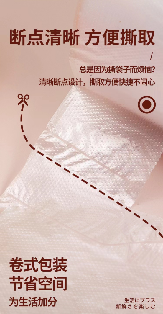 保鲜袋撕得爽不爽也很重要! 我们的保鲜袋相比较其他品牌更易撕取, 而且采用了凸点压纹设计, 一搓就开,开袋超级方便!