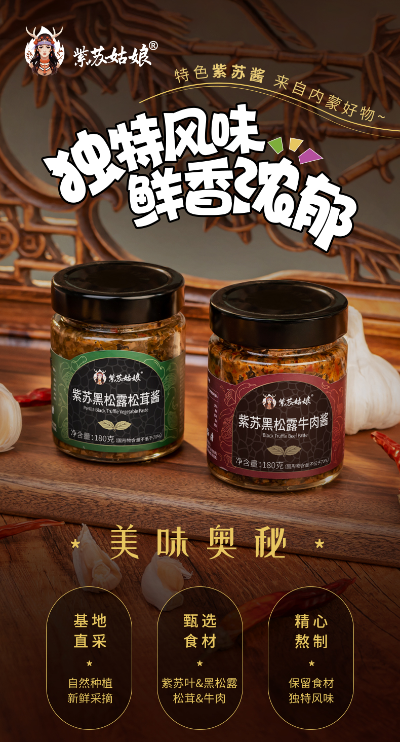 【产品名称】:紫苏姑娘紫苏牛肉酱、紫苏姑娘黑松露酱