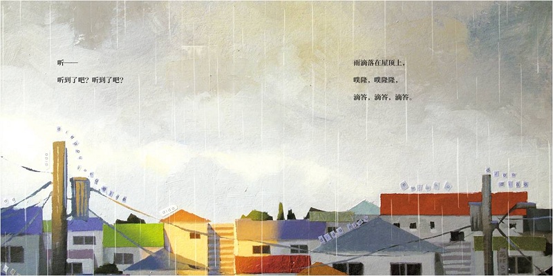 “雨滴落在屋顶上,噗隆……滴答……”