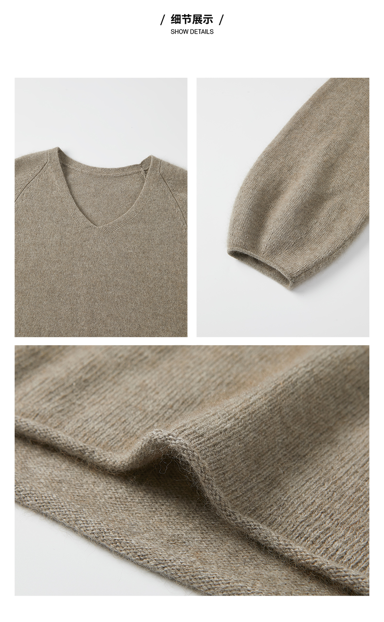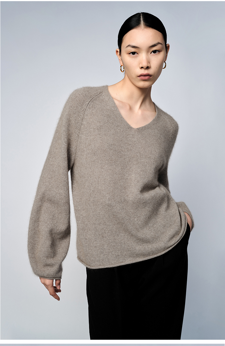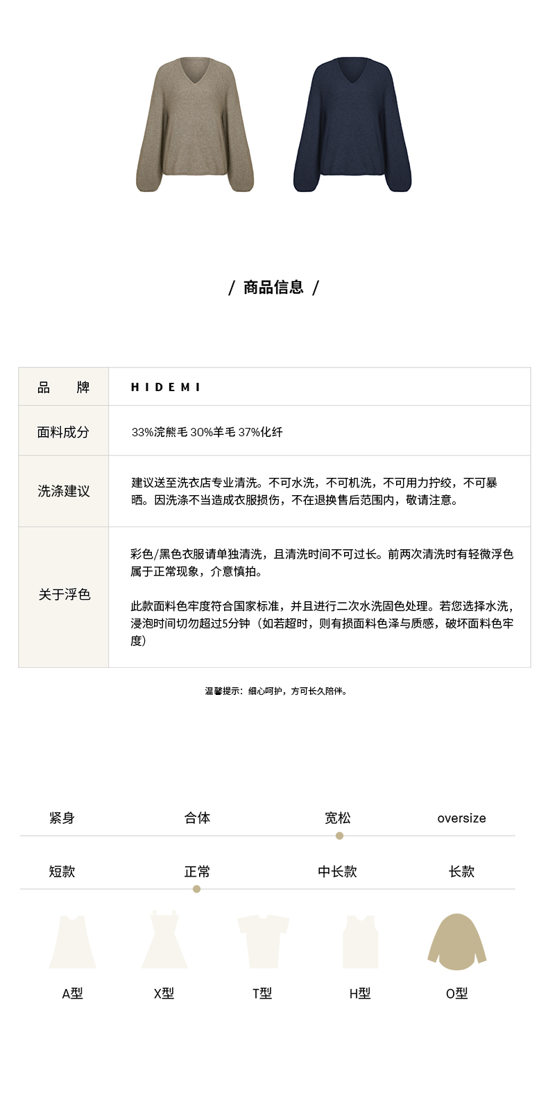 HIDEMI 浣熊毛V领灯笼袖毛衣 栗子色/静谧蓝