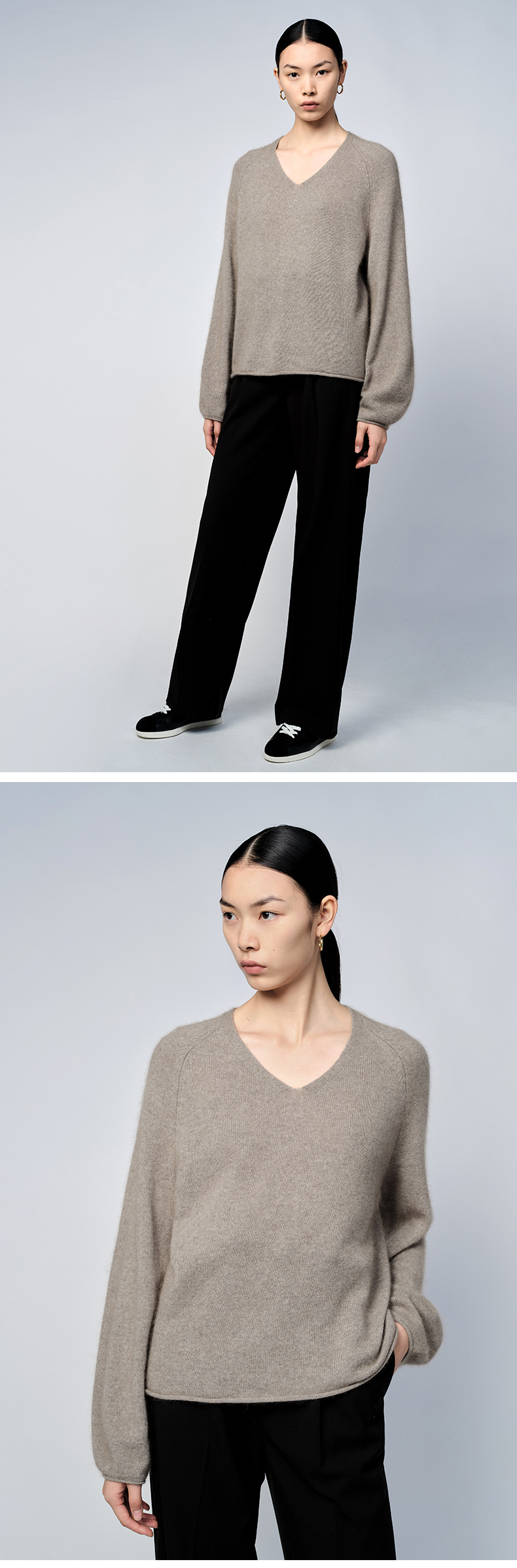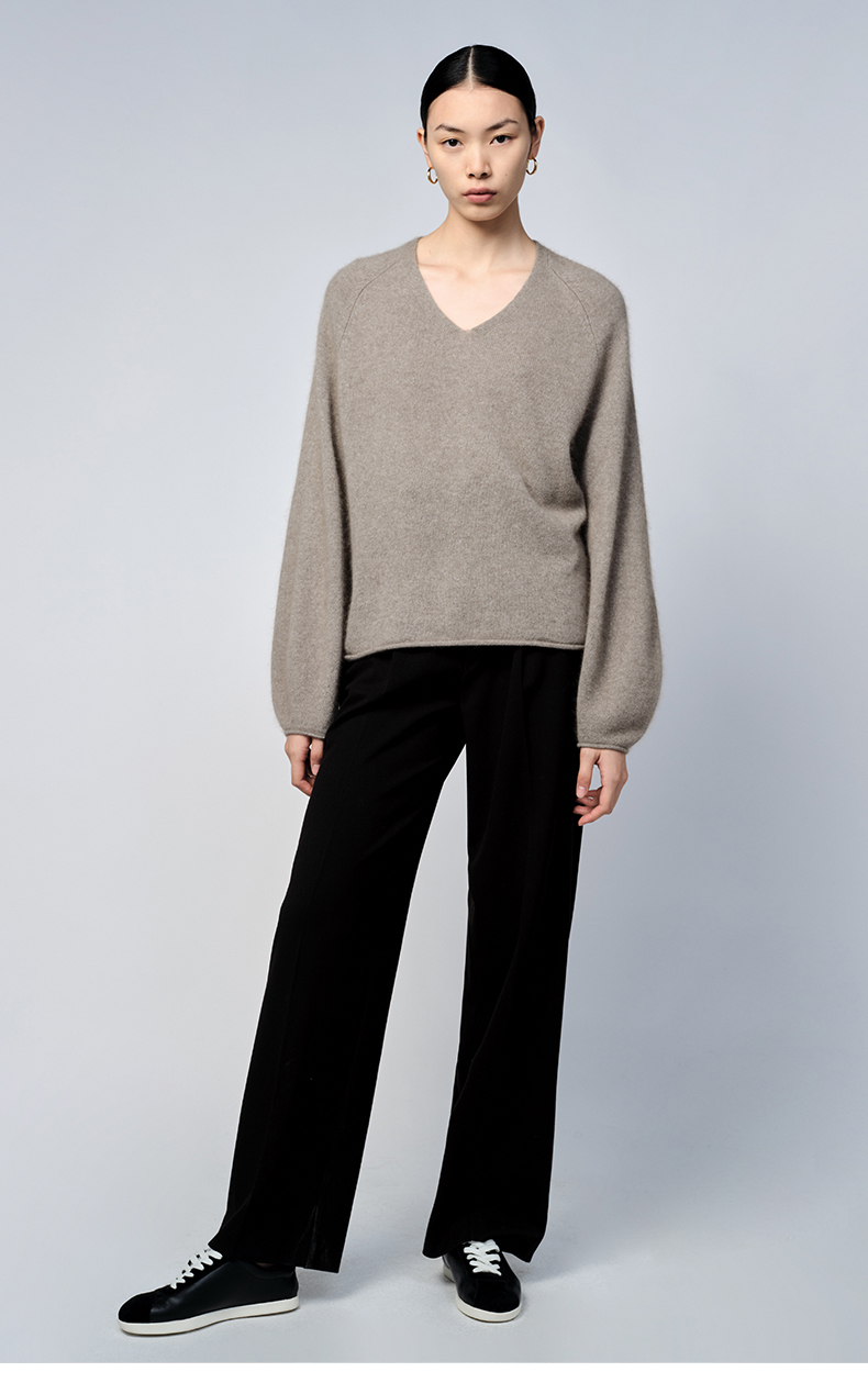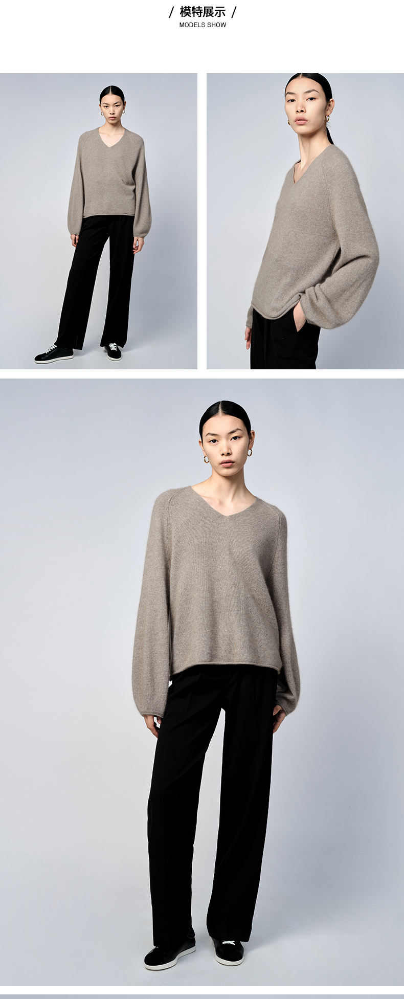 HIDEMI 浣熊毛V领灯笼袖毛衣 栗子色/静谧蓝