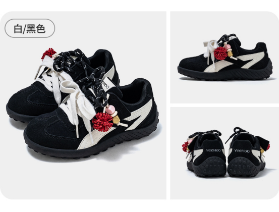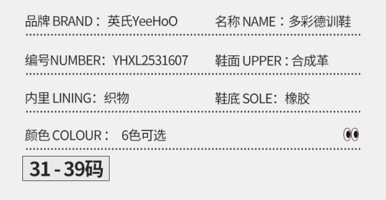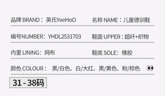 货号:YHDL2531703 颜色:白/大红、粉/棕色、黑/白色、黑/黄色 尺码:31-38 材质:鞋面 合成革;鞋底 橡胶