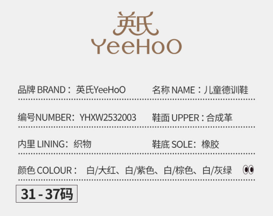 货号:YHXW2532003 颜色:白/大红、白/灰绿、白/棕色、白/紫色 尺码:31-37 材质:鞋面 合成革;鞋底 橡胶