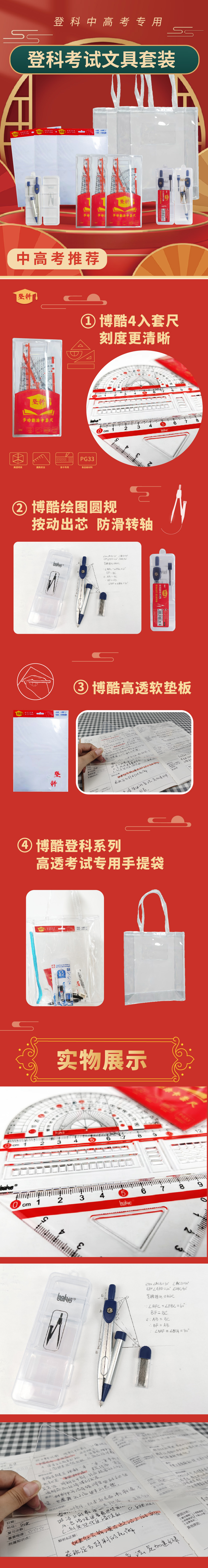博酷登科系列A3A4软垫板/0.7mm2B按动圆规/4入考试套尺/拉链袋(
