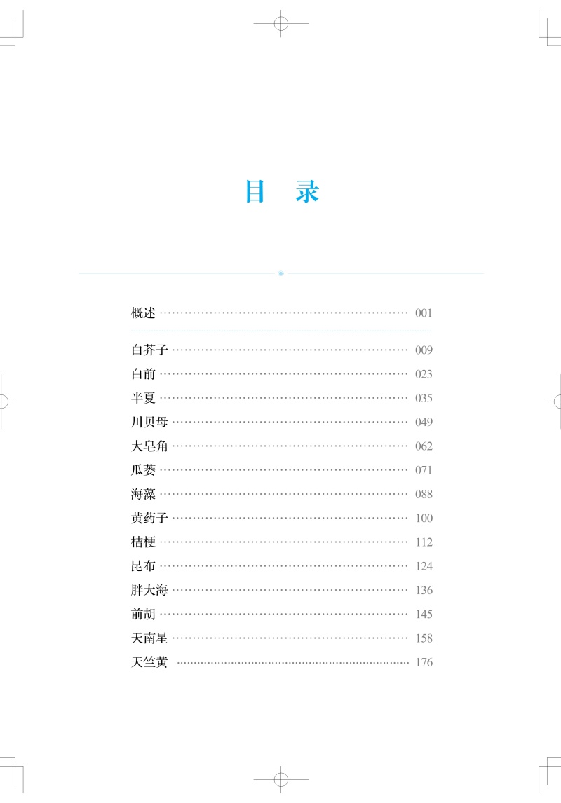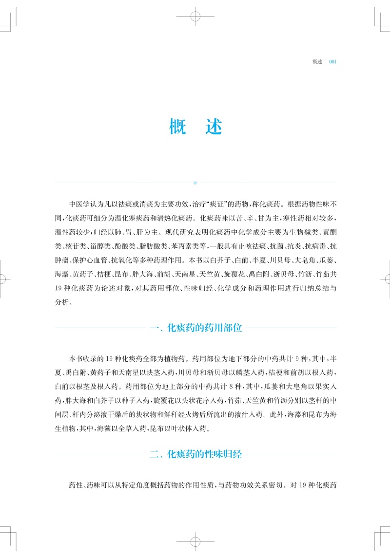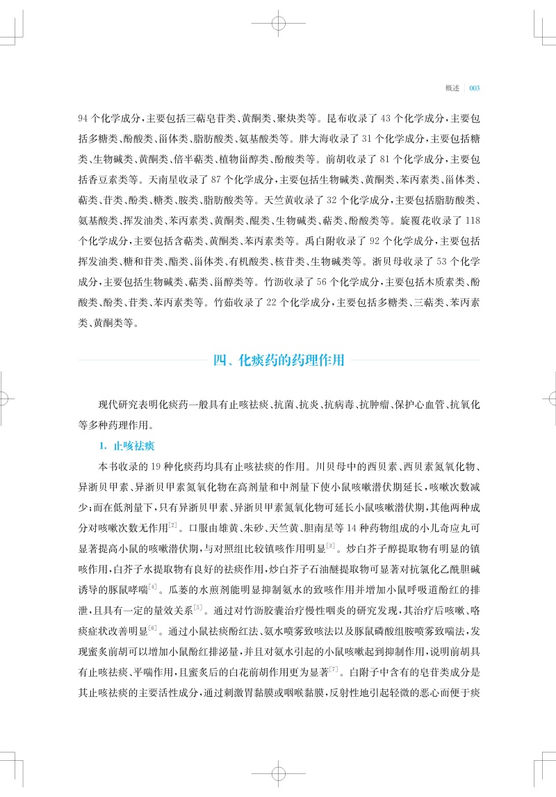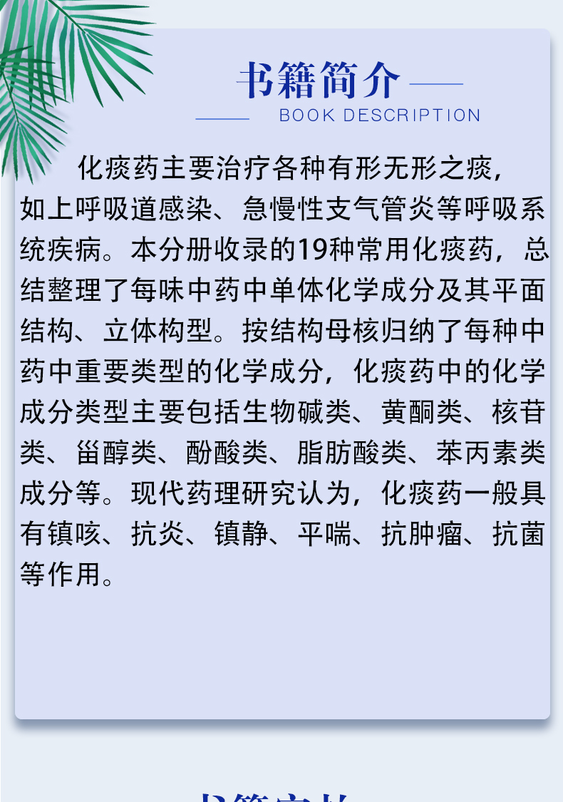化痰药主要治疗各种有形无形之痰,如上呼吸道感染、急慢性支气管炎等呼吸系统疾病。本分册收录的19种常用化痰药,总结整理了每味中药中单体化学成分及其平面结构、立体构型。按结构母核归纳了每种中药中重要类型的化学成分,化痰药中的化学成分类型主要包括生物碱类、黄酮类、核苷类、甾醇类、酚酸类、脂肪酸类、苯丙素类成分等。现代药理研究认为,化痰药一般具有镇咳、抗炎、镇静、平喘、抗肿瘤、抗菌等作用。