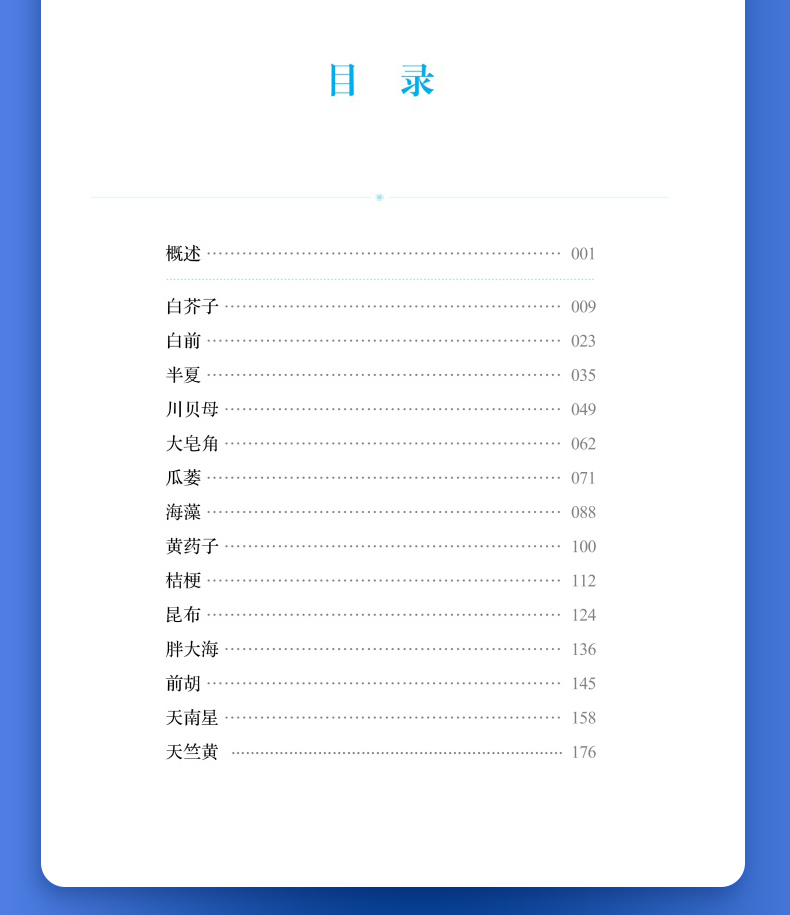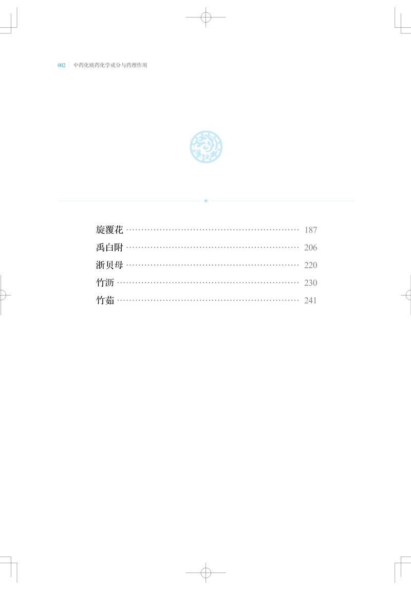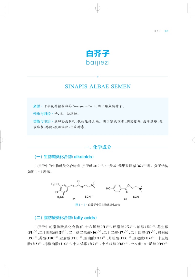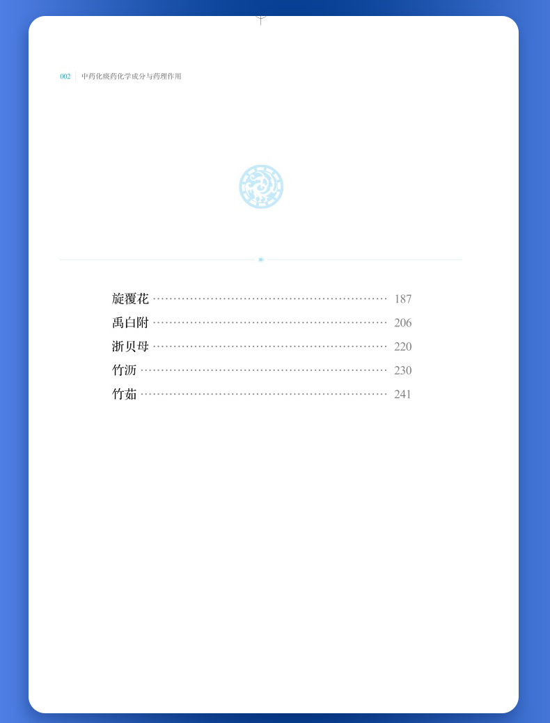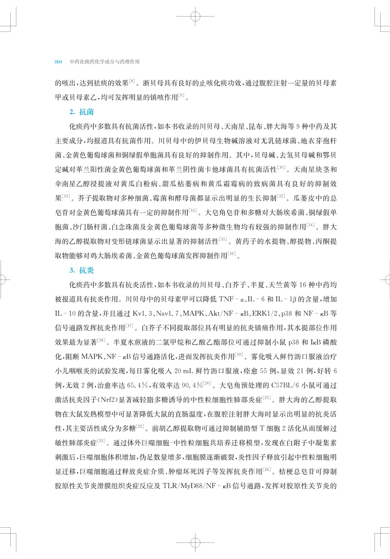 化痰药主要治疗各种有形无形之痰,如上呼吸道感染、急慢性支气管炎等呼吸系统疾病。本分册收录的19种常用化痰药,总结整理了每味中药中单体化学成分及其平面结构、立体构型。按结构母核归纳了每种中药中重要类型的化学成分,化痰药中的化学成分类型主要包括生物碱类、黄酮类、核苷类、甾醇类、酚酸类、脂肪酸类、苯丙素类成分等。现代药理研究认为,化痰药一般具有镇咳、抗炎、镇静、平喘、抗肿瘤、抗菌等作用。