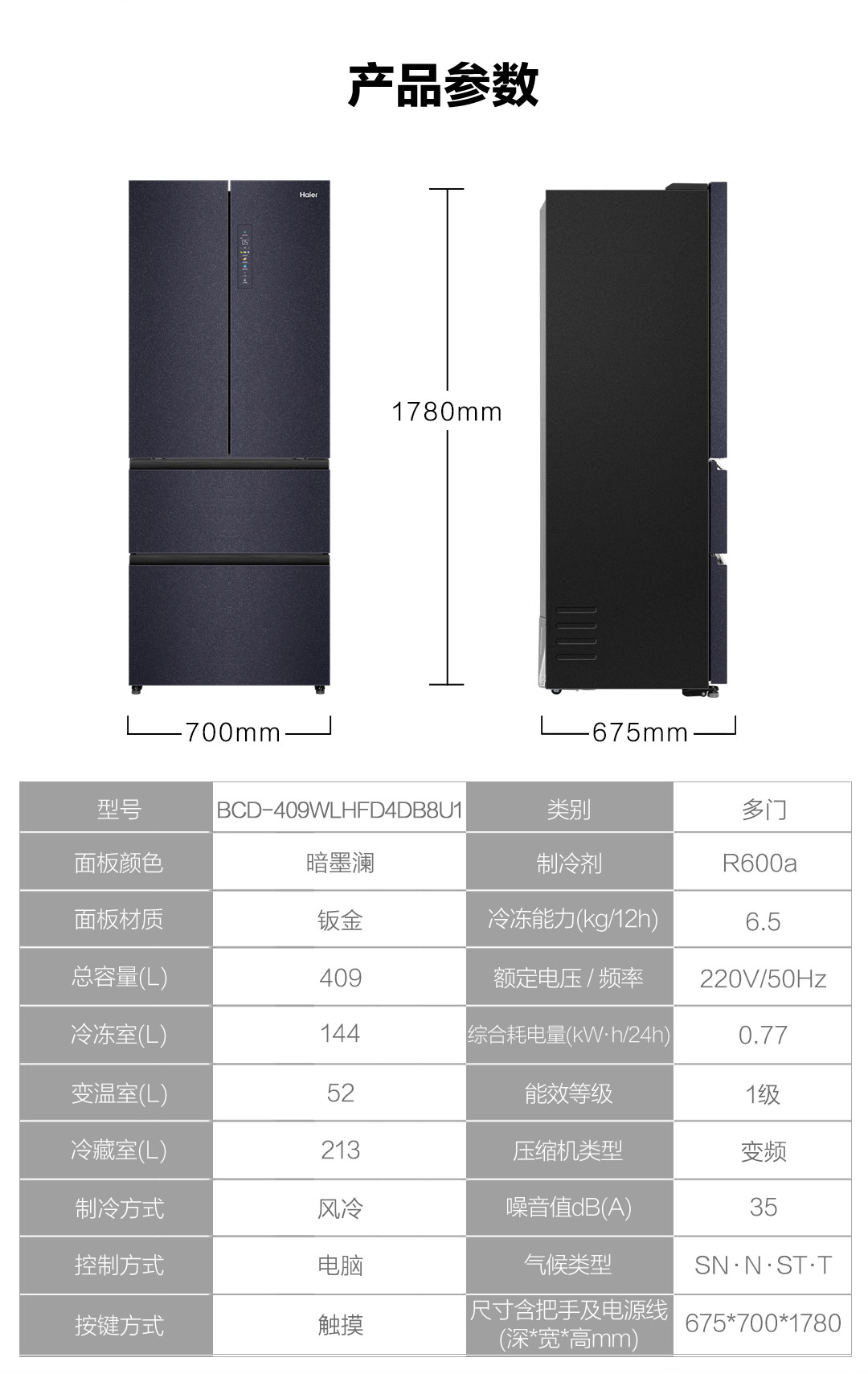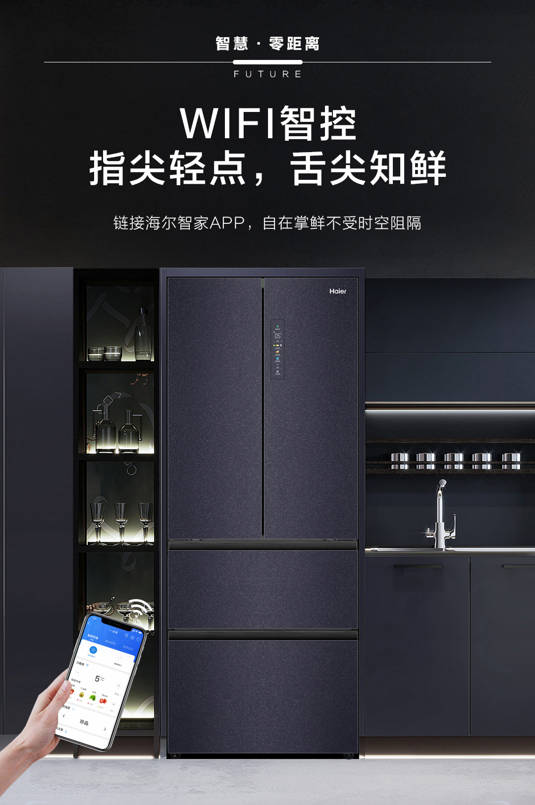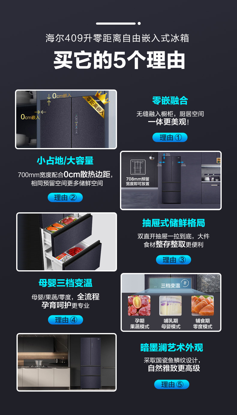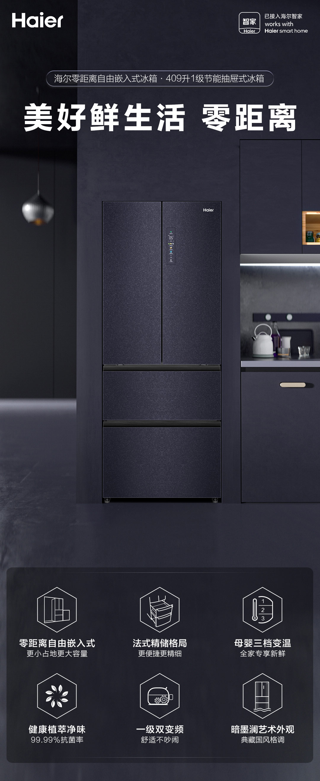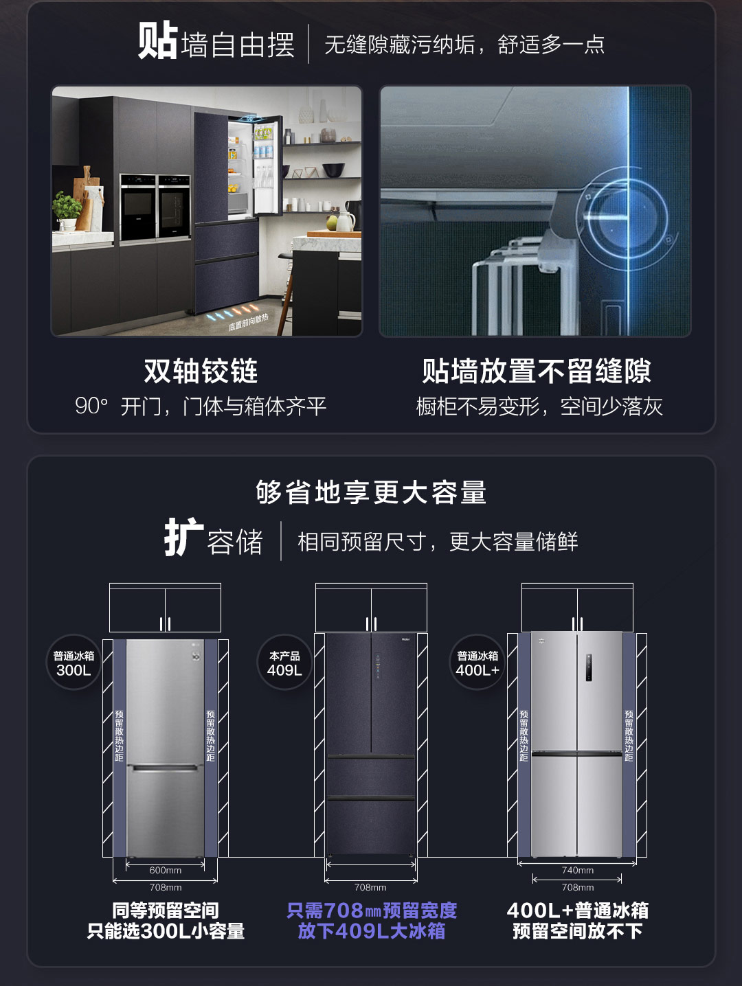 海尔409升一级能效变频超薄零距离嵌入式四开门多门冰箱风冷无霜净味