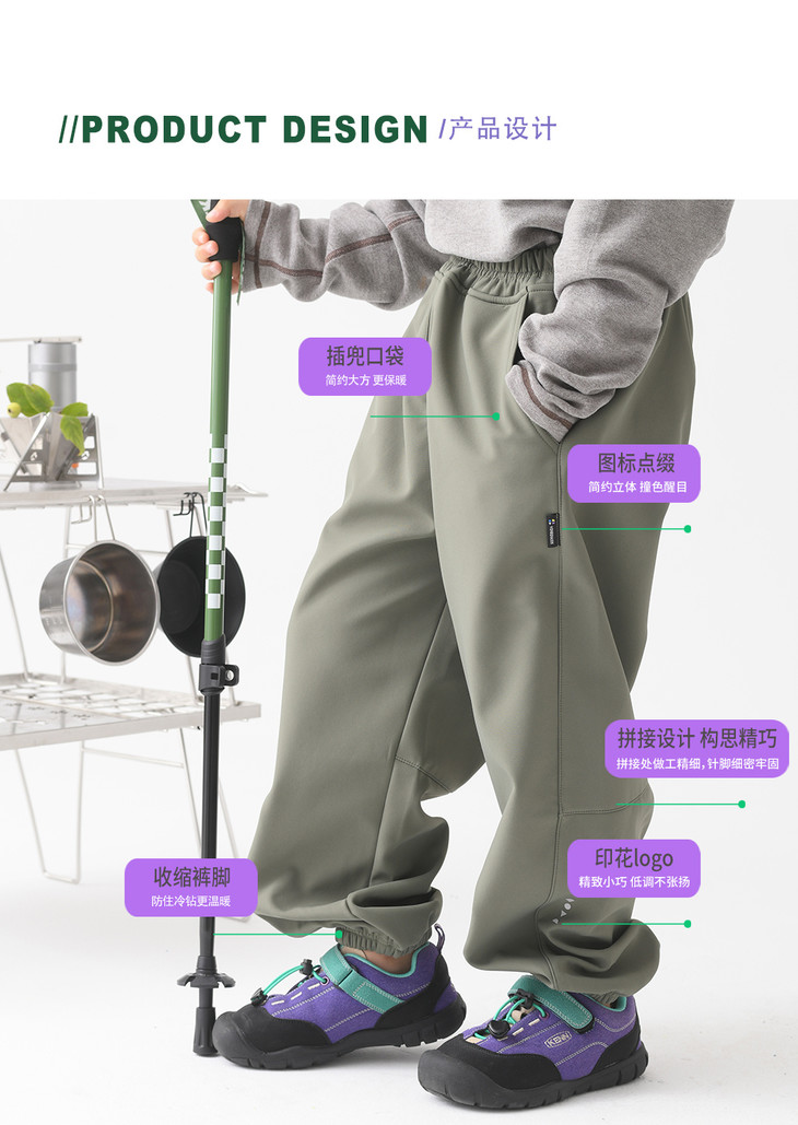 咱家外表层做的都是一个防风软壳 不是那种硬邦邦的,有时候娃娃上个高一点的台阶,抬腿都有点费力的硬壳 主打就是让娃娃在户外游玩儿跑跳能毫无负担 每一处针脚走线都是满满的诚意细节 🌿踏入山野,这条裤子是自然给的温柔暗号~ 软壳布料似青苔覆石的触感,防风又带着山林的 呼吸感,行走间像把山野的静谧与活力都穿在了身上,每一步都像和草木悄悄对谈~