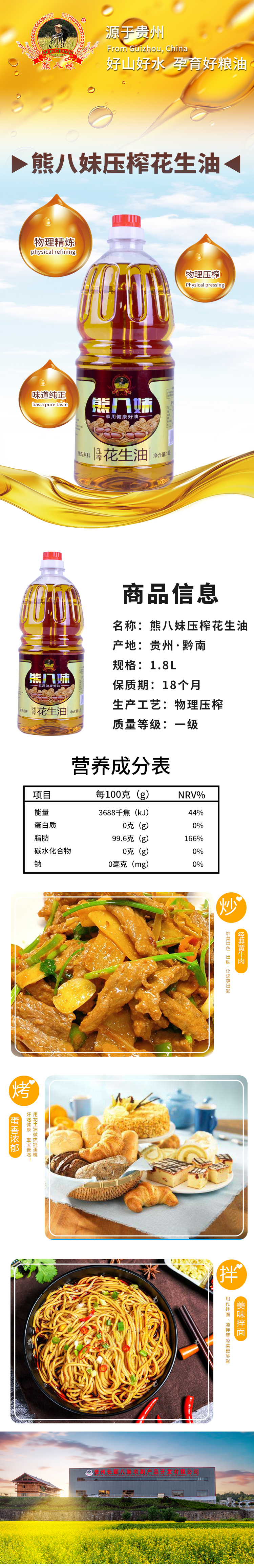 【熊八妹压榨花生油】1.8L 健康压榨 营养美味