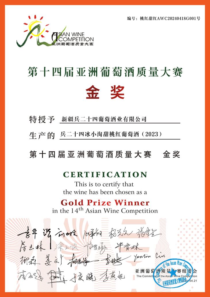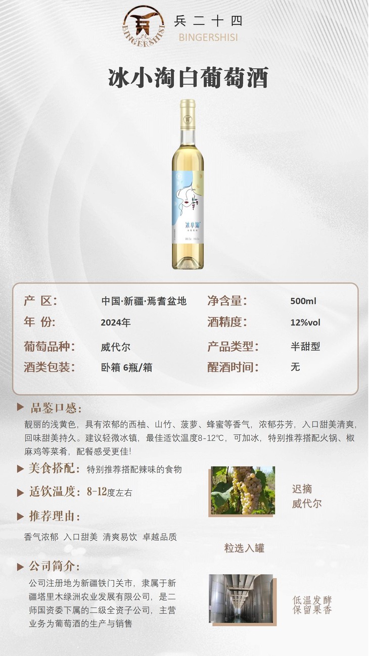 【新疆建设兵团出品】兵二十四国企酿造 冰小淘半甜白葡萄酒 荣获质量金奖浓郁果香清爽500ml/瓶