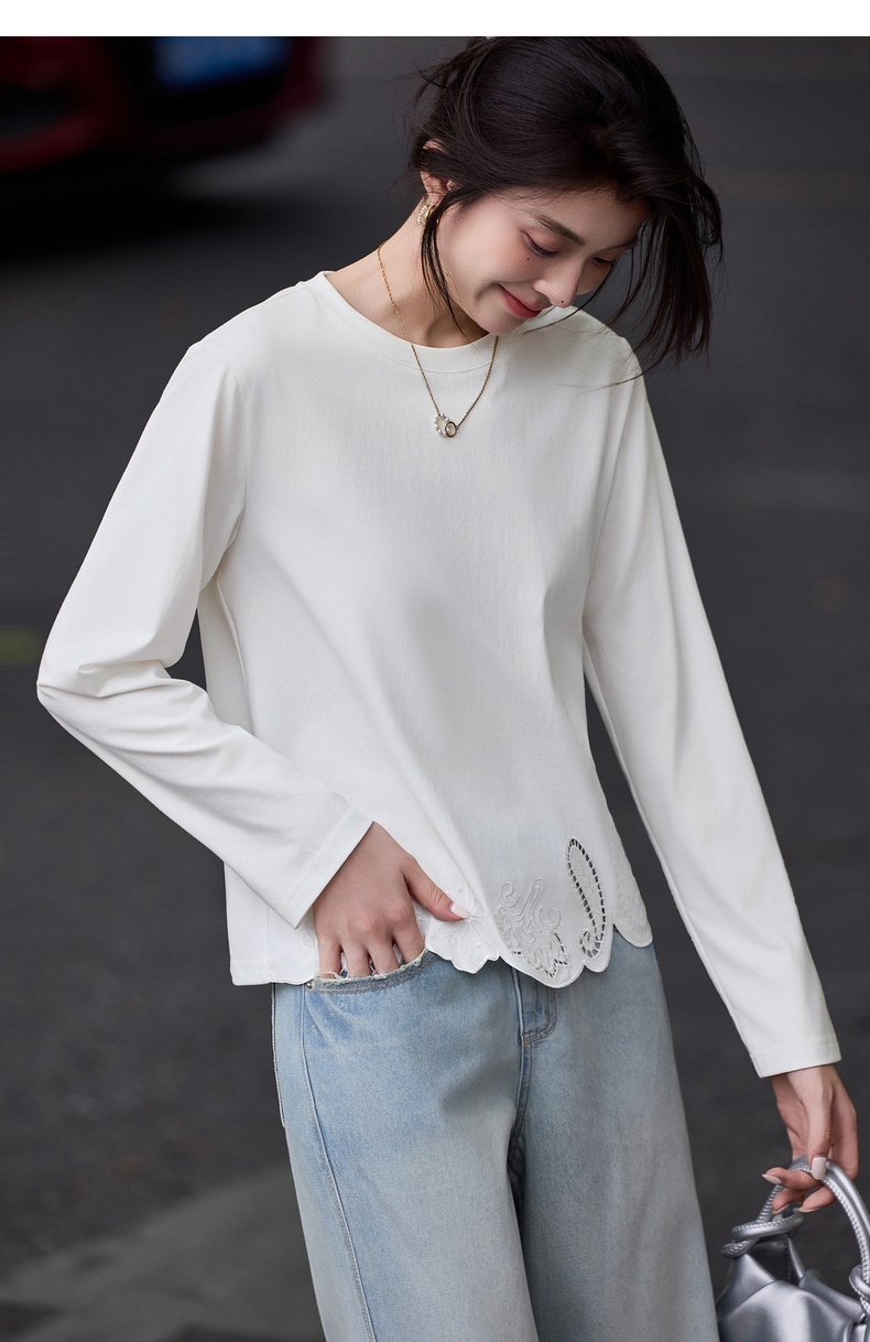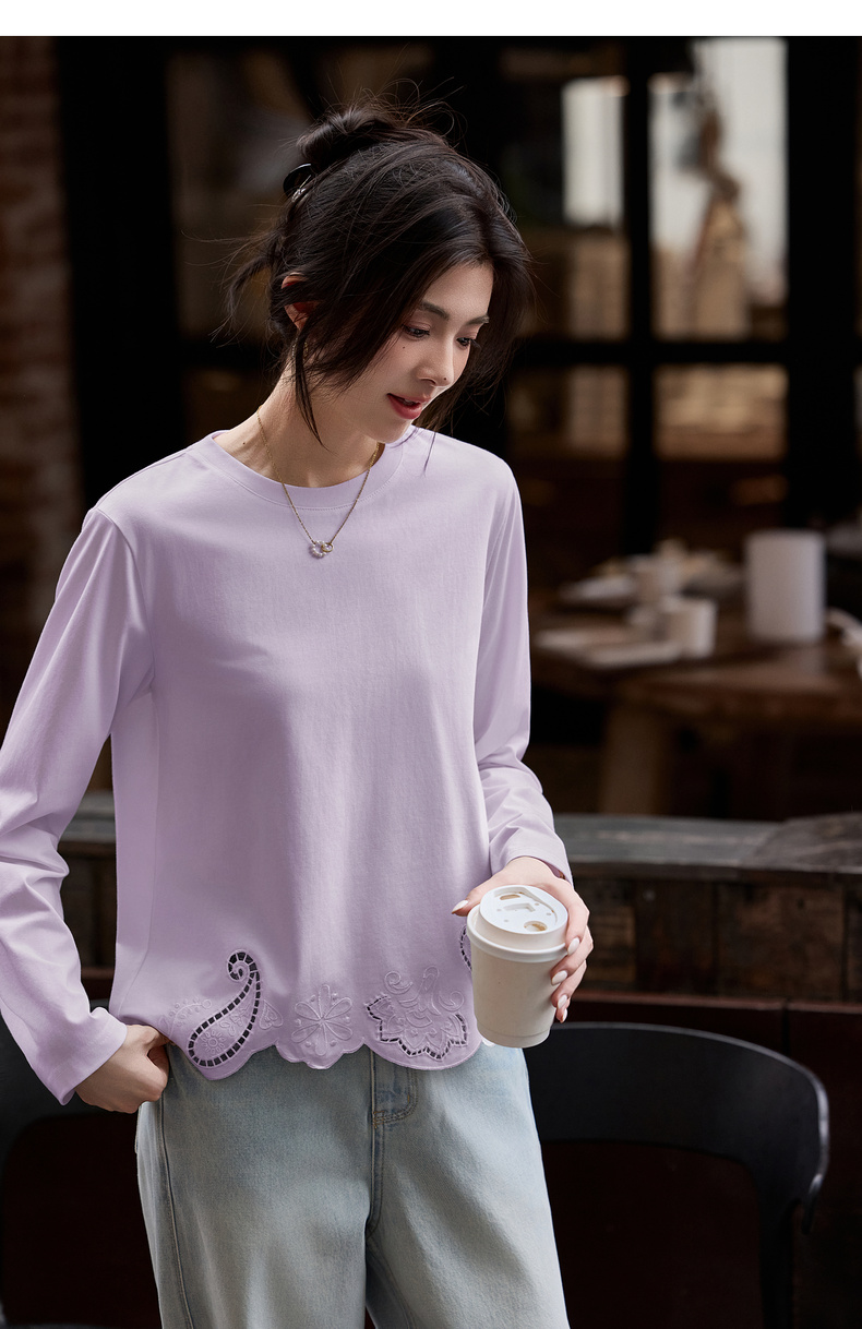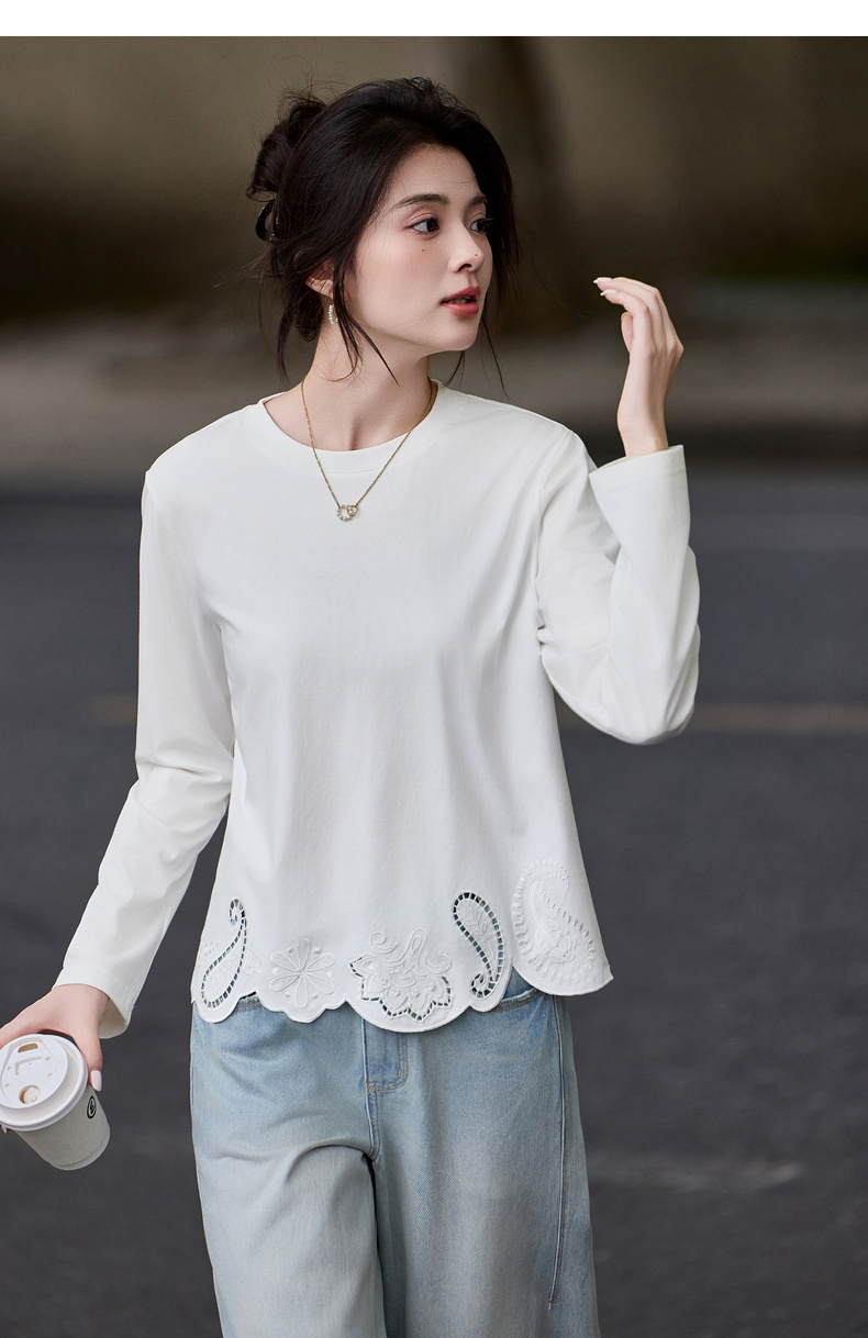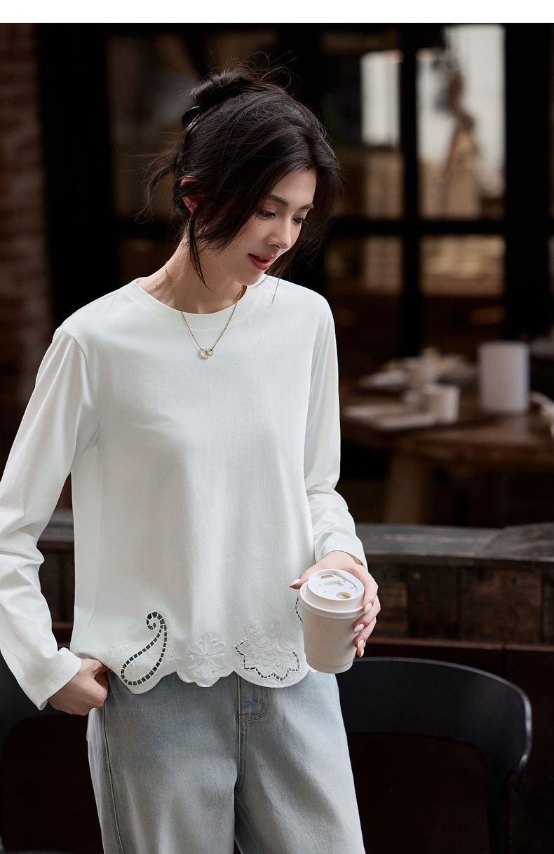 【内购】【镂空刺绣】简约通勤腰果花设计圆领直筒长袖40S精梳棉T恤-153TG2460