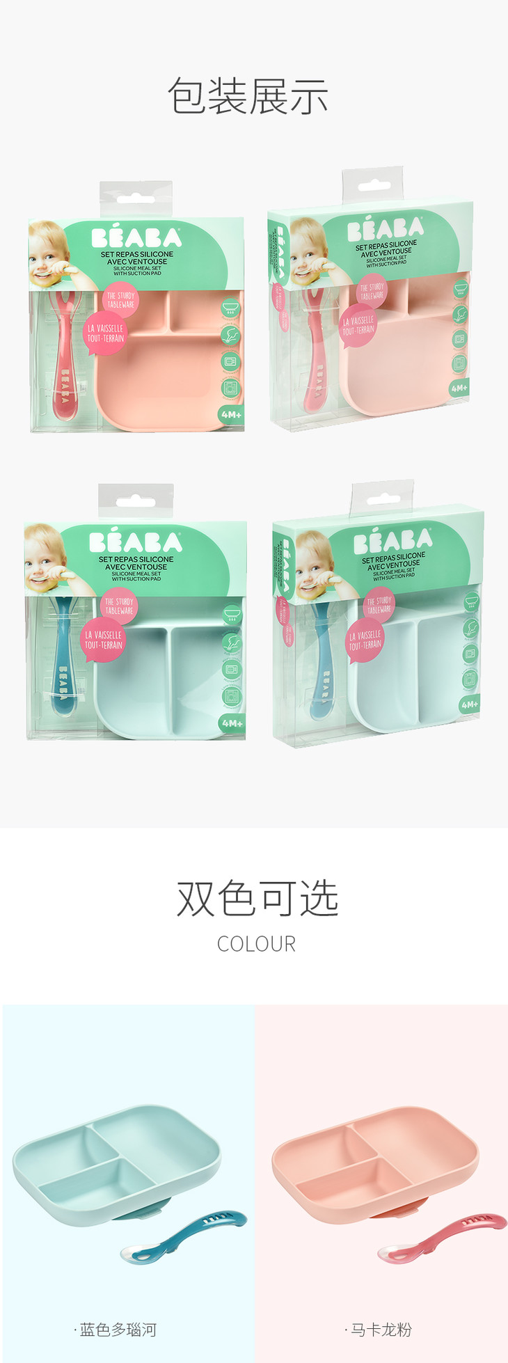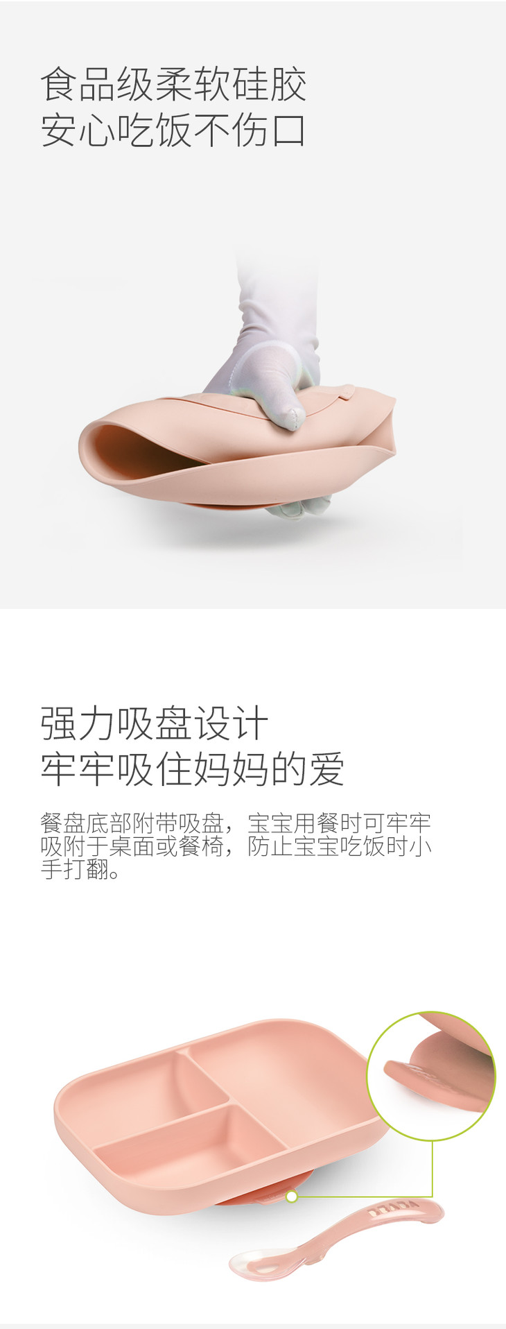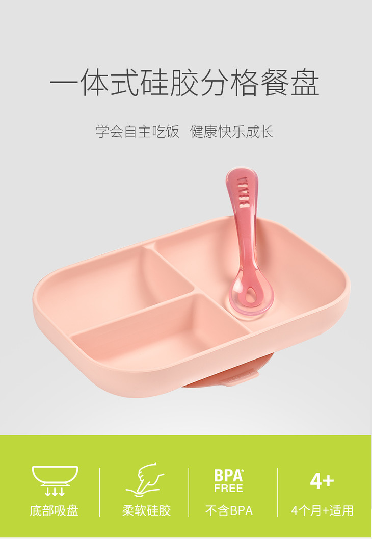 法国Beaba 硅胶餐具套装 硅胶分隔餐盘+勺子 婴儿辅食碗硅胶吸盘碗勺儿童餐具