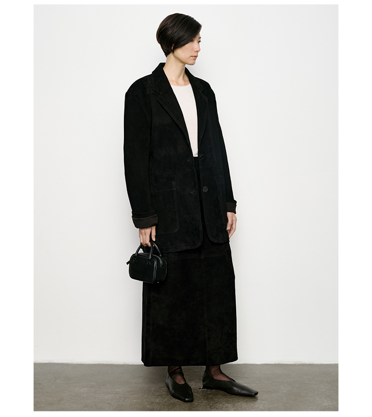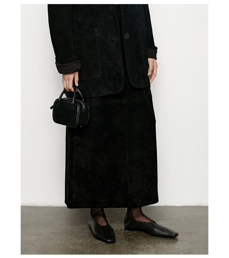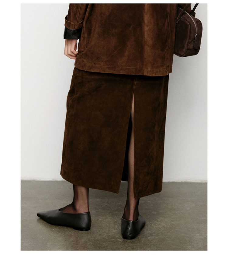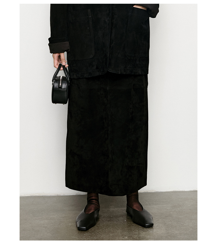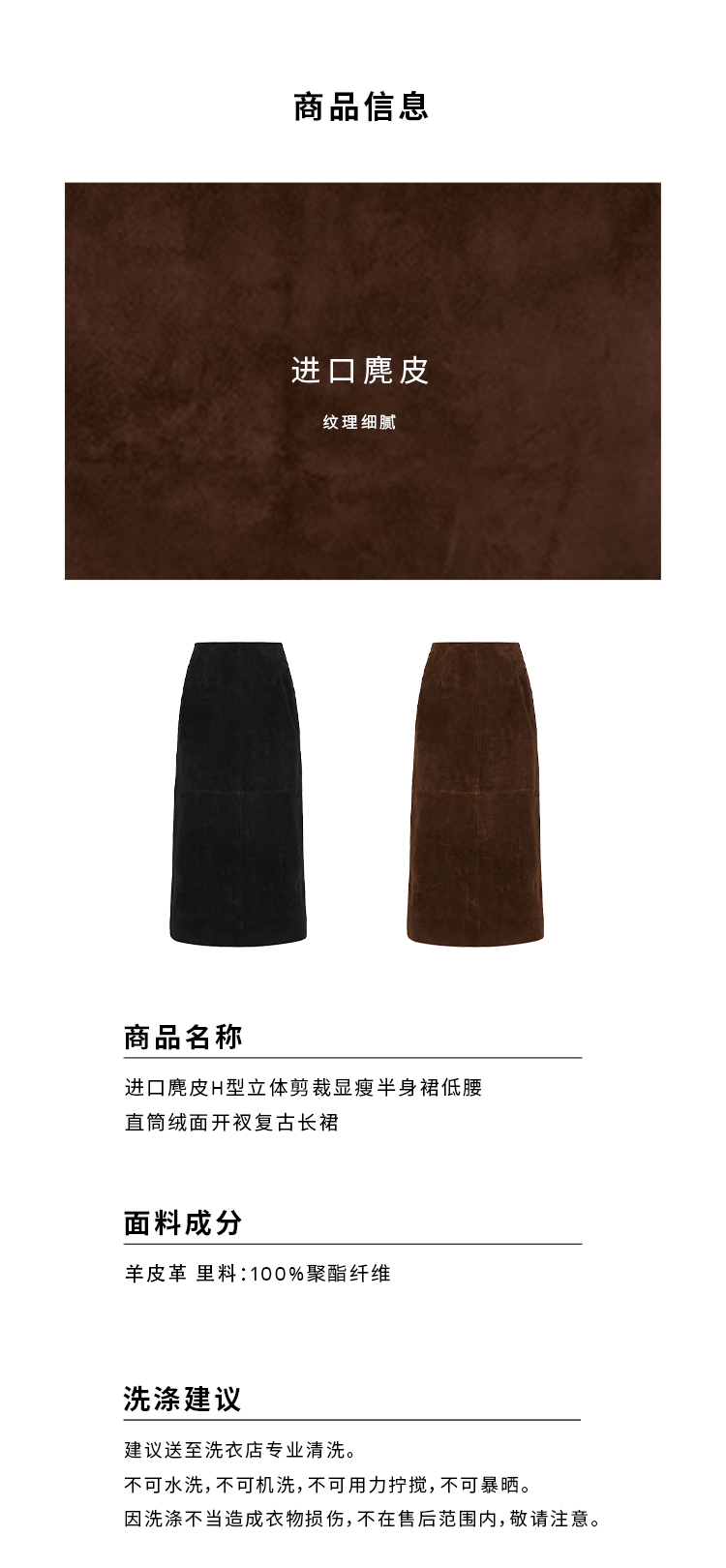 HIDEMI进口麂皮H型立体剪裁显瘦半身裙低腰皮裙绒面开衩复古长裙