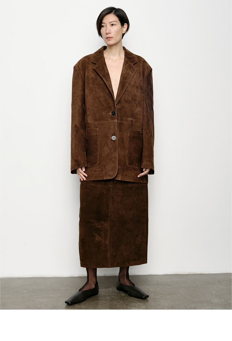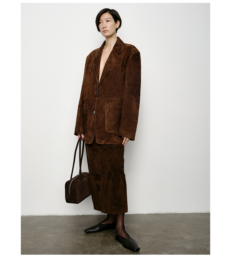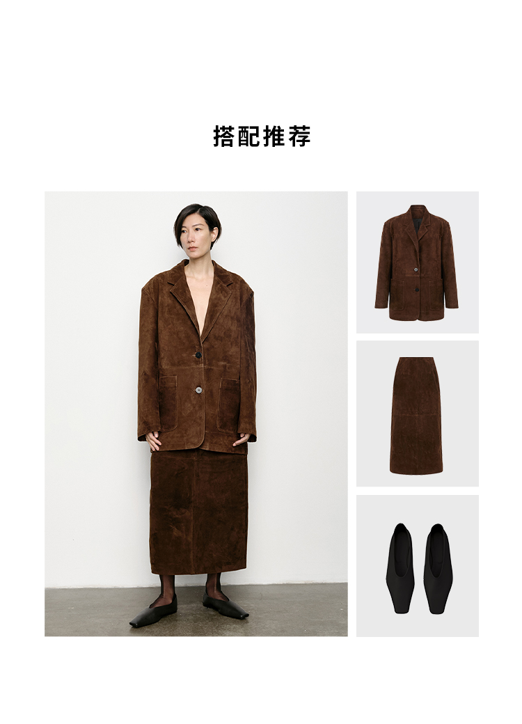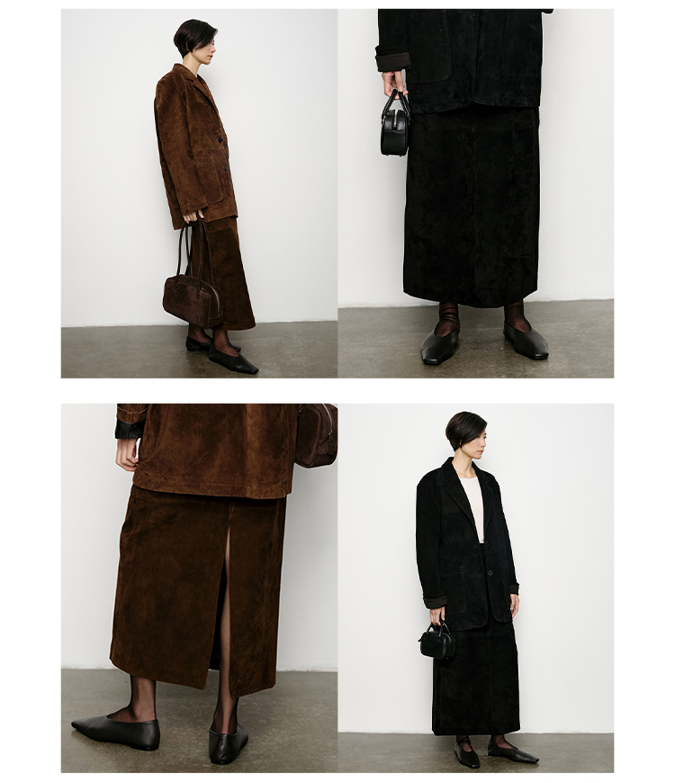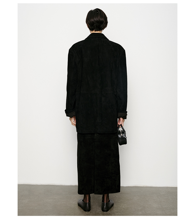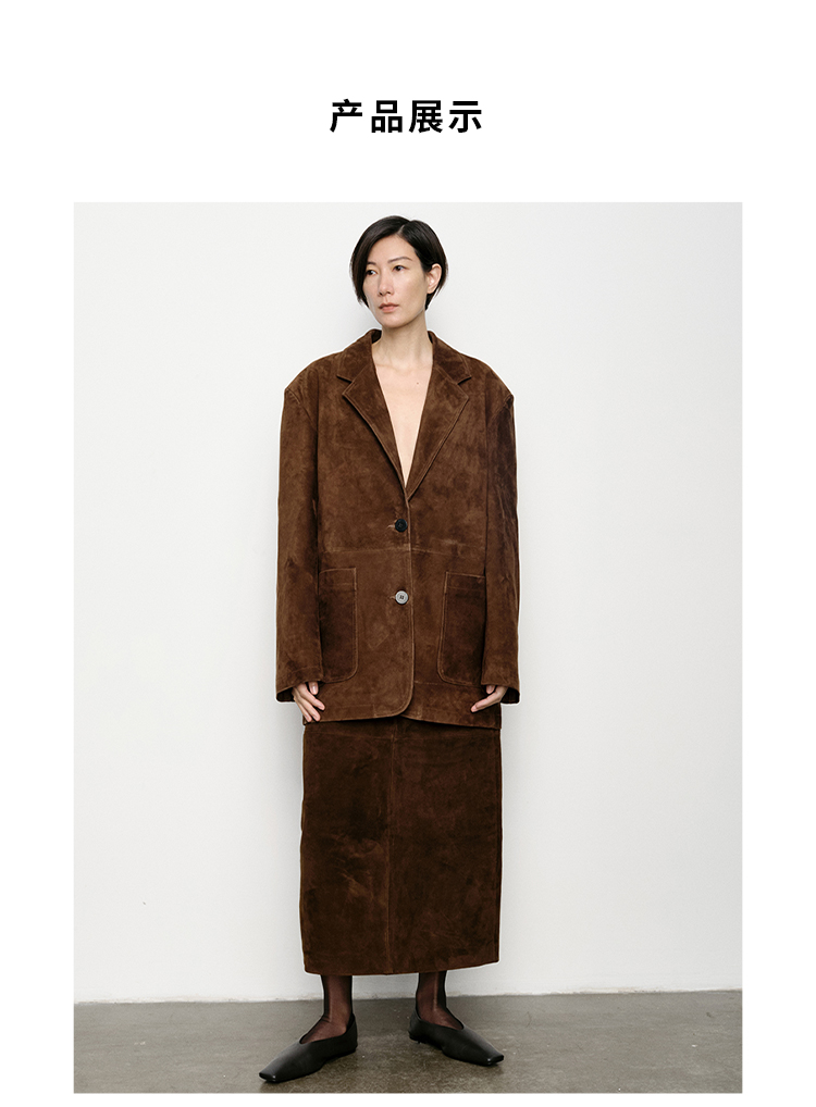 HIDEMI进口麂皮H型立体剪裁显瘦半身裙低腰皮裙绒面开衩复古长裙
