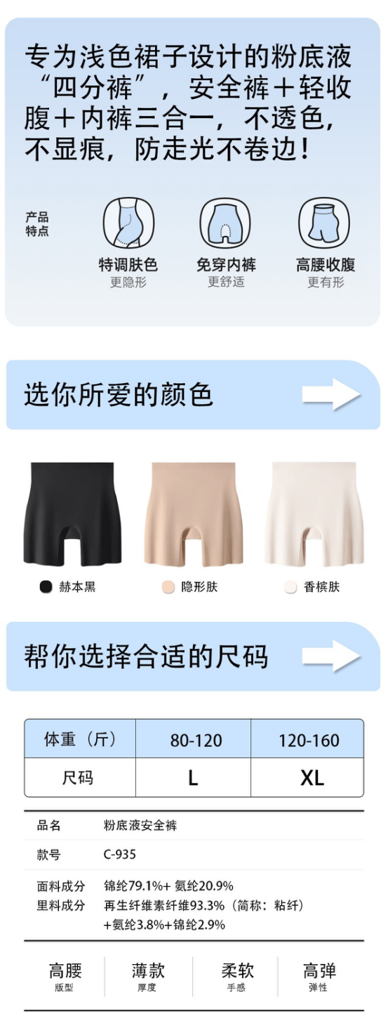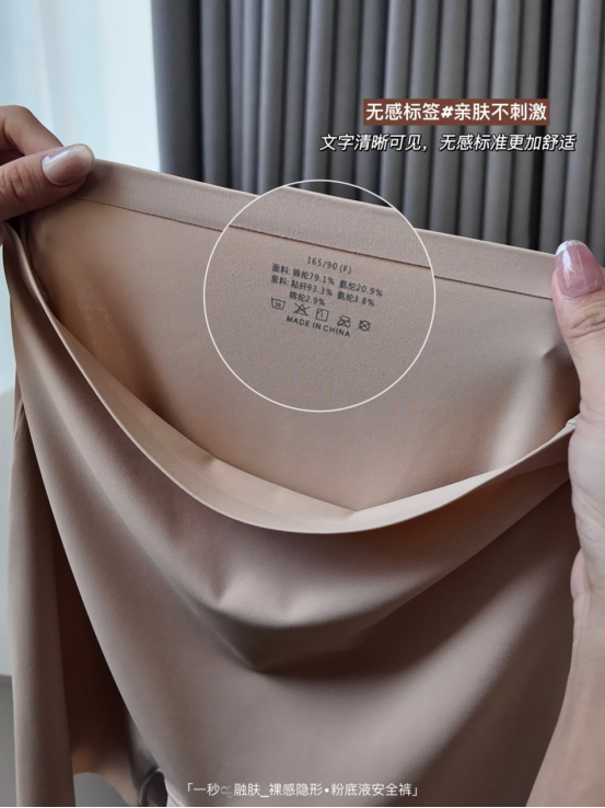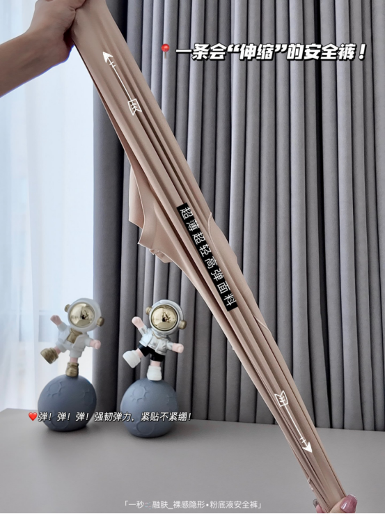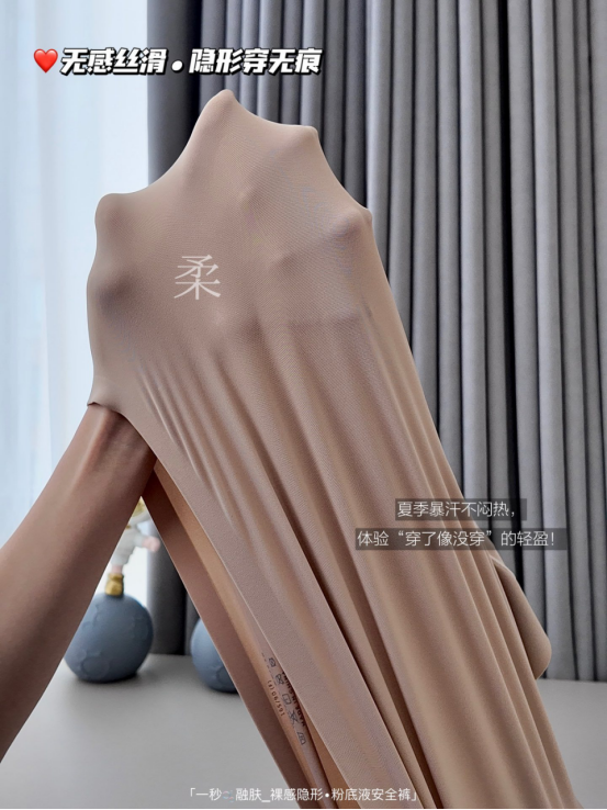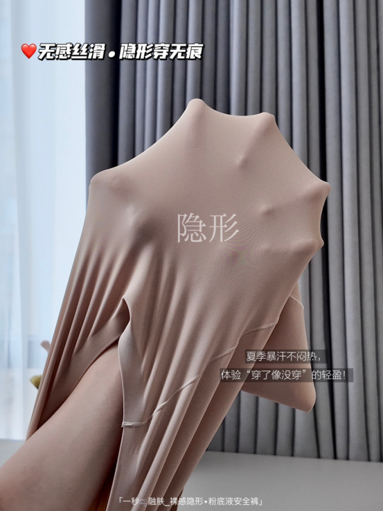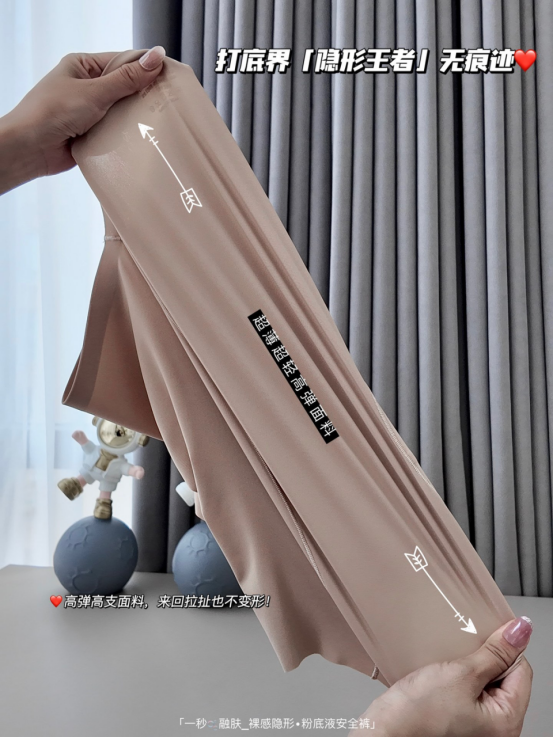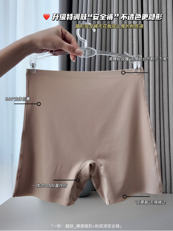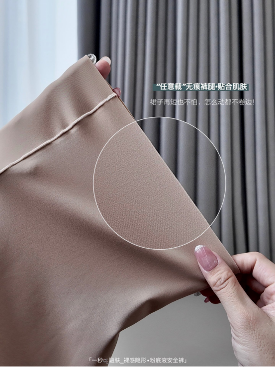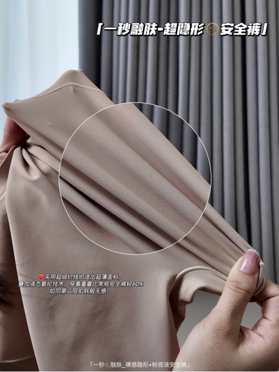 🔥真的真的很隐形,✅ 粉底液安全裤 裸肌无痕,透装救星,解决浅色衣物透出内裤尴尬! 🎬2⃣️材质:80%锦纶+20%氨纶配比打造「冰皮奶肌」触感 接触皮肤瞬间降温,超细纱线织造出“奶皮肌”般超薄面料 叠加液态氨纶🫧技术,穿着重量比常规安全裤轻60%,✅如同第二层肌肤般无感!