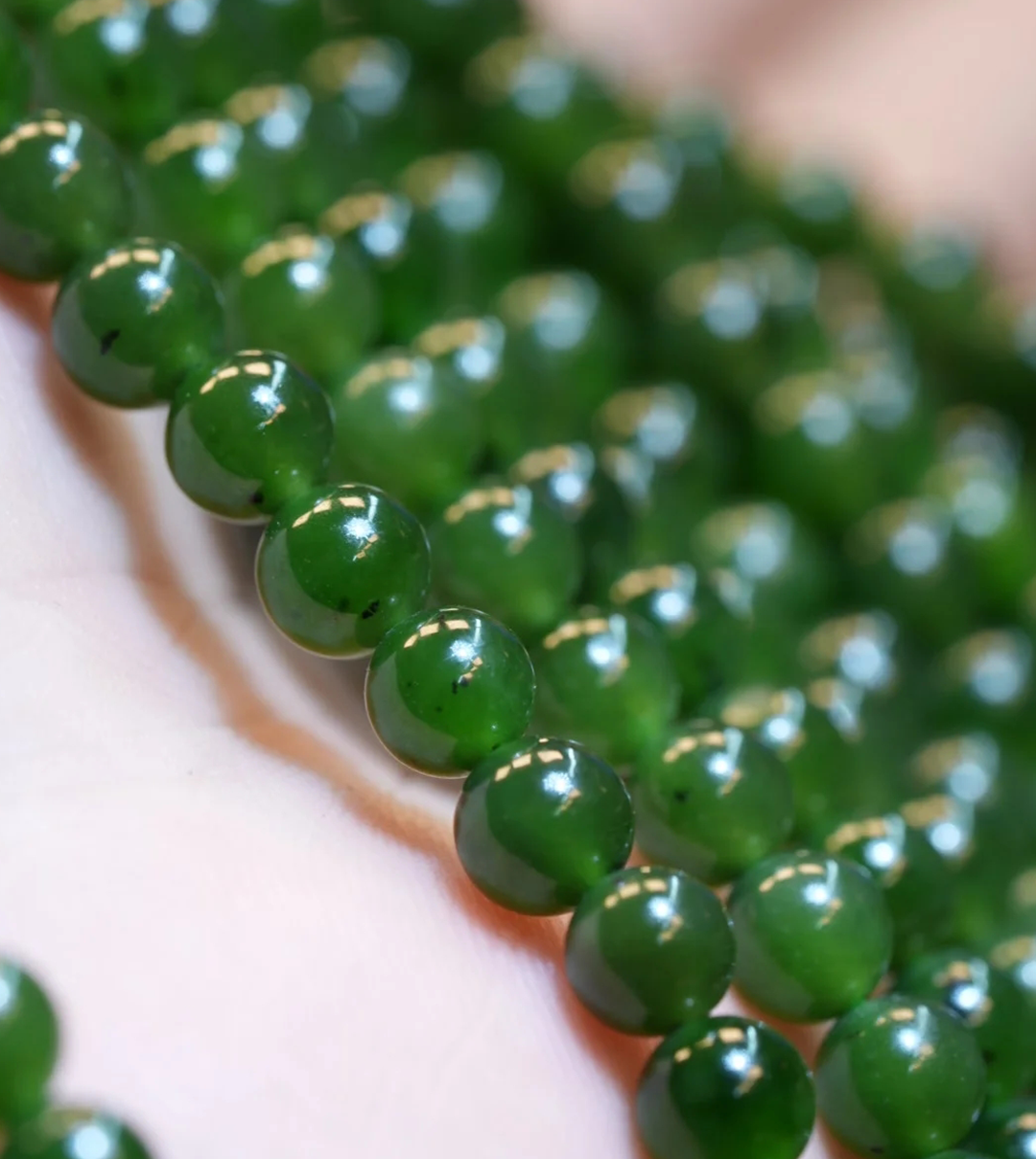 那玉色浓郁深邃,玉质细腻均匀,给人成熟稳定之感;磨成珠子,通体油润中透着玻璃光泽,带着清丽的瓷感,温润纯净,含蓄静雅,实属难得上等佳品。