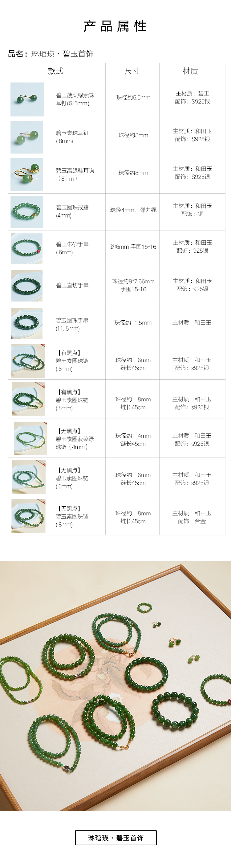 我们甄选了部分珍藏级无矿点的碧玉项链和耳钉首饰,颗颗经得起推敲琢磨,没有裂痕;干净澄澈,看不出黑色矿点。