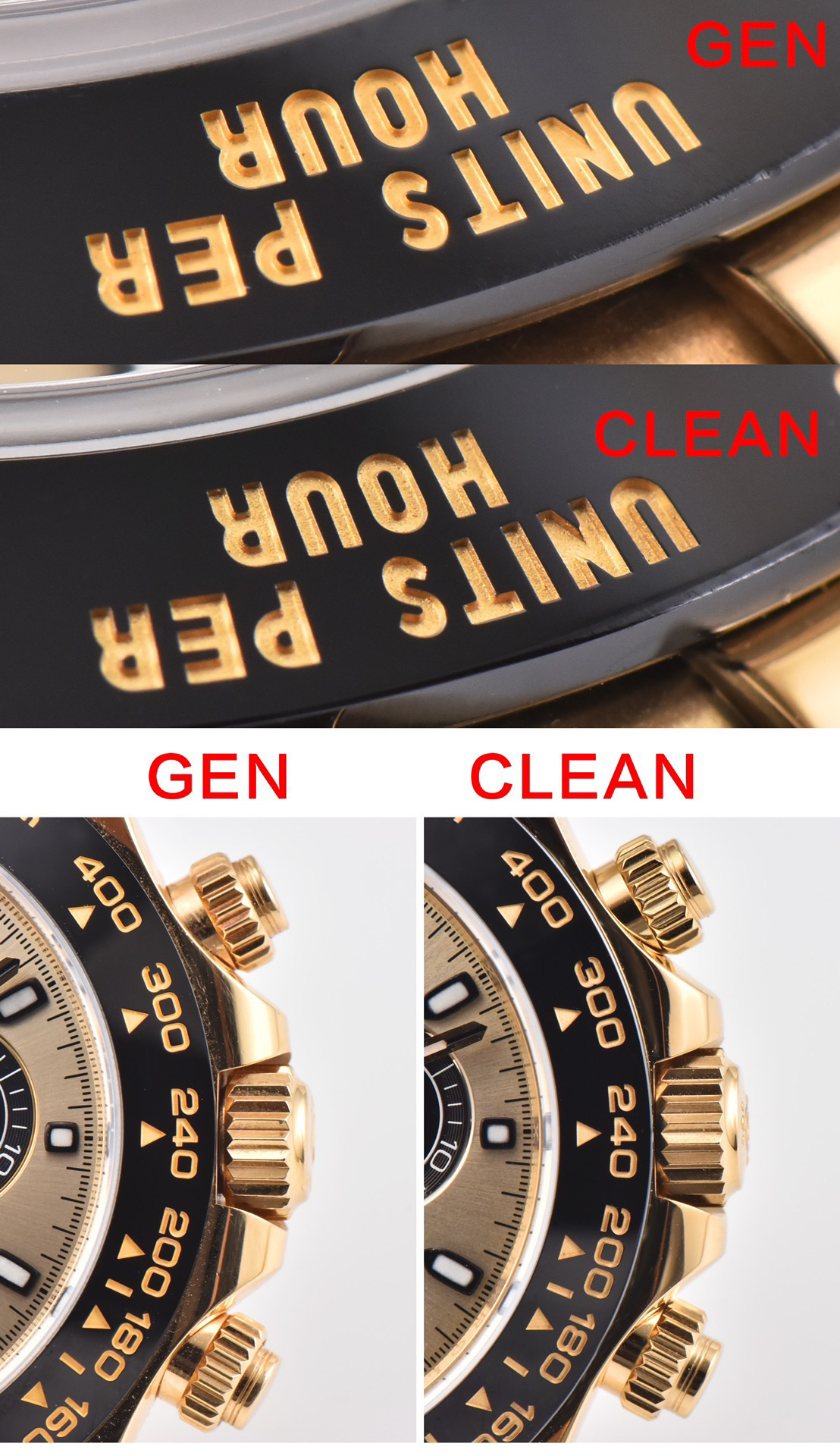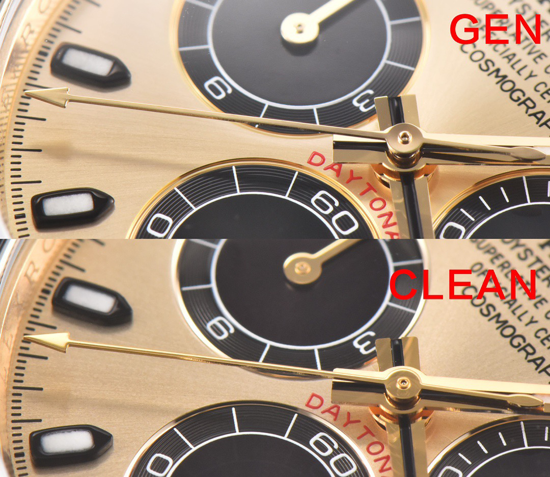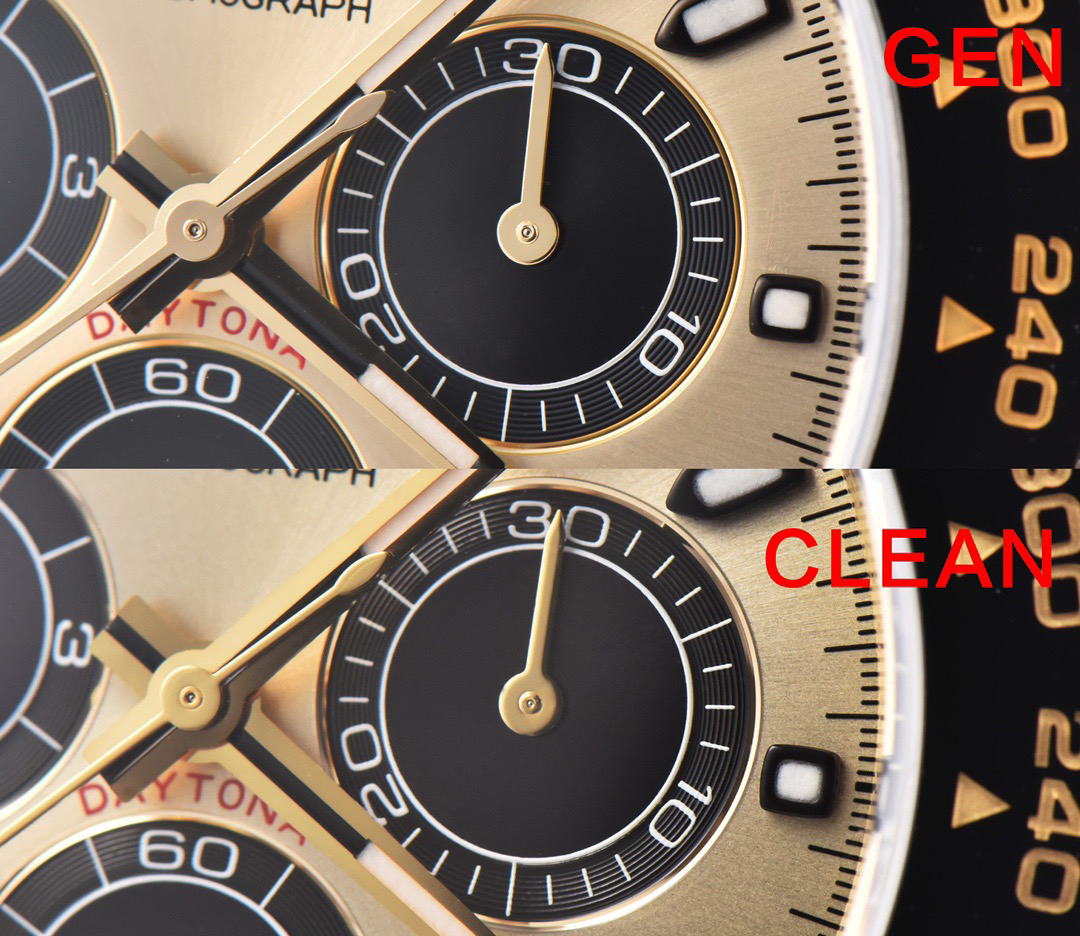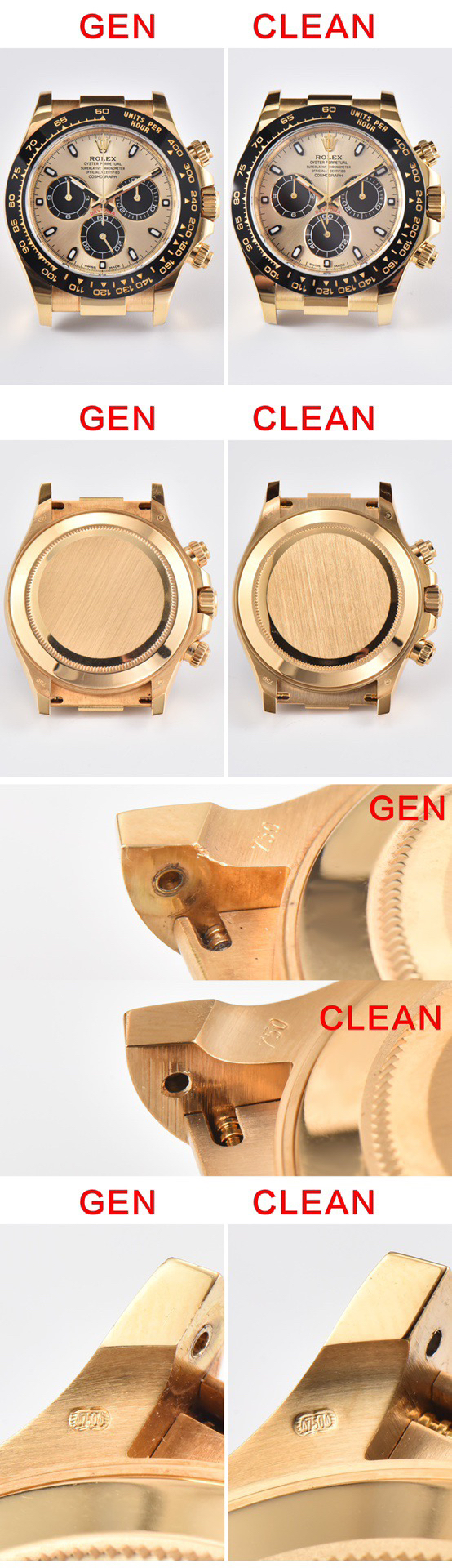 热门的 黄金余文乐胶带迪通拿 本次116519特点 1: 购买两只同款水泥灰迪通拿开模 一只拆散抄数,另外一只备用,这个白金熊猫的数字刻度工艺异常复杂所以成本非常之高 3:字钉全面升级,平面位置做的足够平,侧面位置保留圆角,完全跟足原装。 4:玻璃问题,原装玻璃并非高透,因为是平面玻璃所以非常容易粘指纹。所以玻璃太透反而显得很假,后续可能会升级成高透玻璃,毕竟客户喜欢,这可能是最后的倔强了吧。 5:表壳因为是贵金属款,所以底面4个角有750/圣伯纳狗头刻印。这个部分这次也是铆足了劲去还原。像不像下方也有详细的对比图。唯一欠缺的是圣伯纳狗头上面有一撮狗毛,目前还无法做到。这也是一个缺憾吧。 6:表壳两侧为单独制作的头粒。相对普通116500钢壳款式,这个地方无疑是增加成本最多的地方,完全拆卸原装 一比一制作。完美互换。 7:胶带部分 使用c厂胶带。并非噱头。下方也有详细对比图。 8:胶带扣部分 依旧使用ar表扣。开合手感以及细节同钢带一致。 c厂做东西出奇的慢,但是我们是在用心的做好每一个配件,不会照着官方彩图依葫芦画瓢。包括本次也只计划出水泥灰这一个款式。因为后面每出一个配色都会附上真假对比图来显示对于迪通拿这个款式的慎重。希望大家可以耐心等待。因为后面的款式 款款皆为精品。包括单价也会比同行高处一些,仁者见仁智者见智吧。希望各位表友在选择产品的时候 可以买到最中意的那只表,即便不是c厂出品。
