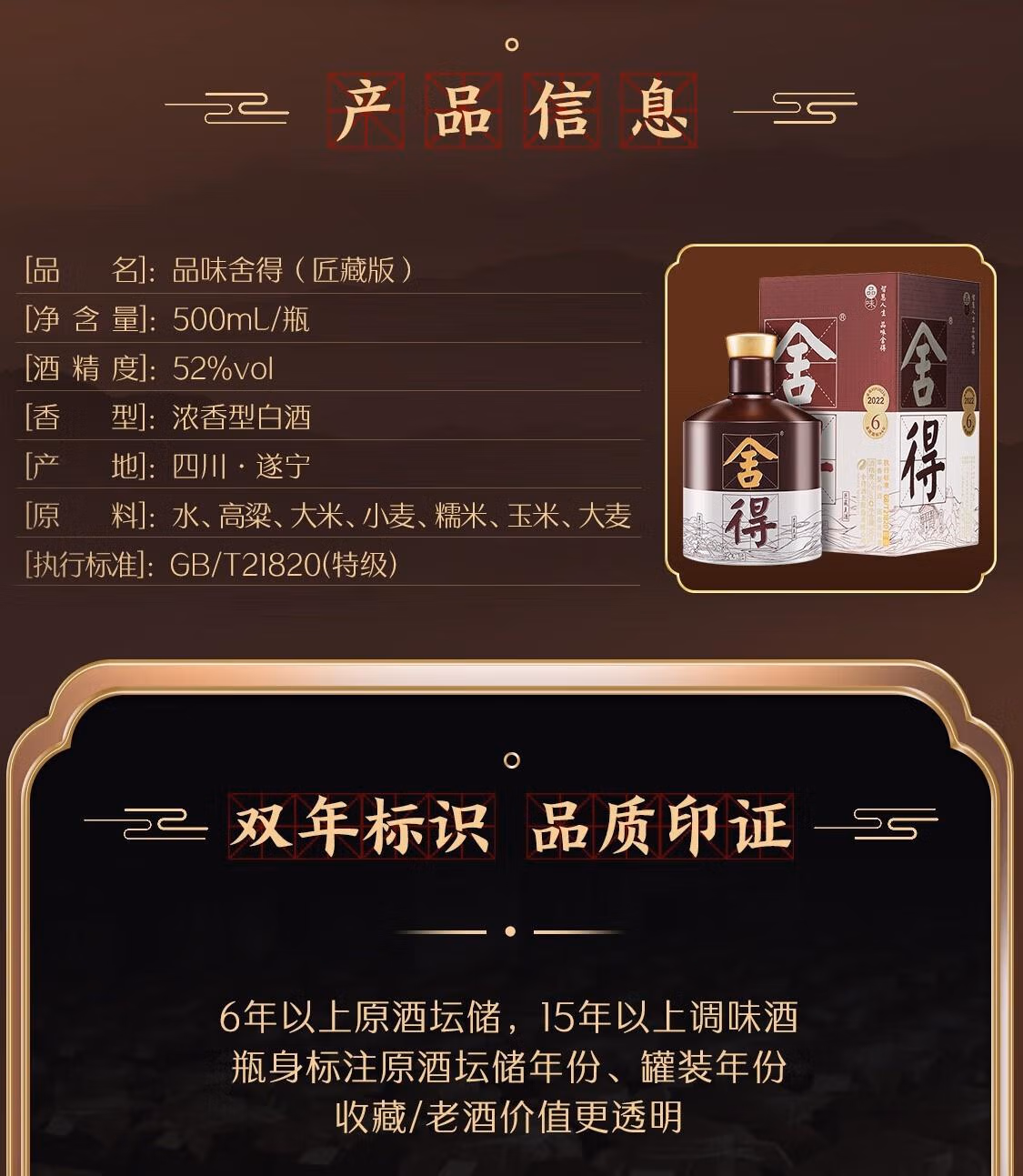 沱牌 品味舍得(匠藏版) 浓香型白酒 52度 500ml*1瓶/6瓶整箱